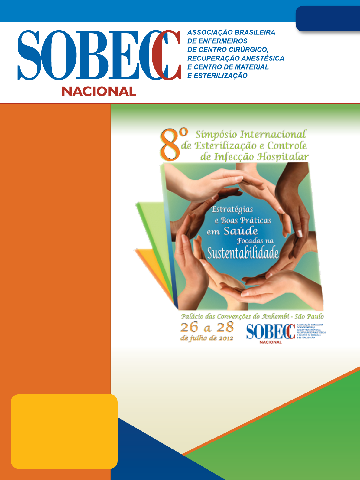 Ano 17, no 1, jan./mar. 2012 – www.sobecc.org.br – ISSN 14144425 Em revista pediatria Conheça as dificuldades da Assistência de Enfermagem ao Paciente Pediátrico no Pós-Operatório Imediato segurança Estudo identifica os eventos adversos decorrentes do posicionamento cirúrgico em clientes submetidos à cirurgia de quadril infecção Parte dos profissionais deixa a desejar em relação às precauções mínimas necessárias para prevenção de infecção hospitalar transplante Atuação da equipe de Enfermagem que trabalha no Centro Cirúrgico (CC) na retirada de múltiplos órgãos para transplante educação Levantamento da satisfação dos pacientes quanto ao manual de orientação pré e pós-cirurgia cardíaca E mais: Hospital em foco: O Centro Cirúrgico do Hospital Samaritano São Paulo Agenda: Congressos, Simpósios e Cursos. Tudo isso e muito mais Além de discutir sobre sustentabilidade, os inscritos vão conhecer as mais recentes evidências científicas e metodologias internacionais para a redução da infecção hospitalar no perioperatório Inscreva seu trabalho e concorra a prêmios Você pode inscrever seu trabalho no Simpósio Internacional no período de 2 de abril a 30 de maio. Os melhores artigos sobre esterilização e controle de infecção hospitalar recebem prêmios 4••• EDITORIAL 5••• AgEnDA 7 ••• AcOnTEcE 9 ••• HOspITAL Em fOcO 11 ••• 8º sImpósIO InTERnAcIOnAL DE EsTERILIzAçãO E cOnTROLE DE InfEcçãO HOspITALAR 20 ••• ARTIgO ORIgInAL Dificuldades da Assistência de Enfermagem ao Paciente Pediátrico no Pós-Operatório Imediato 27 ••• REvIsãO DE LITERATuRA Posicionamento Cirúrgico de Clientes Submetidos à Cirurgia de Quadril: Eventos Adversos 35 ••• ARTIgO ORIgInAL Prevenção de Infecção Hospitalar pela Equipe Cirúrgica de um Hospital de Ensino 45••• ARTIgO ORIgInAL Retirada de Múltiplos Órgãos para Transplante: Olhar do Enfermeiro 54 ARTIgO ORIgInAL Satisfação dos Pacientes Quanto ao Manual de Orientação Pré e Pós-Cirurgia Cardíaca 61••• normas de publicação da Revista sOBEcc Diretoria da sOBEcc - gestão 2011 - 2013 • presidente: Janete Akamine • vice-presidente: Márcia Hitomi Takeiti • primeira-secretária: Liraine Laura Farah • segunda-secretária: Andrea Alfaya Acunã • primeira-tesoureira: Simone Batista Neto Arza • segunda- tesoureira: Zuleica Fazoni Souza • Diretora da comissão de Assistência: Maria Lúcia Suriano • membros da comissão de Assistência: Mariângela Belmonte Ribeiro e Giovana Abrahão de Araújo Moriya • Diretora da comissão de Educação: Márcia Cristina Pereira • membros da comissão de Educação: Aparecida de Cássia Giani Peniche e Tânia Regina Zeni • Diretora da comissão de publicação e Divulgação: Rachel de Carvalho • membros da comissão de publicação e Divulgação: Raquel Machado Cavalca Coutinho e Eliane da Silva Grazziano • Diretor do conselho fiscal: Ernane de Sousa Almeida • membros do conselho fiscal: Kátia Aparecida Ferreira de Almeida e Mara Lúcia Leite Ribeiro • Diretora de comissão e Eventos Regionais: Lígia Garrido Calicchio. Revista sOBEcc Órgão oficial da Associação Brasileira de Enfermeiros de Centro Cirúrgico, Recuperação Anestésica e centro de material e Esterilização. comissão de publicação e Divulgação: Diretora: Dra Rachel de Carvalho (Faculdade de Enfermagem do Hospital Israelita Albert Einstein – FEHIAE) • membros: Dra Eliane da Silva Grazziano (Universidade Federal de São Carlos – UFSCAR) e Dra Raquel Machado Cavalca Coutinho (Universidade Paulista – UNIP). conselho Editorial: Dra Ana Lúcia de Mattia (Universidade Federal de Minas Gerais – UFMG), Dra Aparecida de Cássia Giani Peniche (Escola de Enfermagem da USP), Ms Dulcilene Pereira Jardim (Universidade Santo Amaro – UNISA), Dra Eliane da Silva Grazziano (Universidade Federal de São Carlos – UFSCAR), Dra Estela Regina Ferraz Bianchi (Escola de Enfermagem da USP), Especialista Isabel Cristina Dauth (Universidade Luterana do Brasil – ULBRA), Ms Jacqueline Ramos de Andrade Antunes Gomes (Centro Universitário de Brasília – UniCEUB), Ms Márcia Wanderley de Moraes (Faculdade de Enfermagem do Hospital Israelita Albert Einstein – FEHIAE), Dra Maria Belén Salazar Posso (Faculdade de Enfermagem da Fundação ABC), Dra Maria Clara Padovezze (Escola de Enfermagem da USP), Dra Maria Concepcion Pezo Silva (Universidade Nacional Pedro Ruiz Gallo – Peru), Dra Maria Helena Barbosa (Universidade Federal do Triângulo Mineiro – UFTM), Dra Maria Isabel Pedreira de Freitas (Universidade Estadual de Campinas – UNICAMP), Dra Maria Lúcia Suriano (Universidade Federal de São Paulo – UNIFESP), Dra Rachel de Carvalho (Faculdade de Enfermagem do Hospital Israelita Albert Einstein – FEHIAE), Dra Raquel Machado Cavalca Coutinho (Universidade Paulista – UNIP), Dra Rita Catalina Aquino Caregnato (Universidade Luterana do Brasil – ULBRA) e Ms Verônica Cecília Calbo de Medeiros (Centro Universitário São Camilo). Equipe Técnica – Edição: Marcelo de Andrade • coordenação: Sirlene Aparecida Negri Glasenapp • Administração: Veridiana Pellegrini Franco • secretária: Maria Elizabeth Jorgetti • Bibliotecária: Sônia Maria Gardim • Revisão de Espanhol: Drª Maria Belén Salazar Posso • Revisão de Inglês: Elaine Koda • produção Gráfica: Solange Mattenhauer Candido • Tiragem: 4.000 exemplares • Impressão: Editora Referência Ltda. sOBEcc: Rua Vergueiro, 875, cj. 64, Liberdade (metrô Vergueiro), CEP 01504-001, São Paulo, SP • CGC: 67.185.215/0001-03 • Tel.: (11) 3341-4044 • Fax: (11) 2501-4244. E-mail: sobecc@sobecc.org.br | site: www.sobecc.org.br Os artigos assinados são de responsabilidade dos autores. A SOBECC está associada à Academia Brasileira de Especialistas de Enfermagem (ABESE) desde 2000, à International Federation Perioperative Nurses (IFPN)