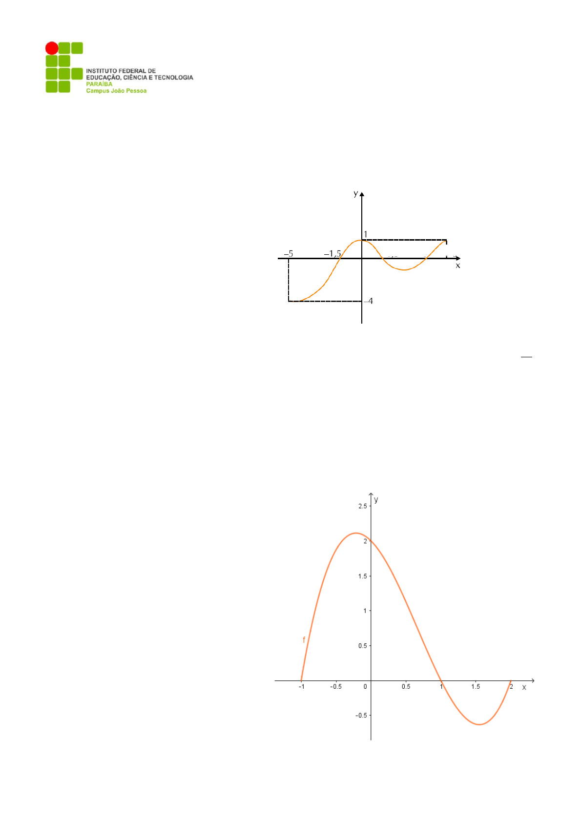 Exercícios de Avaliação 3ª Semana – Funções 1. Somente uma afirmação feita sobre a função f: [-5,5] em R, representada abaixo, é verdadeira. Assinale-a. 2. (UFMG) Em uma experiência realizada com camundongos, foi observado que o tempo requerido para um camundongo percorrer um labirinto, na n-ésima tentativa, era dado pela função n nf 12 3)( minutos. Com relação a essa experiência, pode-se afirmar que um camundongo: a) consegue percorrer o labirinto em menos que 3 minutos. b) gasta cinco minutos e 40 segundos para percorrer o labirinto na quinta tentativa. c) gasta oito minutos para percorrer o labirinto na terceira tentativa. d) percorre o labirinto em quatro minutos na décima tentativa. e) percorre o labirinto, numa das tentativas, em três minutos e 30 segundos. 3. Com relação ao gráfico da função f:[-1,2]→R, representado abaixo, é correto afirmar que: a) f(0) = 1; b) O sinal de f é positivo no intervalo ]1,2]; c) O sinal de f é negativo no intervalo [0,2]; d) O sinal de f é positivo no intervalo [-1,1]; e) f é uma função crescente em todos os pontos do seu domínio. a) f(x) ≤ 0, para todo x [1,5; 4]. b) f é crescente no intervalo [0,5]. c) f(4) > f (1,5). d) f tem apenas duas raízes reais. e) f(x) > 0, para todo x [–5;0]. 1,5 4 5 4. Observe o gráfico da função f representada abaixo e identifique a alternativa correta com relação a ele. a) O ponto de Máximo da função é o ponto B; b) O ponto de Máximo é o ponto A e o ponto de Mínimo é B; c) A função não possui pontos de Máximo e Mínimo; d) Os pontos A e B são ambos pontos de Mínimo; e) Os pontos A e B são ambos pontos de Máximo; 5. (IFRS/2017/Janeiro-Modificada) Suponha que o imposto de renda seja calculado da seguinte forma: alíquota é zero para ganhos mensais de até R$ 1.903,98. Alíquota é 7,5% para ganhos mensais entre R$ 1903,99 e R$ 2.826,65 e assim sucessivamente, conforme tabela abaixo O gráfico que melhor expressa as alíquotas (eixo y) em função da renda mensal (eixo x) é Bons Estudos!