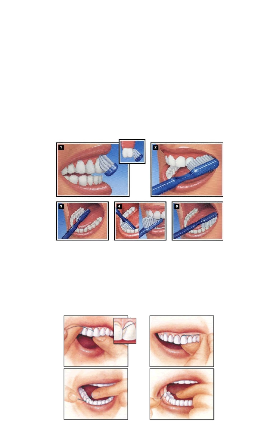 Técnicas de escovação e uso correto do fio dental Lana Cardoso Silva Sagica 1° PASSO: Comece com as superfícies exteriores e interiores, escovando em um ângulo de 45 graus com movimentos pequenos circulares e envolvendo meio dente por vez, seguindo a linha da gengiva. Não deixe de alcançar seus dentes do fundo. 2° PASSO: Passe para as superfícies de mastigação. Segure a escova em uma posição horizontal e escove para frente e para trás pelas superfícies. 3° PASSO: Ao chegar nas superfícies interiores dos seus dentes frontais, gire a escova no sentido vertical e use movimentos suaves para cima e para baixo com a ponta da escova. 4° PASSO: Não deixe de escovar suavemente a linha da gengiva. 5° PASSO: Escove sua língua em movimentos de varredura de trás para a frente, para remover partículas de alimentos e ajudar a remover bactérias que causam odores, assegurando um hálito fresco. Técnica adequada de uso do fio dental · Use cerca de 45 centímetros de fio dental, para ter um pedaço limpo de fio dental para usar em cada dente durante o processo de limpeza. · Dobre o fio dental no formato da letra C e deslize de cima para baixo nas laterais de cada dente. · Não se esqueça de passar o fio dental nas partes de trás dos seus dentes do fundo, nos lados esquerdo e direito, em cima e em baixo.