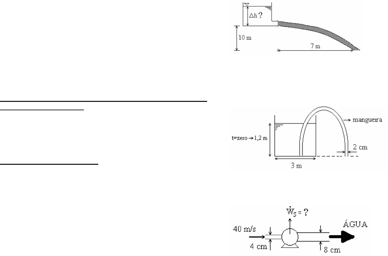 1 Lista 4 de exercícios complementares Fenômenos de transporte 4 Exercícios sobre balanço de energia (“conservação da energia”) DICA: Observe que o balanço de massa é frequentemente utilizado em conjunto com o balanço de energia, como suporte para, por exemplo, relacionar vazões e velocidades. Exercícios do livro Potter & Wiggert, 2004 (Mecânica dos fluídos, editora Thomson). - Equação da energia: 4.66; 4.65; 4.64; 4.67; 4.69; 4.70; 4.71; 4.72; 4.73 (observe que podemos usar o manômetro no dispositivo indicado, conhecido como Venturi, para medirmos a vazão que passa em uma tubulação). Demais exercícios selecionados 1 – O tanque mostrado na figura que segue lança água a 7 m de distância. Se as perdas por atrito e a resistência do ar são desprezíveis, calcular o nível de água dentro do tanque. Lembrar que o espaço vertical percorrido por um corpo em queda livre é dado por: y = y0 – uy0t - gt 2/2 2 – Água está sendo drenada de um tanque cilíndrico, aberto, de 3 m de diâmetro por uma mangueira de 2 cm de diâmetro de acordo com a figura que segue. Calcular o tempo necessário para que toda a água escoe, desprezando-se as perdas por atrito e o volume da mangueira. É possível diminuir esse tempo? Explique. 3 - A bomba mostrada na figura que segue opera com 85% de eficiência. Se a diferença de pressão entre a descarga e a sucção da bomba é de 800 kPa, calcule sua potência. 2 4 – Uma turbina com eficiência de 87%, recebe 2 m3/s de água de uma tubulação de 50 cm de diâmetro. A queda de pressão é de 600 kPa. Qual a potência da turbina? e a velocidade na saída da turbina é desprezível. 5 – Água escoa a partir de um reservatório de grandes dimensões (da esquerda para a direita) no circuito hidráulico apresentado na figura abaixo. A velocidade de saída do sistema (depois do manômetro) é de 9m/s e o diâmetro da tubulação ali é 15cm. (a) Como estimativa inicial, despreze todas as perdas de energia mecânica por atrito e avalie a potência da máquina hidráulica. (b) Avalie se a máquina hidráulica em questão é uma máquina geratriz ou motriz (bomba). 6 – Para se bombear água de um lago à uma caixa d’água conforme a figura que segue, à vazão de 400 kg/min, utiliza-se uma bomba de 4 HP com 90% de eficiência. Calcular a potência requerida (em HP) para se dobrar a vazão, sabendo-se que a perda de carga na tubulação é calculada pela equação: hL = C0V 2L/g, sendo C0 uma constante que depende do tipo de tubo (em m-1), V2 a velocidade média do fluído na tubulação e L o comprimento percorrido no sistema de tubulações (em m). Considerar níveis constantes nos reservatórios e que o diâmetro de toda a tubulação (seja na sucção ou recalque) é 10 cm. Além disso, para resolução, despreze a perda de carga em acidentes (perdas singulares). Dado: ρ=103 kg/m3, g=9,8 m/s2, 1HP=745 watts.
