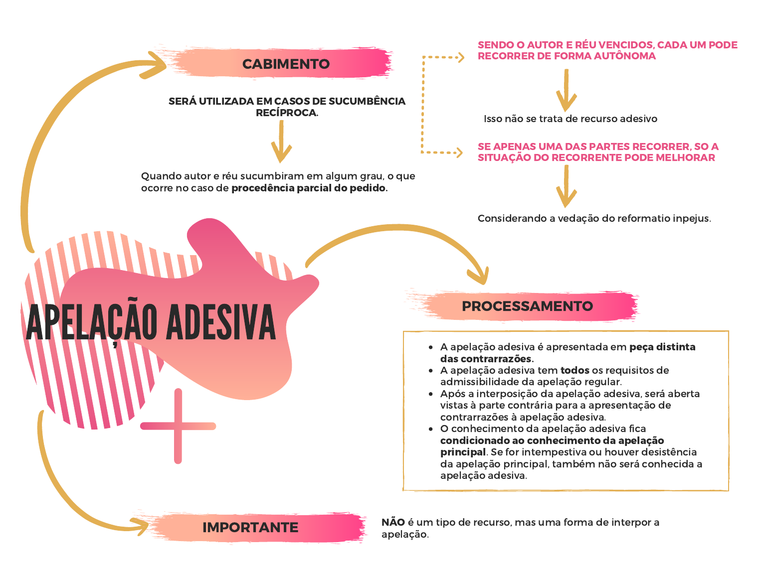 SE APENAS UMA DAS PARTES RECORRER, SO A SITUAÇÃO DO RECORRENTE PODE MELHORAR APELAÇÃO ADESIVA A apelação adesiva é apresentada em peça distinta das contrarrazões. A apelação adesiva tem todos os requisitos de admissibilidade da apelação regular. Após a interposição da apelação adesiva, será aberta vistas à parte contrária para a apresentação de contrarrazões à apelação adesiva. O conhecimento da apelação adesiva fica condicionado ao conhecimento da apelação principal. Se for intempestiva ou houver desistência da apelação principal, também não será conhecida a apelação adesiva. CABIMENTO SENDO O AUTOR E RÉU VENCIDOS, CADA UM PODE RECORRER DE FORMA AUTÔNOMA SERÁ UTILIZADA EM CASOS DE SUCUMBÊNCIA RECÍPROCA. Quando autor e réu sucumbiram em algum grau, o que ocorre no caso de procedência parcial do pedido. Isso não se trata de recurso adesivo Considerando a vedação do reformatio inpejus. PROCESSAMENTO IMPORTANTE NÃO é um tipo de recurso, mas uma forma de interpor a apelação.