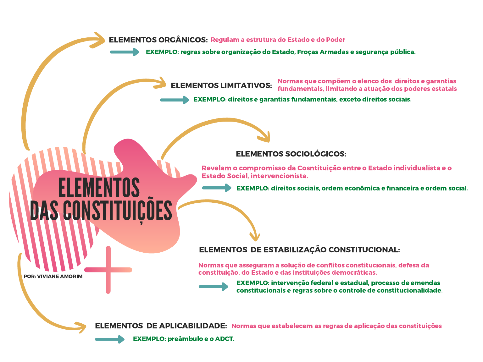 ELEMENTOS DAS CONSTITUIÇÕES POR: VIVIANE AMORIM ELEMENTOS ORGÂNICOS: ELEMENTOS LIMITATIVOS: Normas que asseguram a solução de conflitos constitucionais, defesa da constituição, do Estado e das instituições democráticas. Regulam a estrutura do Estado e do Poder Normas que compõem o elenco dos direitos e garantias fundamentais, limitando a atuação dos poderes estatais ELEMENTOS SOCIOLÓGICOS: Revelam o compromisso da Cosntituição entre o Estado individualista e o Estado Social, intervencionista. ELEMENTOS DE ESTABILIZAÇÃO CONSTITUCIONAL: ELEMENTOS DE APLICABILIDADE: Normas que estabelecem as regras de aplicação das constituições EXEMPLO: regras sobre organização do Estado, Froças Armadas e segurança pública. EXEMPLO: direitos e garantias fundamentais, exceto direitos sociais. EXEMPLO: direitos sociais, ordem econômica e financeira e ordem social. EXEMPLO: intervenção federal e estadual, processo de emendas constitucionais e regras sobre o controle de constitucionalidade. EXEMPLO: preâmbulo e o ADCT.