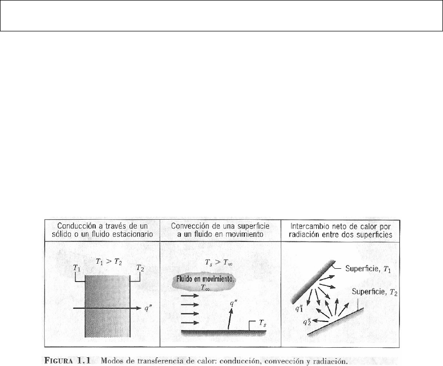 - 19 - Introducción Del estudio de la termodinámica usted aprendió que la energía se puede transferir mediante las interacciones de un sistema con su alrededor. Estas interacciones se denominan trabajo y calor. Sin embargo, la termodinámica trata de los estados finales del proceso durante el cual ocurre una interacción y no proporciona información alguna con respecto a la naturaleza de esta interacción o la rapidez con la que ésta se produce. El objetivo de este texto es ampliar el análisis termodinámico a través del estudio de los modos de transferencia de calor y por medio del desarrollo de relaciones matemáticas para calcular velocidades de transferencia de calor. En este capítulo senta- mos las bases de gran parte del material que se trata en el texto. Lo hacemos formulando varias preguntas. ¿Qué es la transferencia de calor? ¿Cómo se transfiere éste? ¿Por qué es importante su estudio? Al contestar a estas preguntas, comenzaremos a valorar los mecanismos físicos que son el fundamento de los procesos de transferencia de calor y la relevancia de estos procesos para los problemas industriales y ambientales. 1.1 ¿Qué y cómo? Una definición sencilla, aunque general, da respuesta suficiente a la pregun- ta: ¿Qué es la transferencia de calor? Transferencia de calor (o calor) es la energía en tránsito debido a una diferencia de temperaturas. Siempre que exista una diferencia de temperaturas en un cuerpo o entre cuerpos, debe ocurrir una transferencia de calor. Según se muestra en la figura 1.1, nos referimos a los diferentes tipos de procesos de transferencia de calor como modos. Cuando existe un gradiente de tempera- tura en un medio estacionario — que puede ser un sólido o un fluido — utilizamos el término conducción para referimos a la transferencia de calor que se producirá a través del medio. En cambio, el término convección se refiere a la transferencia de calor que ocurrirá entre una superficie y un fluido en movimiento cuando están a diferentes tem- peraturas. El tercer modo de transferencia de calor se denomina radiación térmica. To- das las superficies con temperatura finita emiten energía en forma de ondas electromag- néticas. Por tanto, en ausencia de un medio, existe una transferencia neta de calor por radiación entre dos superficies a diferentes temperaturas. 1.2 Orígenes físicos y modelos - 20 - Como ingenieros es importante que entendamos los mecanismos físicos que sirven de base a los modos de transferencia de calor y seamos capaces de usar los modelos que proporcionan la cantidad de energía que se transfiere por unidad de tiempo. 1.2.1 Conducción A la mención de la palabra conducción debemos evocar de inmediato con- ceptos de actividad atómica y molecular, pues hay procesos en estos niveles que susten- tan este modo de transferencia de calor. La conducción se considera como la transferen- cia de energía de las partículas más energéticas a las menos energéticas de una sustancia debido a las interacciones entre las mismas. El mecanismo físico de conducción se explica más fácilmente considerando un gas y usando ideas que le sean familiares, propias de su experiencia en termodinámi- ca. Piense en un gas en el que existe un gradiente de temperatura y suponga que no hay movimiento global. El gas puede ocupar el espacio entre dos superficies que se mantie- nen a diferentes temperaturas, como se muestra en la figura 1.2. Asociamos la tempera- tura en cualquier punto con la energía de las moléculas del gas en la proximidad del punto. Esta energía está relacionada con el movimiento traslacional aleatorio, así como con los movimientos internos de rotación y vibración de las moléculas. Las temperaturas más altas se asocian con las energías moleculares más altas y, cuando las moléculas vecinas chocan, como lo hacen constantemente, debe ocu- rrir una transferencia de energía de las moléculas más energéticas a las menos energéti- cas. En presencia de un gradiente de temperatura, la transferencia de energía por con- ducción debe ocurrir entonces en la dirección de la temperatura decreciente. Esta trans- ferencia es evidente en la figura 1.2. Las moléculas, procedentes de arriba y de abajo, cruzan constantemente el plano hipotético en x0 gracias a su movimiento aleatorio. Sin embargo, las moléculas de arriba están asociadas con una temperatura mayor que la que tienen las de abajo, en cuyo caso debe haber una transferencia neta de energía en la di- rección positiva de x. Se habla de la transferencia neta de energía debida al movimiento molecular aleatorio como una difusión de energía. La situación es muy similar en los líquidos, aunque las moléculas están me- nos espaciadas y las interacciones moleculares son más fuertes y frecuentes. De igual manera, en un sólido, la conducción se atribuye a la actividad atómica en forma de vi- braciones reticulares. El punto de vista moderno es atribuir la transferencia de energía a ondas reticulares inducidas por el movimiento atómico. En un no conductor, la transfe- rencia de energía se da exclusivamente por la vía de estas ondas reticulares; en un con- ductor, la transferencia de energía también se debe al movimiento de traslación de los electrones libres. Las importantes propiedades asociadas con los fenómenos de la con- - 21 - ducción se analizan en el capítulo 2 y en el apéndice A. Los ejemplos de transferencia de calor por conduc- ción son innumerables. El extremo expuesto de una cuchara metálica introducida súbitamente en una taza de café caliente se calentará debido a la conducción de energía a través de la cu- chara. En un día invernal hay una pérdida significativa de ener- gía de una habitación caliente hacia el exterior; esta pérdida se debe principalmente a la transferencia de calor por conducción a través de la pared que separa el aire de la habitación del aire exterior. Es posible cuantificar los procesos de tra