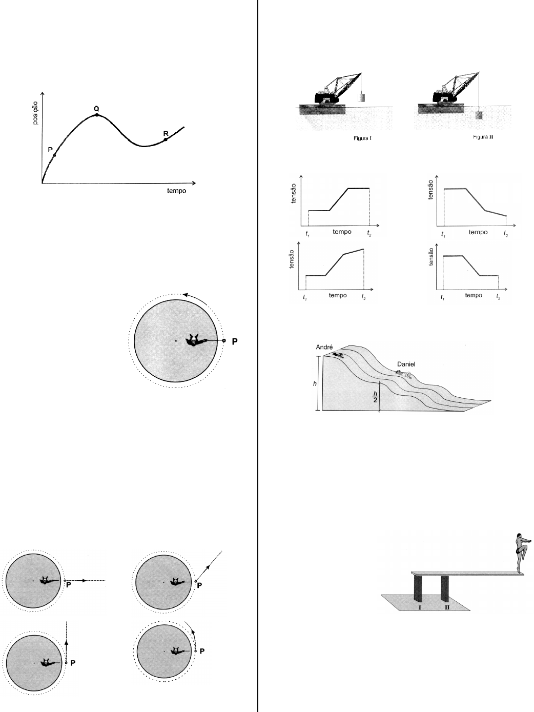 NÚCLEO DE APRENDIZAGEM SUPERINTENSIVO UFMG 2010 FÍSICA www.nucleodeaprendizagem.com.br 1 física PROVA UFMG/2005 01. (UFMG-2005) Um carro está andando ao longo de uma estrada reta e plana. Sua posição em função do tempo está representada neste gráfico: Sejam vP, vQ e vR os módulos das velocidades do carro, respectivamente, nos pontos P, Q e R, indicados nesse gráfico. Com base nessas informações, é CORRETO afirmar que A) vP < vR < vQ B) vQ < vP < vR C) vP < vQ < vR D) vQ < vR < vP INSTRUÇÃO: As questões 02 e 03 devem ser respondidas com base na situação descrita a seguir. Tomás está parado sobre a plataforma de um brinquedo, que gira com velocidade angular constante. Ele segura um barbante, que tem uma pedra presa na outra extremidade, como mostrado nesta figura: A linha tracejada, nessa figura, representa a trajetória da pedra, vista de cima. 02. (UFMG-2005) Observando essa situação, Júlia e Marina chegaram a estas conclusões: • Júlia: "O movimento de Tomás é acelerado." • Marina: "A componente horizontal da força que o piso faz sobre Tomás aponta para o centro da plataforma." Considerando-se essas duas conclusões, é CORRETO afirmar que A) apenas a de Júlia está certa. B) as duas estão erradas. C) apenas a de Marina está certa. D) as duas estão certas. 03. (UFMG-2005) Quando Tomás passa pelo ponto P, indicado na figura, a pedra se solta do barbante. Assinale a alternativa em que melhor se representa a trajetória descrita pela pedra, logo após se soltar, quando vista de cima. A) B) C) D) 04. (UFMG-2005) De uma plataforma com um guindaste, faz-se descer, lentamente e com velocidade constante, um bloco cilíndrico de concreto para dentro da água. Na figura I, está representado o bloco, ainda fora da água, em um instante t1 e, na Figura II, o mesmo bloco, em um instante t2 posterior, quando já está dentro da água. Assinale a alternativa cujo gráfico melhor representa a tensão no cabo do guindaste em função do tempo. A) B) C) D) 05. (UFMG-2005) Daniel e André, seu irmão, estão parados em um tobogã, nas posições mostradas nesta figura: Daniel tem o dobro do peso de André e a altura em que ele está, em relação ao solo, corresponde à metade da altura em que está seu irmão. Em um certo instante, os dois começam a escorregar pelo tobogã. Despreze as forças de atrito. É CORRETO afirmar que, nessa situação, ao atingirem o nível do solo, André e Daniel terão A) energias cinéticas iguais e módulos de velocidade iguais. B) energias cinéticas diferentes e módulos de velocidade diferentes. C) energias cinéticas iguais e módulos de velocidade diferentes. D) energia cinéticas diferentes e módulos de velocidade iguais. 06. (UFMG-2005) Gabriel está na ponta de um trampolim, que está fixo em duas estacas - I e II -, como representado nesta figura: Sejam IF r e IIF r as forças que as estacas I e II fazem, respectivamente, no trampolim. Com base nessas informações, é CORRETO afirmar que essas forças estão na direção vertical e A) ambas têm o sentido para baixo. B) têm sentido contrário, IF r para cima e IIF r para baixo. C) ambas têm o sentido para cima. D) têm sentido contrário, IF r para baixo e IIF r para cima. NÚCLEO DE APRENDIZAGEM SUPERINTENSIVO UFMG 2010 FÍSICA www.nucleodeaprendizagem.com.br 2 07. (UFMG-2005) Gabriela segura um balão com gás hélio durante uma viagem do Rio de Janeiro até o pico das Agulhas Negras. No Rio de Janeiro, o volume do balão era V0, e o gás estava à pressão p0 e à temperatura T0, medida em Kelvin. Ao chegar ao pico, porém, Gabriela observa que o volume do balão passa a ser 0V5 6 e temperatura do gás, 0T10 9 . Com base nessas informações, é CORRETO afirmar que, no pico das Agulhas Negras, a pressão do gás, no interior do balão, é A) 0p4 3 B) p0 C) 0p6 5 D) 0p10 9 08. (UFMG-2005) Atualmente, a energia solar está sendo muito utilizada em sistemas de aquecimento de água. Nesses sistemas, a água circula entre um reservatório e um coletor de energia solar. Para o perfeito funcionamento desses sistemas, o reservatório deve estar em um nível superior ao do coletor, como mostrado nesta figura: No coletor, a água circula através de dois canos horizontais ligados por vários canos verticais. A água fria sai do reservatório, entra no coletor, onde é aquecida, e retorna ao reservatório por convecção. Na página seguinte, nas quatro alternativas, estão representadas algumas formas de se conectar o reservatório ao coletor. As setas indicam o sentido de circulação da água. Assinale a alternativa em que estão CORRETAMENTE representados o sentido da circulação da água e a forma mais eficiente para se aquecer toda a água do reservatório. A) B) C) D) 09. (UFMG-2005) Marília e Dirceu estão em uma praça iluminada por uma única lâmpada. Assinale a alternativa em que estão CORRETAMENTE representados os feixes de luz que permitem a Dirceu ver Marília. A) B) C) D) 10. (UFMG-2005) Um feixe de luz, vindo do ar, incide sobre um aquário de vidro com água. Sabe-se que a velocidade da luz é menor na água e no vidro do que no ar. Com base nessas informações, assinale a alternativa em que melhor se representa a trajetória do feixe de luz entrando e saindo do aquário. A) B) C) D) 11. (UFMG-2005) Rafael, fotógrafo lambe- lambe, possui uma câmara fotográfica que consiste em uma caixa com um orifício, onde é colocada uma lente. Dentro da caixa, há um filme fotográfico, posicionado a uma distância ajustável em relação à lente. Essa câmara está representada, esquematicamente, nesta figura: Para produzir a imagem nítida de um objeto muito distante, o filme deve ser colocado na posição indicada, pela linha tracejada. No entanto, Rafael deseja fotografar uma vela que está próxima a essa câmara. Para obter uma imagem nítida, ele, então, move o filme em relação à posição acima descrita. Assinale a alternativa cujo diagrama melhor repre