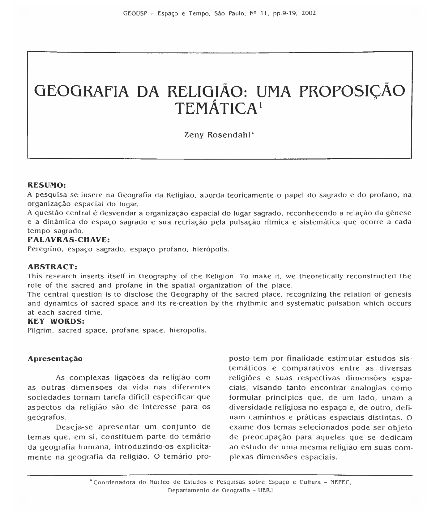 GEOUSP - Espaço e Tempo, Sáo Paulo, N ° 11, pp.9-19, 2002 GEOQRAFIA DA RELIGIÃO: UMA PROPOSIÇÃO TEMÁTICA' Zeny Rosendahl* RESUMO: A pesquisa se insere na Geografia da Religião, aborda teoricamente o papel do sagrado e do profano, na organização espacial do lugar. A questão central é desvendar a organização espacial do lugar sagrado, reconhecendo a relação da gênese e a dinâmica do espaço sagrado e sua recriação pela pulsação rítmica e sistemática que ocorre a cada tempo sagrado. PALAVRAS-CHAVE: Peregrino, espaço sagrado, espaço profano, hierópolis. A BSTRA C T: This research inserts itself in Geography of the Religion. To make it, we theoretically reconstructed the role of the sacred and profane in the spatial organisation of the place. The central question is to disclose the Qeography of the sacred place, recognizing the relation of genesis and dynamics of sacred space and its re-creation by the rhythmic and systematic pulsation which occurs at each sacred time. KEY WORDS: Pilgrim, sacred space, profane space, hieropolis. A p re se n ta çã o As com plexas ligações da religião com as outras d im ensões da vida nas diferentes sociedades tornam tarefa difícil especificar que aspectos da religião são de interesse para os geógrafos. Deseja-se apresentar um conjunto de temas que, em si, constituem parte do temário da geografia humana, introduzindo-os explicita mente na geografia da religião. O temário pro posto tem por finalidade estim ular estudos sis tem áticos e com parativos entre as d iversas religiões e suas respectivas dim ensões espa ciais, visando tanto encontrar analogias com o formular princípios que, de um lado, unam a diversidade religiosa no espaço e, de outro, defi nam cam inhos e práticas espaciais distintas. O exame dos temas selecionados pode ser objeto de preocupação para aqueles que se dedicam ao estudo de uma mesma religião em suas com plexas dim ensões espaciais. * Coordenadora do Núcleo de Estudos e Pesquisas sobre Espaço e Cultura - NEPEC, Departamento de Qeografia - UERJ 10 - GEOUSP - Espaço e Tempo, São Paulo, N° 11, 2002 Rosendahl, Z. O tem ário se le c io n ad o é constitu ído pelos seguintes temas: fé, espaço e tem po; difusão e área de abrangência; centros de convergência e irradiação; religião, território e territorialidade; e espaço e lugar sagrado: vivência, per cepção e sim bolism o. É conven iente ressaltar que os temas em questão não são m utuam ente excludentes entre si, ao contrário, interpenetram-se. Assim, à gui sa de exem plificação , um centro de conver gência re lig iosa está inserido no espaço de abrangência de uma determ inada fé; o circuito de uma procissão no interior de um centro de peregrinação, por sua vez, pode ser visto como parte da v ivência do espaço sagrado. É importante ressaltar ainda que o tem á rio aqui apresentado não esgota as possibilida des de se co locar em evidência outros temas. Mas isto é uma questão inesgotável: o que im porta agora é iniciar esse cam inho. 1. Fé, e s p a ç o e te m p o : difusão e á re a de a b ra n g ê n cia Pode-se dizer, de modo geral, que a experiência da fé nos classifica com o crentes e descrentes. A fé identifica o crente em um sistem a religioso e o investe de poderes que só ele adquire em sua experiência religiosa. A fé, no contexto judaico-cristão, leva a que tudo seja possível para Deus e também para o homem. "Se o homem não duvidar e acred itar que aquilo que diz se realizará, isto realizar-se-á. É por isso que vos digo: Tudo o que pedirdes rezando ser-vos-á conced ido" (SÃO MARCOS, XI, 22-24). Neste contexto, a fé significa liberdade, uma liberdade que permite ao homem participar ontologicam ente da existência de Deus, uma li berdade que encontra sua validade e seu apoio em Deus. Mas os mistérios da fé interessam à experiência religiosa, à teologia e ultrapassam nosso estudo. A perspectiva que interessa aos geógrafos está na análise da experiência da fé no tempo e no espaço em que ela ocorre. Os geógrafos JA C K SO N e HUDMAN exa minaram as principais crenças religiosas, ana lisando suas origens, sua difusão e os sistemas de crenças que afetam a interação homem-am- biente (1990: 365-411). A religião m uçulm ana é uma das três grandes religiões universais, juntam ente com o budismo e o cristianismo. O islam ismo, contu do, é menos difundido que o cristianism o, que se espalhou por todos os continentes. O cristianism o é a religião que reconhe ce Je su s Cristo como seu fundador: todas as variedades de cristianism o reconhecem a sua autoridade. A mensagem de Cristo teve sua maior difusão auxiliada pelo Im pério Romano. O cris tianismo foi adotado como religião do Estado pelo im perador romano Constantino, convertido no ano de 337 A partir de Roma, espalhou-se ao longo das rotas de com ércio do mundo roma no. A difusão do cristianism o por meio do im pério romano é um exemplo de difusão hierár quica. O movim ento dos primeiros m issionários cristãos para as grandes cidades e centros do império romano foi seguido por conversões e difusão para áreas vizinhas. Essa d ifusão proporc ionou não só a estabilidade política por meio da com unicação, favorecida pelo uso de uma língua com um (o grego falado pelos povos na parte oriental do império e o latim nas demais áreas), mas tam bém pela proteção das rotas de com ércio e de suas estradas. A Igreja Cristã foi se tornando cada vez mais privilegiada e de forte dom ínio cultural nas áreas convertidas. A d ifusão do cristianism o verificou-se, também, a partir da expansão européia in iciada no século XV. A difusão espacial das religiões é parti cu la rm en te im p o rtan te para a g eog ra fia e SO PH ER analisou as formas com que a d isse m inação da mensagem de fé pode ocorrer. Ele Geografia da religião: uma proposição temática, pp.9-19 propõe que, partindo de seus l