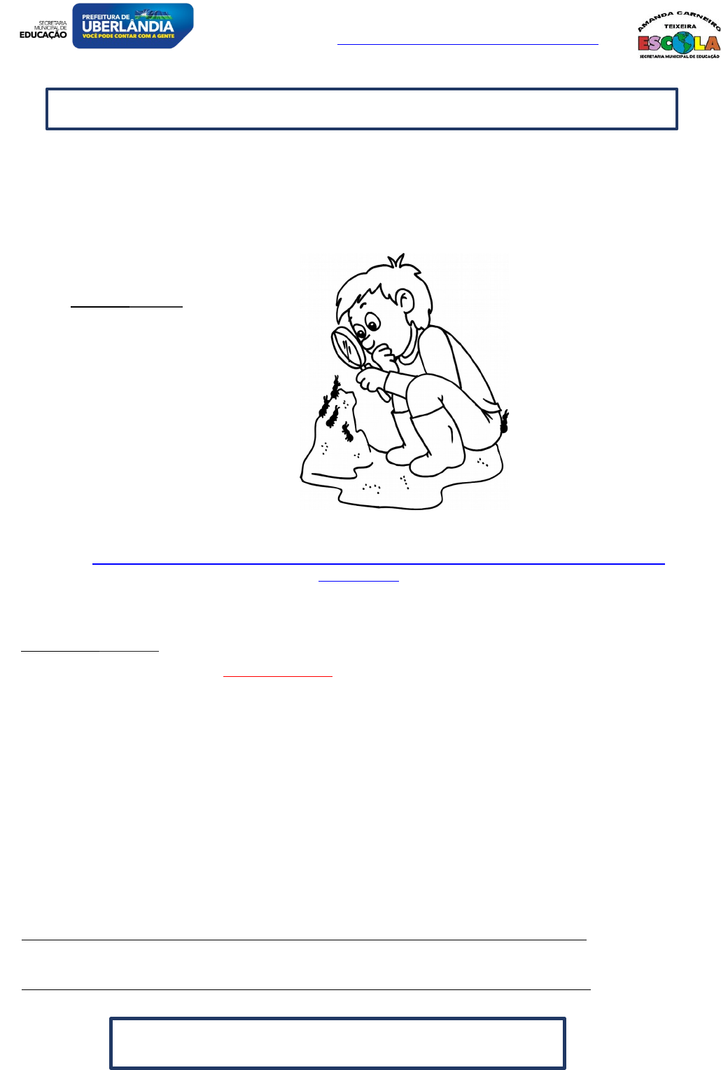 E. M. AMANDA CARNEIRO TEIXEIRA Email: emef.amandacarneiro@uberlandia.mg.gov.br Fone: 3232-0701 3º Ano- Semana de 22/06/2020 a 26/06/2020 Literatura e Linguagem - 3º ANO Escola:__________________________________________________________________________________ Aluno(a):___________________________________________________Ano:______Turno:________ LEIA A POESIA COM ATENÇÃO! Pontinho de vista Eu sou pequeno, me dizem, e eu fico muito zangado. Tenho de olhar todo mundo com o queixo levantado. Mas, se formiga falasse e me visse lá do chão, ia dizer, com certeza: - Minha nossa, que grandão! Pedro Bandeira Fonte: https://poesiaspreferidas.wordpress.com/2015/10/11/pontinho-de-vista-pedro-bandeira/menino-e-formiguinhas/ RESPONDA AS QUESTÕES NO VERSO DA FOLHA. CAPRICHE! Entendendo o poema 01 – Qual é o título do poema? Pontinho de vista 02 – Quantas estrofes e quantos versos possui o poema? O poema possui 2 estrofes e 8 versos 03 – Quem é o autor? Pedro Bandeira 04 – Por que o menino diz que precisa olhar todo mundo com o queixo levantado? A criança tem que perceber que os adultos são maiores que ela 05 – Se uma formiga visse você lá do chão e pudesse falar, será que ela diria que você é grande? Por quê? Resposta Pessoal 06 – Dentro da tua casa, perto de quem você é grande? Resposta Pessoal Referência: https://poesiaspreferidas.wordpress.com/2015/10/11/pontinho-de-vista-pedro-bandeira/ Acesso em 15 de junho de 2020 http://docs.uberlandia.mg.gov.br/wp-content/uploads/2020/02/DCMs-Fundamental-1.pdf. Acesso em 03 de junho de 2020. Elaborado por Elaine Cristina Nazaret Reis – Whatsapp: 996742452 Escola Municipal Amanda Carneiro Teixeira 1