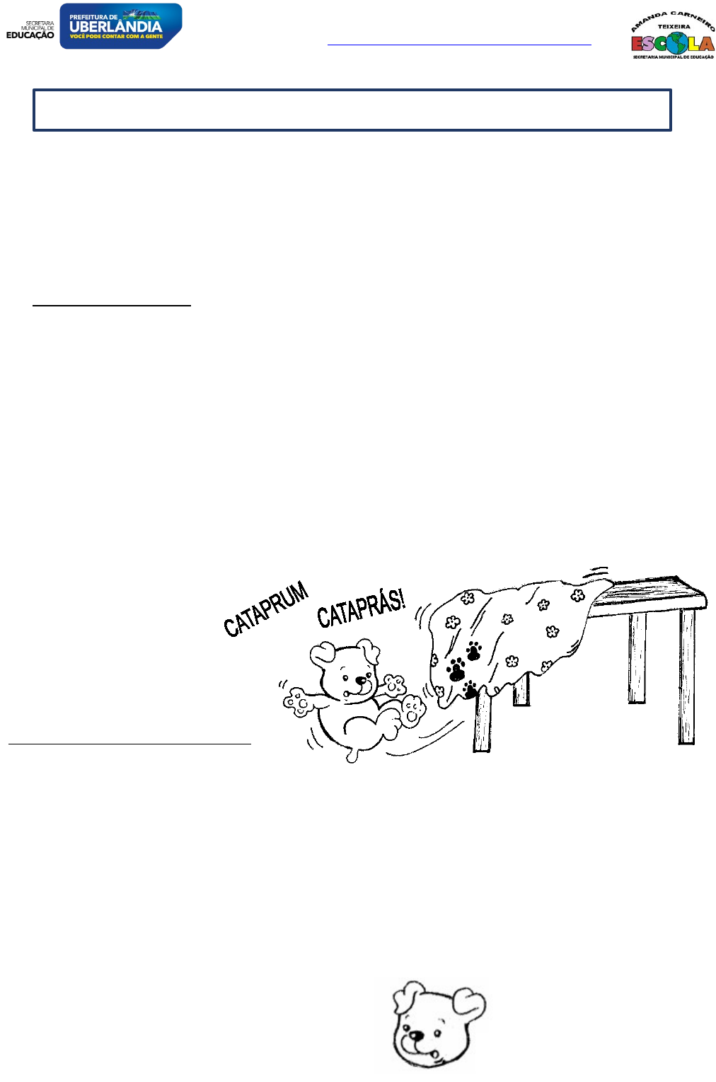 E. M. AMANDA CARNEIRO TEIXEIRA Email: emef.amandacarneiro@uberlandia.mg.gov.br Fone: 3232-0701 3º Ano- Semana de 29/06/2020 a 03/06/2020 Literatura e Linguagem - 3º ANO Escola:__________________________________________________________________________________ Aluno(a):____________________________________________________Ano:______Turno:________ LEIA O TEXTO COM MUITA ATENÇÃO, DEPOIS RESPONDA AS ATIVIDADES Eta, cachorrinho danado Bingo era alegre, brincalhão e curioso como ele só. Vivia correndo por todos os cantos, metendo o focinho onde não era chamado. __O que será que tem lá em cima? __ pensava o cachorrinho olhando a mesa da sala. Era pensar e agir. Lá ia o Bingo e puxava a toalha com os dentes. Desastre! Cataprum, cataprás! Vinha tudo para baixo, tigela, prato, salada, copo, jarra e feijão. Assustado com o barulho, Bingo se escondia, mas logo esquecia o susto e ia reinar mais adiante. Uma hora era xixi no tapete, outra hora era vaso quebrado. __ Quem sujou a colcha branca que eu acabei de lavar? __ Foi o Bingo, não vê? Não vê as pegadinhas de barro? __ Eta , cachorrinho danado! Mas com o Bingo, ninguém conseguia ralhar. Era só chegar perto dele que lá vinha o cachorrinho, rabo em pé, abanando, linguinha de fora, pronto para brincar, carinhoso como ele só. Pedro Bandeira COMPREENDENDO MELHOR O TEXTO Fonte imagem - Acervo da própria autora. Marque um X na alternativa correta 1. Como era o cachorrinho Bingo? ( ) alegre ( ) zangado ( ) curioso ( ) brincalhão ( ) danado ( ) tristonho 2. Qual a palavra foi usada no texto para demonstrar um grande barulho? ( ) Boom! ( ) Boing! ( ) Cataprum, cataprás! ( ) Tum! Tum! 3. Nas frases abaixo quais estão de acordo com o texto? ( ) Bingo vivia correndo por toda parte. ( ) Bingo era muito curioso. ( ) Ninguém gostava do cachorrinho Bingo. ( ) Bingo vivia dormindo no sofá. ( ) Bingo era um cachorrinho muito educado. 4. Escreva no balão o que pensava o cachorrinho quando olhava a mesa da sala. _________ __________________________ ______________________________ 5. O que Bingo fazia com a toalha da mesa? _____________________________________________________________ 6. O que Bingo fazia quando levava um susto? ______________________________________________________________________________ 7. Leia a frase: — Foi o Bingo, não vê? Não vê as pegadinhas de barro? Agora responda com suas palavras; o que quer dizer “pegadinhas” nesta frase. ______________________________________________________________________________ ______________________________________________________________________________ 8. Você gostaria de ter um cachorrinho como Bingo? O que você acha que sua mãe faria se tivesse um cachorrinho como Bingo na sua casa? ______________________________________________________________________________ ______________________________________________________________________________ Referência: https://www.portugues.com.br/gramatica/figuras-sonoras.html. Acesso em 22 de junho de 2020. https://magcursos.com.br/wp-content/uploads/2020/03/Atividades-de-Portugu%C3%AAs-semana-1.pdf. Acesso em 22 de junho de 2020. Elaborado por Elaine Cristina Nazaret Reis – Whatsapp: 996742452 Escola Municipal Amanda Carneiro Teixeira 1