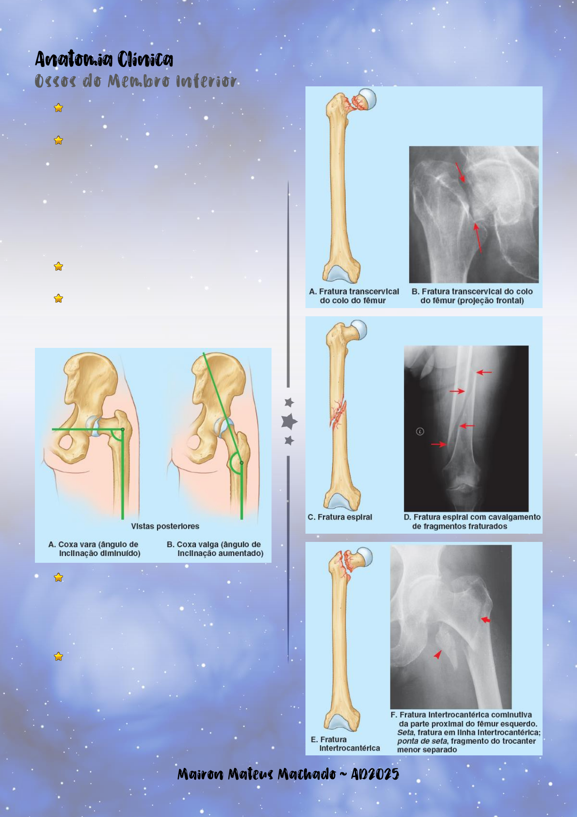 Lesões do membro inferior: mais comuns no joelho, perna e pé; Lesões do osso do quadril: denominadas fraturas pélvicas; fraturas por avulsão do osso do quadril podem ocorrer durante prática de esportes que exigem forças de aceleração ou desaceleração súbitas; as fraturas ocorrem nas apófises (projeções ósseas sem centro de ossificação secun- dária); Coxa vara: ângulo de inclinação entre eixo do colo do fêmur e corpo reduzido; Coxa valga: ângulo de inclinação entre eixo do colo do fêmur e corpo aumen- tado; Luxação da epífise da cabeça do fêmur: crianças de 10-17 pode haver desliza- mento da epífise da cabeça do fêmur em relação ao colo devido ao enfraqueci- mento da lâmina epifisial; Fraturas do fêmur: é comum. O colo é a área mais frequente por ser estreito e mais fraco com ângulo acentuado; enve- lhecimento e osteoporose acentuam. Ou- tro lugar comum é a intertrocantérica. Pode haver cavalgamento pelo ângulo de inclinação ou espasmos musculares e, as- sim, encurtamento do membro; Fraturas da tíbia: local mais frequente é na junção do terço médio e inferior do copo da tíbia, que é mais estreito. A face anterior ser subcutânea favorece fraturas expostas (mais comum). Há fraturas transversais por marcha, causadas por es- tresse (caminhadas longas) e fraturas di- agonais, causadas por torção (esquiar), podendo afetar até a fíbula e encurtar membro; Fratura das lâminas epifisiais: o centro de ossificação primário da extremidade su- perior aparece logo após nascimento e se une ao copo entre 16-18 anos. Fraturas podem, então, afetar crescimento. Do- ença de Osgood-Schlatter é a ruptura da lâmina na tuberosidade da tíbia, que causa inflamação e dor recorrente crônica na adolescência; Fraturas da fíbula: geralmente 2-6cm acima da extremidade distal do maléolo lateral. Compromete a marcha pelo papel na estabilidade do tornozelo. Associadas a fraturas-luxações da articulação talocru- ral. Fraturas dos maléolos lateral e medial comuns em jogadores de futebol e bas- quete; Enxertos ósseos: fíbula é fonte comum de osso para enxerto, pois mantém a ca- minhada, corrida e salto normais, mas ela, geralmente, não se regenera, pois a vas- cularização é retirada também; Infusão Intraóssea: método de adminis- tração de soluções diretamente na cavi- dade medular de um osso quando acesso venoso periférico é difícil. Geralmente, na parte proximal da tíbia, mas pode ser parte distal do fêmur da tíbia ou da fíbula, parte proximal do úmero e manúbrio do es- terno; Fraturas do calcâneo: causada por queda com força sobre calcanhar, causando fra- tura cominutiva. Geralmente incapacitante pois rompe articulação ta- localcânea; Fratura do colo do tálus: ocorrem durante dorsiflexão forçada do tornozelo; Fratura dos ossos metatarsais: ocorre quando um objeto pesado cai sobre o pé ou passa pelo pé. Comum em bailarinos. Fratura do dançarino: perda do equilíbrio e peso do corpo fica sobre os metatarsais. Fraturas por fadiga: estresse repetitivo, geralmente transversais; Osso trígono: osso acessório decorrente da não união do tubérculo lateral do tálus ao corpo do tálus durante ossificação; Fratura dos ossos sesamoides: os ossos sesamoides do hálux no tendão do m. fle- xor longo do hálux sustentam o peso do corpo durante a última fase de apoio da marcha. A fratura pode ser causada por esmagamento. L., MOORE, K., DALLEY, F., AGUR, Anne R.. Anatomia Orientada para Clínica, 8ª edição. Guanabara Koogan, 2018. Vital- Book file.