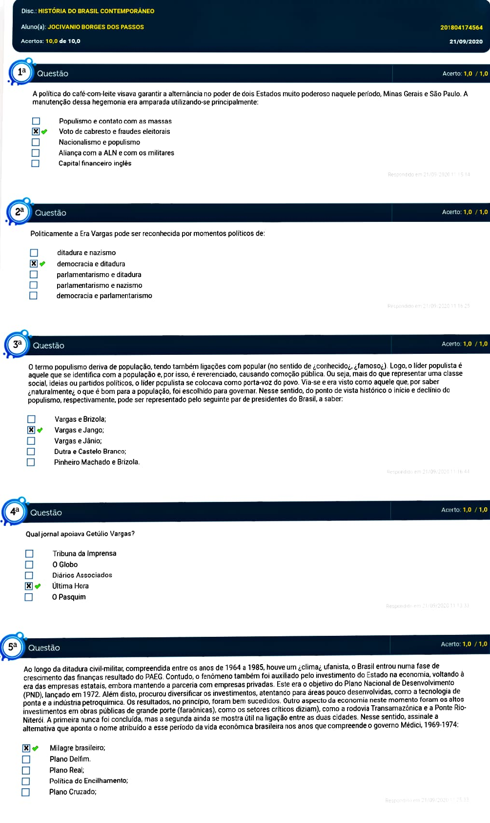 Disc.: HISTÓRIA DO BRASIL CONTEMPORÁNEO Aluno(a): JocIVANIO BORGES DOS PASSOS 201804174564 Acertos: 10,0 de 10,0 21/09/2020 Questão Acerto: 1,0 /1,0 A politica do caf�-com-Heite visava garantir a altern�ncia no poder de dois Estados muito poderoso naquele periodo, Minas Gerais e São Paulo. A manutençao dessa hegemonia era amparada utilizando-Se principalmente Populismo e contato com as massas Voto de cabresto e fraudes eleitorais Nacionalismo e populismo Aliança coma ALN e com os miltares Capital financeiro ingles Respondido em 21/03 2020 T 1514 Acerto: 1,0 /1,0 Questão Politicamente a Era Vargas pode ser reconhecida por momentos politicos de: ditadura e nazismo democracia e ditadura parlamentarismo e ditadura parlamentarismo e nazismo democracia e parlamentarismoO espondiaD em2 r 220 11 T (3 Questäo Acerto: 1,0 /1,0 O termo populismo deriva de população, tendo também ligações com popular (no sentido de iconhecidoj. ifamosog). Logo, o lider populista é aquele que se identifica com a populaç�o e, por isso. é reverenciado, causando comoção publica. Ou seja, ma1s do que representar uma classe social, ideias ou partidos politicos, o lider populista se colacava como porta-voz do povo. Via-se e era visto como aquele que. por saber naturalmentej o que é bom para a população, foi escolhido para govemar. Nesse sentido. do ponto de vista histórico o inicio e decinio do populismo, respectivamente, pode ser representado pelo seguinte par de presidentes do Brasil, a saber. Vargas e Brizola; Vargas e Jango; Vargas e Jánio; Dutra e Castelo Branco; Pinheiro Machado e Brizola. erpindieo em 21/09.2020164 Questão Acerto: 1,0 /1,0 Qual jornal apoiava Getülio Vargas? Tribuna da Imprensa O Globo Diários Associados & Ultima Hora O Pasquim espod o em 1/02020 11 1 33 5 Questão Acerto: 1,0/1,0 Ao longo da ditadura civi-miitar, compreendida entre os anos de 1964 a 1985. hoUve um climaz ufanista. o Brasil entrou numa fase deand crescimento das finanças resultado do PAEG. Contudo, o fenómeno também foi auxillado pelo investimento do Estado na economia, voltando à era das empresas estatais, embora mantendo a parceria com empresas privadas. Este era o objetivo do Plano Nacional de Desenvolvimento (PND), lançado em 1972. Além disto, procurou diversificar os investimentos, atentando para áreas pouco desenvolvidas. como a tecnologia r ponta e a indústria petroquimica. Os resultados, no principio, foram bem sucedidos. Outro aspecto da economia nete momento toram as investimentos em obras publicas de grande porte (faraónicas), como os setores crticos diziam), como a rodovia Transamazónica ea Ponte Rio- Niteroi. A primeira nunca foi concluida, mas a segunda ainda se mostra util na ligação entre as duas cidades. Nesse sentido, assinale a atemativa que aponta o nome atribuido a esse periodo da vida economica brasileira nos anos que compreende o governo Medici, 1969-1974: ilagre brasileiro, Plano Delfim. Plano Real; Politica do Encilhamento Plano Cruzado Questão Acerto: 1,0 /1,0 um dos fatos que marcaram o governo Geisel foio assassinato. nas dependéncias do chamado DO-cODI palista, do jornalista Vladimir Herzog Assinale, abaixo, a razão para o assassinato de Herzog ter sido um dos fatos que marcou esse governo. Apartir dal.a sciedade civl passa a pressionar o governo exigindo eleicões diretas para a presidencia da Repüblica, o que viria a ocorrer no final do governo Geise!, encerrando o ciclo da ditadura civilrmilitar no Brasi Contrriando todos os procedmentos do regime militar até então. o presidente Geisel mandou apurar minuciosamente todos os fatos envovendo a prisao e morte do jornalista Vladimir Herzog. A investigação ofcial concluiu que o jornalista havie mesmo se suicidado. Opresidente Enmesto Geisel renunciou, sendo eleito o general oão Baptista de Figueiredo, que iniciou o processo de abertura politica e de anistia. OTato alcancou uma enorme repercussão na imprensa e. apesar de ainda estarmos sob o Al5, o povo, novamente, voltou às ruas o que acabou levando, logo em seguida, à decretação da anistia ampla, geral e irrestrita pelo presidente Geisel. 2 0 fato alcançou uma grande repercussão devido a uma reportagem investigativa de um jornal aternativo que contestava, sem chances de refutação, a versão oficial do suicídio. A partir dal, a sociedade civil passaria a exercer vigilancia sobre os casos de desaparecimento, tornando o governo suspeito pelas atrocidades cometidas pelos orgaos de repressao do regime. epona1do em1/09202T12 Questão Acerto: 1,0/1,0 Na história da República brasileira, a eleiç�o de Lula foi um fato inédito em decorència: De haver setores do exército nacional interessados em realizar um golpe para impedir sua posse. De ter conseguido se eleger em sua primeira tentativa de concorer ao cargo. De ter sido ele um grende intelectual academico, criando grandes esperanças no desenvolvimento económico e cultural do pais. De ter sido o único candidato a prometer acabar com a desigualdade no Brasil. 8De ter sido ele o primeiro operário, membro de um partido de esquenda, a governar o pais. Questão Acerto: 1,0/1,0 A luta pela terra é uma questão muito significativa quando pensamos na história do Brasil contemporáneo, tendo sido o mote de diversos movimentos que que lutaram pelo acesso a esse elemento básico de uma sociedade, local para viver e plantar. Dentre os vários grupos formados para lutar pelo direito à terta e buscar a definitiva reforma agrâria, o mais reconhecido dentre os movimentos sociais éo: MTRSTS MST MRTST MLTST MRST Respoindido eru 210e 20 3656 Questão Acerto: 1,0 7 1,0 Em 1967, tentando solucionar a Questão Indigena no Brasil, o governo civil-militar que em 1964 tomara o poder no Brasil, criou o órgão que ainda hoje e responsável pelas politicas indigenistas do Brasil. Dessa forma, assinale a alternativa que coretamente grifa o nome desse órgão. FUNAI; Pastoral do Indio. SP MST; CNPI; Respendide em 2