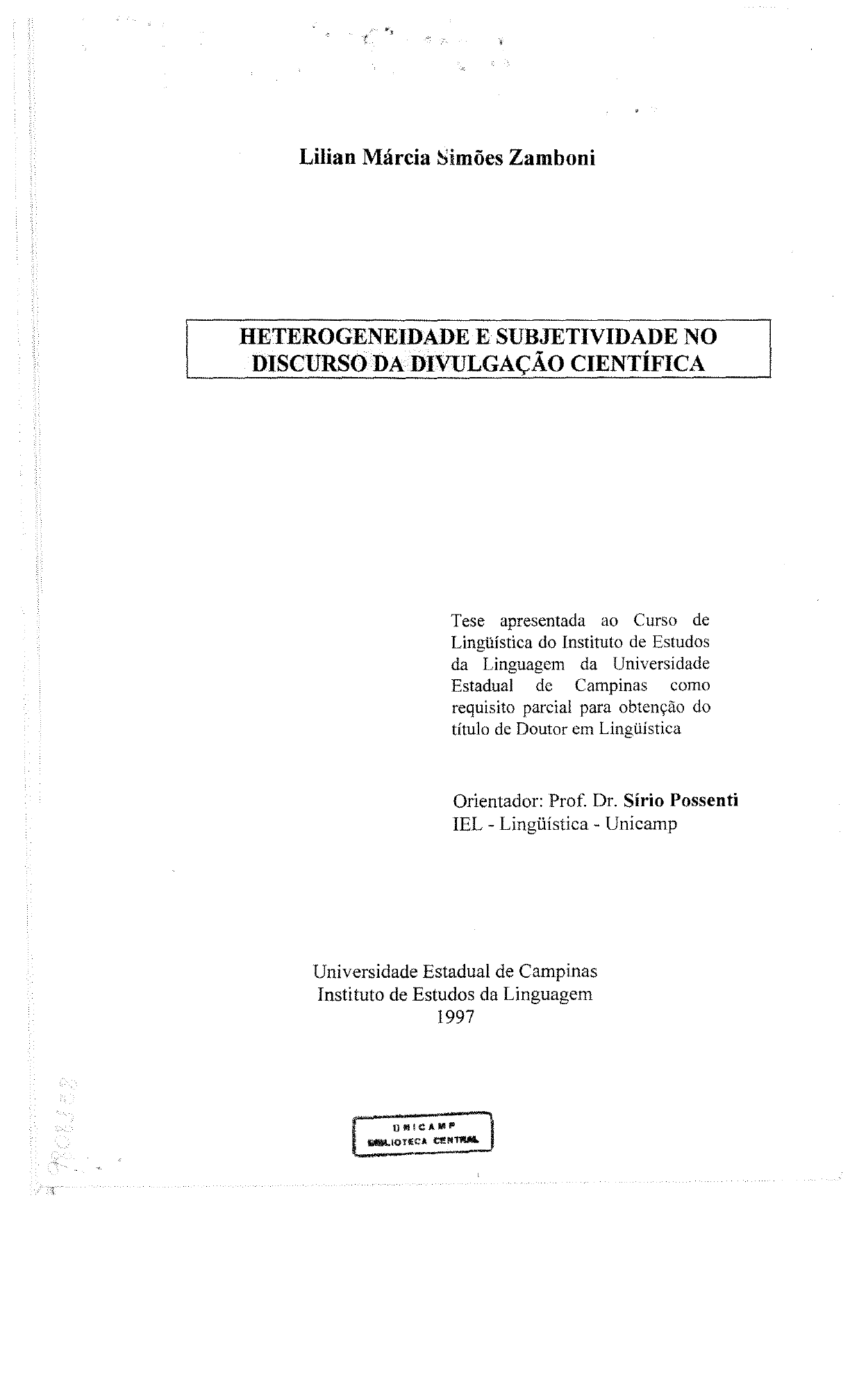 Lilian Márcia Simões Zamboni HETEROGENEIDADE E SUBJETIVIDADE NO DISCURSO DA DIVULGAÇÃO CIENTÍFICA Tese apresentada ao Curso de Lingüística do Instituto de Estudos da Linguagem da Universidade Estadual de Campinas como requisito parcial para obtenção do título de Doutor em Lingüística Orientador: Prof. Dr. Sírio Possenti IEL -Lingüística- Unicamp Universidade Estadual de Campinas Instituto de Estudos da Linguagem 1997 1)111tCAMP -..onc• """,_ 1 CM-00107594-0 11 IIZ14h li 11 li 11 11 11 li 11 li li 11 11 li FICHA CATALOGRÃFICA ELABORADA PELA BIBLIOTECA IEL - UNICAMP Zamboni, Lilian Márcia Sim&es 11 Heterogeneidade e subjetividade no dis- H curso da divulga~ão científica I Lilian Már- I cia Simões Zamboni. - - Campinas, SP: Cs.n. J. t997. I Orientador Sírio Possenti Tese <Doutorado) - Universidade Estadual de Campinas, Instituto de Estudos da Lingua- gem. i. L1nguistica 2. Análise do discurso. 3. Ciência- linguagem 4. Subjetividade I. Possenti, Sírio. II Universidade Esta- dual de Campinas Instituto de Estudos da Linguagem III. Título. li li li , .. Banca Examinadora Prof. Dr. Sírio Possenti - Orientador Profa. Dra. Ester Mirian Scarpa Profa. Dra. Helena H. Nagamine Brandão f! ',,) a; ·U "'"' ,..., ,,j Q '{j ,,,.:; Prof. Dr. João Wanderley Geraldi < •-' ' _; (J ;: ·~ ;f Protà .. ,Dfá. Stella Maris Bortoni-Ricardo >~ ,. i -:> ... ~ ·~.) ' - ('j ) \ .... ,,,.j ;-,J ti.1 '" 27 de novembro de 1997 3 Ofereço este trabalho a minha mãe, Elza, mãe Elza. Dedico-o a S!lvio, meu marido, e a meus filhos Dario, Lúcia, Sílvia e Júlia. Eles sabem que, na ordem geral das coisas, eles vêm sempre em primeiro lugar. Por isso que tudo o mais demora tanto a ser feito ... ! Agradecimentos Agradeço à Universidade de Brasília, colegas e chefias, pelo incentivo ao impulso inicial de rumar para o Doutorado. À CAPES, pela concessão de uma bolsa de estudos do então PICD. Ao Senado Federal, pela liberação durante o período de escrítura da dissertação. Foi fundamental, para a finalização do trabalho, o apoio do diretor da Consultoria Legislativa, Estêvão Chaves de Rezende Martins, e decisiva a compreensão que recebi dos coordenadores do Núcleo de Pronunciamento: Álvaro Almeida de Britto, Domingos Antonio Campagnolo e Arésio Teixeira Peixoto. 4 Ao Sírio, meu orientador, vai o melhor de minha gratidão. Pela condução segura e compreensiva com que me fez chegar ao termo, e muito ... pela paciência infinita. Ele foi o "outro" mais constitutivo deste empreendimento enunciativo. Aos Professores Wanderley Geraldi e Helena Nagamine, por todas as contribuições dadas à tese no exame de qualificação. Tudo o que ficou melhor na tese daí para a frente deveria receber a co-autoria deles. Às amigas Lucília do Carmo Garcez e Maria Luiza Corôa, companheiras do grupo "vigilantes da tese", agradeço pela leitura crítica de partes do trabalho. A Lea Strini Velho, pelas conversas de horas e horas sobre sociologia da ciência e por suas anotações ao capítulo 2. A Maria Auxiliadora Ribeiro Kneipp, por ter me socorrido quando o francês me faltou. A Berenice de Sousa Otero, por seu olho "clínico". A Carlos Henrique Nascimento, por me ajudar a domar o computador. Agradeço ainda a todos que me ajudaram a recolher material de divulgação científica: ao meu sogro, Dario Euclydes Zamboni (pena que tàleceu antes de ver o final dessa trabalheira), que durante mais de um ano colecionou o caderno Ciência, da Folha de S. Paulo; à minha cunhada, Célia, por ter me dado sua coleção da revista Saúde é Vital!; ao pesquisador Cléber Alho, da WWF, que me disponibilizou material de divulgação; aos meus filhos Dario e Sílvia, pelas coleções de Globo Ciência e Superinteressante; à Lea, por me dado muitos exemplares de Ciência Hoje; a alguns assessores de imprensa filiados à Sociedade Brasileira de Jornalismo Científico, que me enviam regularmente material de divulgação. A todos aqueles que não cito, mas que torceram para que eu chegasse ao final, e até sofreram comigo, muito obrigada! 5 Epígrafe Considerando que não há nada mais necessário para promover o progresso das Questões filosóficas do que a comunicação, aos que aplicam os seus estudos e esforços nesse sentido, das coisas que são descobertas ou postas em prática por outros; julga -se portanto adequado utilizar a imprensa, como o meio mais próprio de recompensar aqueles cujo empenhamento em tais estudos, e gosto no progresso do saber e de descobertas proveitosas, lhes dá o direito ao conhecimento do que este reino, ou outras partes do Mundo, também, de tempos a tempos propicia, assim como do progresso dos estudos, labores e esforços dos curiosos e eruditos em coisas deste gênero, e das suas descobertas e realizações completas: com o propósito de que sendo tais criações clara e genuinamente comunicadas, possam ser mais alimentados os desejos de conhecimento sólido e útil, apreciados os esforços e os empreendimentos engenhosos, e convidados e encorajados a investigar, experimentar e descobrir novas coisas, comunicar o seu saber uns aos outros, e contribuir com o que puderem para o grande objectivo de melhorar o conhecimento natural, e aperfeiçoar todas as artes filosóficas, e todas as ciências. E tudo para a glória de Deus, a honra e o proveito destes reinos, e o bem universal da humanidade." Editorial do Philosophical Transactions: Giving some Accompt of lhe Present Undertakings, Studies, and Labours, ofthe lngenious in many Considerable Parts ofthe World, um dos jornais pioneiros em divulgação científica, surgido na Inglaterra em 1665. Sumário Resumo 08 Abreviaturas empregadas 09 Introdução 1 O Capítulo 1: Fundamentos teóricos 15 1.1. O quadro epistemológico 19 1.2. A noção de sujeito 22 1.3. Uma teoria do estilo 32 1.4. Heterogeneidade discursiva 38 1.5. Subjetividade mostrada 45 Capítulo 2: A comunidade discursiva 49 Capítulo 3: As (auto)representações da 