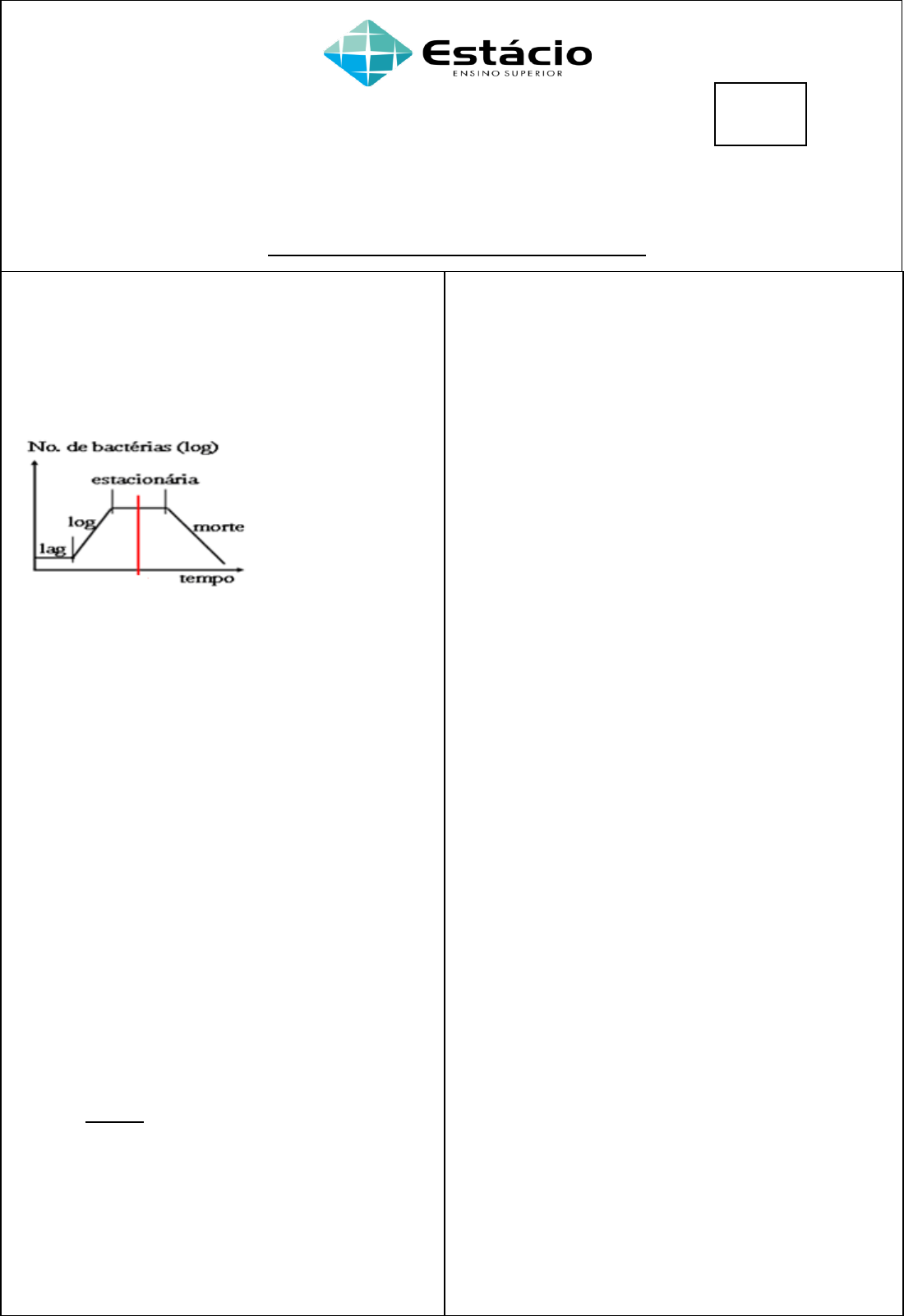 AVALIAÇÃO TEÓRICA 1 (AV1) NOTA: Instituição: Estácio Centro RS Curso: Biomedicina Período: 2019.1 Disciplina: Fundamentos de Microbiologia e Imunologia Data: __/__/_____ Aluno(a): __________________________________________________________________________________ OBS: as respostas deverão ser passadas para a grade de respostas na segunda folha. Colunas com rasuras serão consideradas como erradas. 1 - O gráfico de crescimento bacteriano (figura abaixo) mostra as fases de crescimento e decréscimo do número de bactérias presentes em determinado processo. Pensando no exame de hemocultura, no crescimento bacteriano, e sabendo que o tempo máximo para início da incubação é de duas horas, quando observamos este gráfico e verificamos que a hemocultura iniciou a incubação uma hora depois da colheita, podemos concluir que o resultado esta prejudicado? Porque? A – Sim, porque o tempo é fator determinante para não comprometer a estabilidade e viabilidade do crescimento bacteriano. B – Não, porque o tempo não é fator determinante para comprometer a estabilidade e viabilidade da amostra. C – Neste caso o tempo inicial de incubação de uma hora é preconizado pelos órgão da saúde, como tempo dentro do limite dos padrões. D – Não, porque o tempo é fator determinante para não comprometer a estabilidade e viabilidade do crescimento bacteriano 2 - O pneumococos é conhecido por suas inúmeras complicações durante seu processo bacteriano. Na identificação bacteriana pelo método de “Gram” o biomédico visualiza na microscopia que tipo de forma bacteriana. A – Cadeias alongadas B – Cadeias esféricas - bacilos C – Cadeias esféricas D – Tétrade 3 - A taxa de crescimento bacteriano durante a fase estacionária do crescimento é: A – o dobro B – crescente C – constante D – decrescente E – nula 4 - O controle de microrganismos é possível pela ação de agentes físicos e químicos que possuem propriedades de matar a célula microbiana ou de impedir a sua reprodução. Assinale a alternativa incorreta no que se refere aos métodos de controle de crescimento microbiano. A - A temperatura de 120ºC está adequada ao processo de esterilização empregando calor úmido B - A forma de esterilização empregando calor seco é a autoclavação C - No processo de desinfecção são usadas substâncias químicas que reduzem ou inibem o crescimento, mas não esterilizam D - A forma mais simples de esterilização empregando calor seco é a flambagem (fogo) 5 - Dados da Secretaria Estadual de Saúde de São Paulo acusam que as ocorrências de sífilis por transmissão sexual cresceram 603% nos últimos seis anos. Em outros estados, o panorama não é menos preocupante. Em 2013 e 2014, Acre, Pernambuco e Paraná registraram crescimento de 96,1%, 94,4% e 63,1%, respectivamente. Assinale a alternativa que corresponde à morfologia e ao nome do agente etiológico da sífilis. A - Diplococo Gram-negativo – Neisseria gonorrhoeae. B - Espiroqueta – Neisseria gonorrhoeae. C - Espiroqueta – Treponema pallidum. D - Diplococo Gram-negativo – Treponema pallidum. E - Diplococo Gram-positivo – Treponema pallidum. 6 - O material nutriente preparado para o crescimento de microrganismos em um laboratório é chamado de meio de cultura. Algumas bactérias podem crescer bem em qualquer meio de cultura, outras requerem meios especiais, e outras ainda não podem crescer em qualquer dos meios não vivos até agora desenvolvidos. Analise as afirmativas abaixo em relação a esse tema: I. Os microrganismos introduzidos em um meio de cultura para iniciar o crescimento são chamados de inóculo. II. Um meio de cultura deve conter os nutrientes adequados para o microrganismo específico que queremos cultivar; também deve conter uma quantidade de água suficiente, um pH apropriado e um nível conveniente de oxigênio ou talvez nenhum. III. O meio deve ser estéril – isto é, deve inicialmente não conter microrganismos vivos –, dessa forma a cultura conterá somente os microrganismos (e sua descendência) que foram introduzidos. IV. Os microrganismos que crescem e se multiplicam dentro ou sobre um meio de cultura são denominados cultura. Esta cultura em crescimento deve ser incubada em temperatura apropriada para o crescimento eficiente do microrganismo cultivado. Assinale a alternativa em que todas as afirmativas estão CORRETAS: A - Apenas II e III. B - Apenas III e IV. C - Apenas I, II e IV. D - Apenas I, III e IV. E - I, II, III e IV. 7 - Os micro-organismos que exigem ausência de oxigênio para sua sobrevivência precisam ser encubados em A - freezer a -80 °C. B - câmara de fluxo laminar. C - jarra (local) de anaerobiose. D - estufa a vácuo. 8 - As bactérias gram negativas, na técnica de coloração de Gram, são coradas pelo último corante adicionado, que é A - a fucsina. B - o cristal violeta. C - o lugol. D - o iodo. E - o álcool cetona. 9 – De que maneira você poderia contribuir no exercício de sua profissão para limitar a resistência bacteriana a drogas antimicrobianas? A – Somente utilizar antibióticos com orientação médica 1 2 3 4 5 6 7 8 A B C D E 9 10 11 12 13 14 15 A B C D E B – Utilizar os antibióticos no período total de tratamento orientado pelo médico C – Orientar aos pacientes a utilização correta dos medicamentos D – Todas as alternativas estão corretas 10 – A estrutura bacteriana representada abaixo, apresenta uma estrutura bacteriana que confere à mesma resistência aos antibióticos. Observando a figura, qual estrutura que você conclui que confere resistência bacteriana? A – Cápsula B – Pili C – Membrana plasmática D – Membrana celular E – Nenhuma das alternativas 11 – Qual dos seguintes termos melhor descreve um microrganismo que cresce a 25°C? A – Neutrófilos B – Psicrófilo C – Mesófilo D – Osmótico E – Termófilos 12 - Qual dos seguintes termos melhor descreve um microrganis