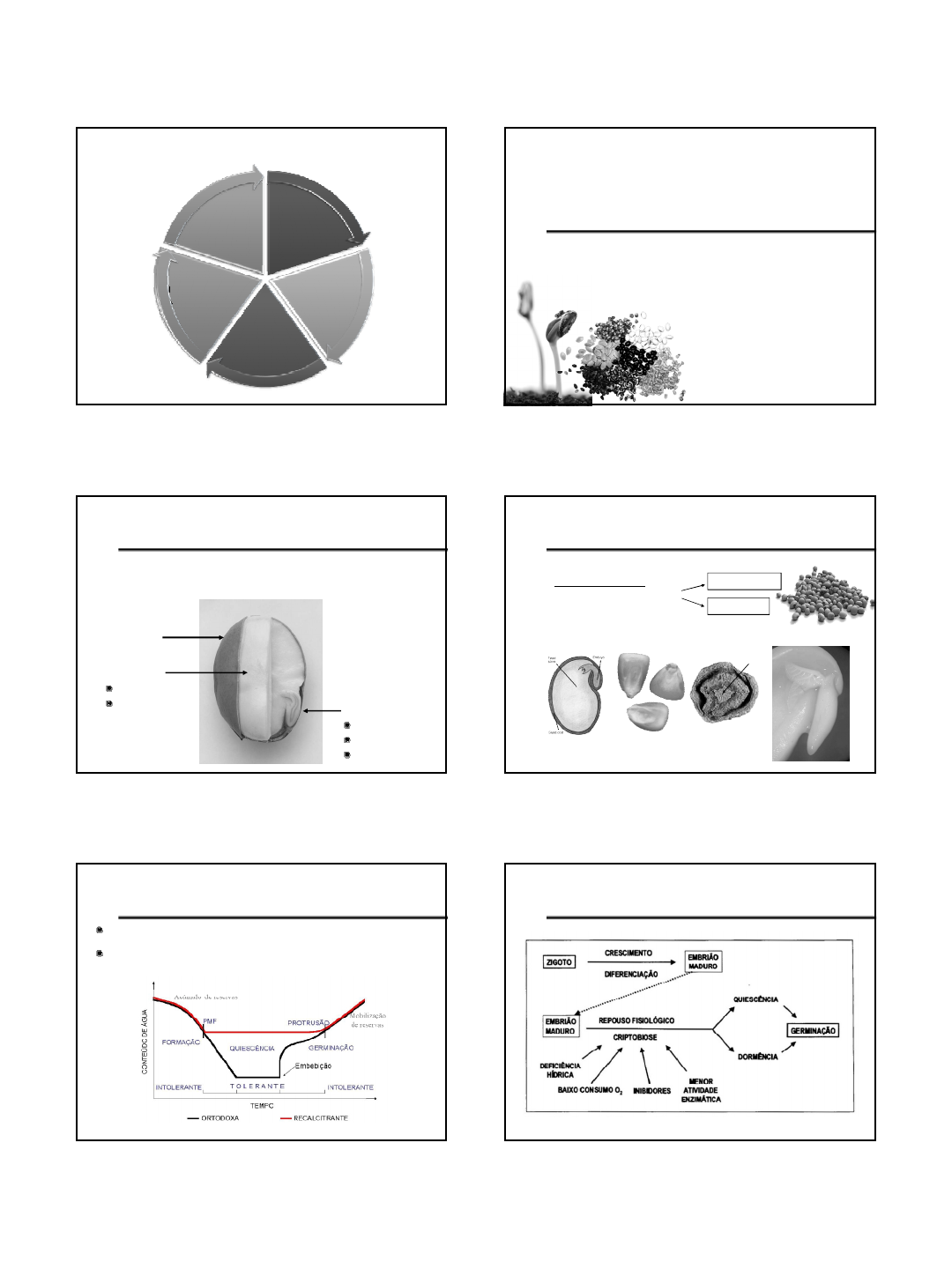 31/10/2017 1 Germinação Juvenilidade Maturidade Florescimento / Frutificação Senescência/ morte BIOCICLO VEGETAL Germinação e Dormência de sementes Conceito funcional de semente tegumento embrião: Tecido de reserva Eixo embrionário eixo embrionário: Plúmula Hipocótilo Radícula É o óvulo desenvolvido após a fecundação com estruturas complexas constituídas de reservas de nutrientes, um embrião, protegido pelo tegumento. Conceito funcional de semente Do ponto de vista funcional, as sementes são constituídas por: cascas (cobertura protetora) tecidos de reserva (cotiledonar, endospermático ou perispermático) Tegumento Pericarpo tecido meristemático (eixo embrionário) Desenvolvimento (Maturação) da semente Maturação: expansão celular e alocação de substâncias para os tecidos de reserva; Dessecação: aumento na taxa de desidratação e ruptura de suas conexões com a planta. Fisiologia da germinação de sementes 31/10/2017 2 Fisiologia da germinação de sementes Conceitos de Germinação Fim “repouso fisiológico” – início germinação Fisiologistas Tecnologistas Critério fisiológico - conjunto de processos fisiológicos no embrião que se inicia com a embebição e culminam na protrusão da radícula dos envoltórios da semente. Critério agronômico ou tecnológico – emergência da plântula através da superfície do solo. Brosimum gaudichaudii Fisiologia da germinação de sementes Fases da Germinação Padrão trifásico de embebição: Gradiente de potencial hídrico () entre a semente e seu ambiente: = m + s + p Fase I: Reativação: embebição, ativação da respiração e metabolismo Fase II: Indução do crescimento: fase lag, preparação para o crescimento Fase III: Crescimento: protrusão da radícula Fisiologia da germinação de sementes FASE I FASE II GERMINAÇAO VISÍVELT EO R D E Á GU A TEMPO -m - s p FASE III Fatores que influenciam a germinação de sementes Fatores extrínsecos ou ambientais: - luz : fotoblastismo - temperatura - potencial de água - fatores químicos - gases - fatores bióticos Fatores intrínsecos ou internos: - morfologia - viabilidade: capacidade de uma semente reter seu potencial germinativo - dormência Dormência de sementes 1. Conceitos Dormência resultado da adaptação alcançada pela espécie através da evolução, superando situações estressantes no ambiente de origem. Dormência estado de repouso fisiológico em que a semente, em virtude de sua estrutura ou composição química, possui um ou mais mecanismos bloqueadores da germinação. Dormência de sementes Vantagens: • Função ecológica ► evita que a semente germine em condições desfavoráveis • Evita que a semente germine dentro do fruto – viviparidade Desvantagens: • Longos períodos para superar dormência • Longevidade de plantas invasoras 31/10/2017 3 Dormência de sementes Tipos de dormência e formas de superação a) Dormência primária ou inata (instalada na semente ao final da maturação, ainda na planta-mãe) b) Dormência secundária ou induzida (instalada após desligamento da semente da planta-mãe) a) Endógena ► embrião b) Exógena ► tecidos externos Época de estabelecimento Impedimento da germinação Dormência de sementes a) Dormência Primária Durante o desenvolvimento da semente Tegumentar Embrionária ou morfológica Fisiológica Fotoblástica Combinação de causas Giberelina Escarificação física ou mecânica Dormência de sementes Exemplo: viviparidade em Tomate Dormência de sementes a.4) Dormência fotoblástica • Fotoblatismo ►necessidade de luz para germinar • Subtipo de dormência fisiológica • Não é tipo de dormência Dormência de sementes Exposição à luz FITOCROMO FV660nm FVE730nm Luz Vermelha Vermelho distante Germinação Dormência Escuro Dormência de sementes 31/10/2017 4 a.5) Combinação de causas • Mais de um tipo de dormência • Pindaíba – tegumento duro e embrião imaturo Dormência de sementes b) Dormência secundária ou induzida • Semente colhida em estado quiescente • Adquirida ou induzida através de fatores externos: - luz rica em VE - temperaturas extremas - más condições de armazenamento - estresse hídrico ou anoxia Dormência de sementes Germinação Juvenilidade Maturidade Florescimento / Frutificação Senescência/ morte BIOCICLO VEGETAL JUVENILIDADE E MATURIDADE 1 - Conceitos 2 - Duração da juvenilidade 12 anos 25 anos 70 anos 3 - Classificação da juvenilidade • Classes: A) Quantitativa: depende apenas de um estímulo externo (fotoperíodo, água, temperatura) B) Qualitativa: depende da planta (inapta) independente que o ambiente seja lhe favorável. Ex.: Xanthium strumarium 31/10/2017 5 • aspecto seletivo (capacidade fotossintética) • entraves nos programas de melhoramento genético 5 - Vantagens ecológica da juvenilidade • Mesmo plantas com competência para florescer, podem não florescer (dependência do ambiente) • * inabilidade de florescer • espessura foliar • * filotaxia • espinhosidade • potencial para formar raízes adventícias • retenção de folhas no outono • conteúdo de pigmentos • forma da folha 4 - Características morfo-fisiológicas da fase juvenil: Desenvolvimento 6 - Transição de fases juvenil p/ maturidade A) Mudanças morfológicas: forma das folhas Ex.: fabaceas (feijão, Cassia) - folhas primárias simples e depois são compostas (trifolioladas); idem com o algodoeiro - fase adulta voltam a serem simples e inteira • Alguma espécies podem ter até 8 formas foliares até atingirem a fase madura • Outras mudanças: filotaxia em eucaliptus; mudança de cor; presença de espinhos Sassafrás albidum Hedera helix B) Mudanças fisiológicas • Redução da habilidade para rizogênese • Aptidão para florescer • * síntese de pigmentos (antocianinas) • > capacidade para crescerem Exemplos de dependência do ambiente p/ florescer: - Beterraba: florescimento dependente