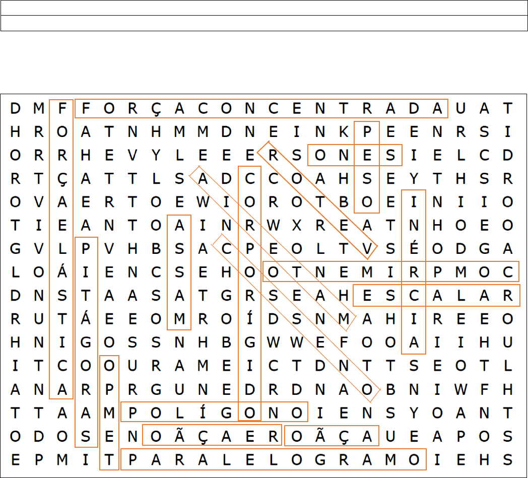 1 Mecânica dos Sólidos – DEFINIÇÕES DE ESTÁTICA Nome: Ayrton Gabriel Alves da Costa Turma: CMN03S1 As palavras deste caça palavras estão escondidas na horizontal, vertical e diagonal, com palavras ao contrário. Encontre as 18 palavras relacionadas ao assunto abordado no nosso estudo de Mecânica do Sólidos, e para cada palavra encontrada descreva seu conceito (sua definição): 1 (Força Concentrada) Diz-se que uma é força concentrada quando se considera que ela é aplicada em um único ponto. Uma força deste tipo é representada por um vetor cujo tamanho representa a intensidade da força. 2 Mecânica dos Sólidos – DEFINIÇÕES DE ESTÁTICA Nome: Ayrton Gabriel Alves da Costa Turma: CMN03S1 2 (Ação) Ação é uma funcional escalar que deve ser tornada extrema pelo movimento que ocorre em algum sistema, segundo o princípio de Hamilton. A unidade de medida da ação é unidade de energia vezes tempo. 3 (Paralelogramo) O paralelogramo é uma figura plana que possui quatro lados. Ele faz parte dos estudos da geometria plana sendo um quadrilátero cujos lados opostos são paralelos. 4 (Polígono) Um polígono é uma figura geométrica plana e fechada formada por segmentos de retas, chamados de lados. 5 (Reação) O tempo de reação é o intervalo de tempo existente entre a geração de um estímulo visual, audível, etc., e a ação motora. Esse tempo gira em torno de valores que correspondem a milésimos de segundos. 6 (Tempo) Tempo é a grandeza física que permite medir a duração ou a separação das coisas mutáveis/sujeitas a alterações (ou seja, o período decorrido entre o estado do sistema quando este apresentava um determinado estado e o momento em que esse dito estado regista uma variação perceptível para o observador). 7 (Peso) O peso de um objeto é a força gravitacional sofrida por este objeto em virtude da atração gravitacional nele exercida por um outro corpo com massa. 3 Mecânica dos Sólidos – DEFINIÇÕES DE ESTÁTICA Nome: Ayrton Gabriel Alves da Costa Turma: CMN03S1 8 (Escalar) Uma grandeza escalar é aquela que seu valor numérico, junto a unidade de medida, é o suficiente para expressar uma grandeza física. 9 (Vetor) Vetor é um segmento de reta orientado que apresenta módulo (tamanho), direção e sentido. Os vetores são usados para expressar grandezas físicas vetoriais. 10 (Massa) Vetor é um segmento de reta orientado que apresenta módulo (tamanho), direção e sentido. Os vetores são usados para expressar grandezas físicas vetoriais. 11 (Seno) O seno é uma função trigonométrica. Dado um triângulo retângulo com um de seus ângulos internos igual a θ, define-se sen(θ) como sendo a razão entre o cateto oposto a θ e a hipotenusa deste triângulo. 12 (Comprimento) Comprimento é a grandeza física que expressa a distância entre dois pontos. Na linguagem comum se costuma diferenciar a altura (quando se refere a um comprimento vertical) e a largura. 13 (Inércia) A inércia é a tendência natural de um objeto em resistir a alterações em seu estado original de repouso ou movimento. 14 (Força Elástica) Força elástica é uma força física associada à compressão ou tração de corpos que têm elasticidade (molas, borrachas e outros tipos de elásticos em geral). 4 Mecânica dos Sólidos – DEFINIÇÕES DE ESTÁTICA Nome: Ayrton Gabriel Alves da Costa Turma: CMN03S1 15 (Pitágoras) Pitágoras de Samos foi um filósofo grego do final do século VI a.C., responsável pelo surgimento da palavra "matemática", e sua concepção como um sistema de pensamento baseado em provas dedutivas, e também pela fundação da Escola Pitagórica, reconhecida como a primeira universidade do mundo. 16 (Matéria) Matéria é tudo que ocupa espaço e possui massa de repouso (ou massa invariante). É um termo geral para a substância na qual todos os objetos físicos consistem. 17 (Corpo Rígido) Matéria é tudo que ocupa espaço e possui massa de repouso (ou massa invariante). É um termo geral para a substância na qual todos os objetos físicos consistem. 18 (Cosseno) Matéria é tudo que ocupa espaço e possui massa de repouso (ou massa invariante). É um termo geral para a substância na qual todos os objetos físicos consistem.