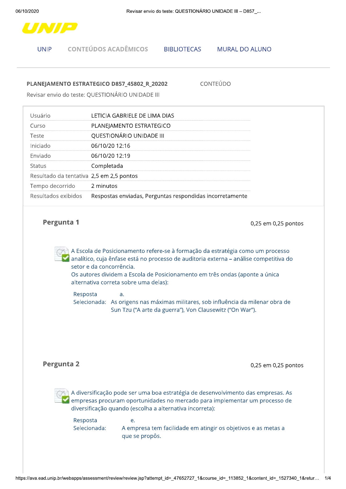 AVA - UNIP - Questionário Unidade III - Planejamento Estratégico