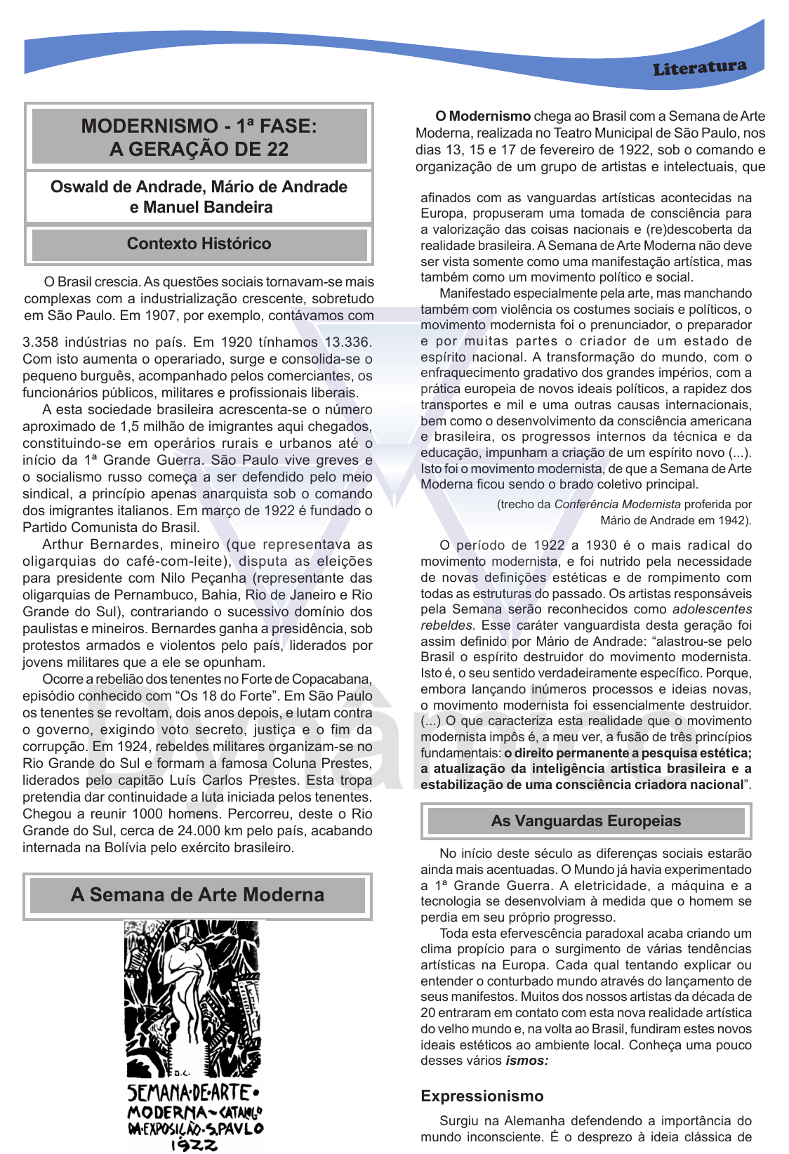 Literatura MODERNISMO - 1ª FASE: A GERAÇÃO DE 22 Oswald de Andrade, Mário de Andrade e Manuel Bandeira Contexto Histórico O Brasil crescia. As questões sociais tornavam-se mais complexas com a industrialização crescente, sobretudo em São Paulo. Em 1907, por exemplo, contávamos com 3.358 indústrias no país. Em 1920 tínhamos 13.336. Com isto aumenta o operariado, surge e consolida-se o pequeno burguês, acompanhado pelos comerciantes, os funcionários públicos, militares e profissionais liberais. A esta sociedade brasileira acrescenta-se o número aproximado de 1,5 milhão de imigrantes aqui chegados, constituindo-se em operários rurais e urbanos até o início da 1ª Grande Guerra. São Paulo vive greves e o socialismo russo começa a ser defendido pelo meio sindical, a princípio apenas anarquista sob o comando dos imigrantes italianos. Em março de 1922 é fundado o Partido Comunista do Brasil. Arthur Bernardes, mineiro (que representava as oligarquias do café-com-leite), disputa as eleições para presidente com Nilo Peçanha (representante das oligarquias de Pernambuco, Bahia, Rio de Janeiro e Rio Grande do Sul), contrariando o sucessivo domínio dos paulistas e mineiros. Bernardes ganha a presidência, sob protestos armados e violentos pelo país, liderados por jovens militares que a ele se opunham. Ocorre a rebelião dos tenentes no Forte de Copacabana, episódio conhecido com “Os 18 do Forte”. Em São Paulo os tenentes se revoltam, dois anos depois, e lutam contra o governo, exigindo voto secreto, justiça e o fim da corrupção. Em 1924, rebeldes militares organizam-se no Rio Grande do Sul e formam a famosa Coluna Prestes, liderados pelo capitão Luís Carlos Prestes. Esta tropa pretendia dar continuidade a luta iniciada pelos tenentes. Chegou a reunir 1000 homens. Percorreu, deste o Rio Grande do Sul, cerca de 24.000 km pelo país, acabando internada na Bolívia pelo exército brasileiro. A Semana de Arte Moderna O Modernismo chega ao Brasil com a Semana de Arte Moderna, realizada no Teatro Municipal de São Paulo, nos dias 13, 15 e 17 de fevereiro de 1922, sob o comando e organização de um grupo de artistas e intelectuais, que afinados com as vanguardas artísticas acontecidas na Europa, propuseram uma tomada de consciência para a valorização das coisas nacionais e (re)descoberta da realidade brasileira. A Semana de Arte Moderna não deve ser vista somente como uma manifestação artística, mas também como um movimento político e social. Manifestado especialmente pela arte, mas manchando também com violência os costumes sociais e políticos, o movimento modernista foi o prenunciador, o preparador e por muitas partes o criador de um estado de espírito nacional. A transformação do mundo, com o enfraquecimento gradativo dos grandes impérios, com a prática europeia de novos ideais políticos, a rapidez dos transportes e mil e uma outras causas internacionais, bem como o desenvolvimento da consciência americana e brasileira, os progressos internos da técnica e da educação, impunham a criação de um espírito novo (...). Isto foi o movimento modernista, de que a Semana de Arte Moderna ficou sendo o brado coletivo principal. (trecho da Conferência Modernista proferida por Mário de Andrade em 1942). O período de 1922 a 1930 é o mais radical do movimento modernista, e foi nutrido pela necessidade de novas definições estéticas e de rompimento com todas as estruturas do passado. Os artistas responsáveis pela Semana serão reconhecidos como adolescentes rebeldes. Esse caráter vanguardista desta geração foi assim definido por Mário de Andrade: “alastrou-se pelo Brasil o espírito destruidor do movimento modernista. Isto é, o seu sentido verdadeiramente específico. Porque, embora lançando inúmeros processos e ideias novas, o movimento modernista foi essencialmente destruidor. (...) O que caracteriza esta realidade que o movimento modernista impôs é, a meu ver, a fusão de três princípios fundamentais: o direito permanente a pesquisa estética; a atualização da inteligência artística brasileira e a estabilização de uma consciência criadora nacional”. As Vanguardas Europeias No início deste século as diferenças sociais estarão ainda mais acentuadas. O Mundo já havia experimentado a 1ª Grande Guerra. A eletricidade, a máquina e a tecnologia se desenvolviam à medida que o homem se perdia em seu próprio progresso. Toda esta efervescência paradoxal acaba criando um clima propício para o surgimento de várias tendências artísticas na Europa. Cada qual tentando explicar ou entender o conturbado mundo através do lançamento de seus manifestos. Muitos dos nossos artistas da década de 20 entraram em contato com esta nova realidade artística do velho mundo e, na volta ao Brasil, fundiram estes novos ideais estéticos ao ambiente local. Conheça uma pouco desses vários ismos: Expressionismo Surgiu na Alemanha defendendo a importância do mundo inconsciente. É o desprezo à ideia clássica de Literatura Beleza. Por isso a importância da expressão captada pelo artista, a materialização, numa tela, por exemplo, de imagens nascidas em nosso subconsciente a partir de um objeto. O Expressionismo se deu mais na pintura, iniciado por Eduard Münch, Van Gogh, Cèzanne e Gauguin. Contrastes, cores fortes, deformações figurativas são elementos comuns na pintura expressionista. Pela importância da subjetividade, logo notamos a relação possível entre este movimento e as ideias da poesia simbolista. Também no cinema, sobretudo alemão, irá vingar esta estética “exagerada”. Assista, por exemplo, ao Gabinete do Dr. Caligari. No Brasil, pintores como Anita Mafaltti (realizou uma “escandalosa” exposição em 1917) e Lasar Segall serão influenciados diretamente pelas ideias expressionistas. O homem amarelo - Anita Malfatti. Cubismo Desenvolveu-se inicialmente na pintura de Pablo Picasso, valorizando as formas geom