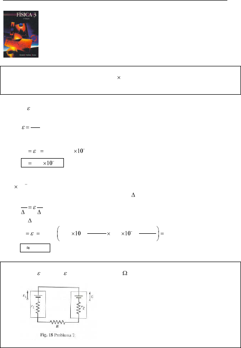 Problemas Resolvidos de Física Prof. Anderson Coser Gaudio – Depto. Física – UFES ________________________________________________________________________________________________________ Resnick, Halliday, Krane - Física 3 - 4 a Ed. - LTC - 1996. Cap. 33 – Circuitos de Corrente Contínua 1 RESNICK, HALLIDAY, KRANE, FÍSICA, 4.ED., LTC, RIO DE JANEIRO, 1996. FÍSICA 3 CAPÍTULO 33 – CIRCUITOS DE CORRENTE CONTÍNUA 02. (a) Qual o trabalho realizado por uma fonte de fem de 12 V sobre um elétron que vai do seu terminal positivo até o negativo? (b) Se 3,40 10 18 elétrons passam através da fonte, por segundo, qual a potência de saída da fonte? (Pág. 128) Solução. (a) A fem de uma fonte de potencial é definida como sendo o trabalho, por unidade de carga, gasto para transportar cargas de um pólo ao outro da fonte. Ou seja: dW dq O trabalho médio W para transportar uma carga q será dado por: 1912 V 1,60 CW q (1) 181,92 JW É bom lembrar que, por definição, a energia gasta para transportar um elétron contra um potencial V é numericamente igual a V, expresso em elétrons-volt (eV). No presente caso, W = 12 eV (1 eV = 1,60 10 19 J). (b) Vamos dividir a Eq. (1) por um intervalo de tempo t para obter a potência média da fonte: W q t t O termo q/ t corresponde à corrente elétrica média i que atravessa a fonte. 18 19elétrons C12 V 3,40 1,60 6,528 W s elétron P i 6,53 WP 07. Qual deve ser o valor de R, no circuito da Fig. 18, para que a corrente seja igual a 50 mA? Considere 1 = 2,0 V, 2 = 3,0 V e r1 = r2 = 3,0 . (b) Qual será, então, a potência dissipada sob a forma de calor na resistência R? (Pág. 126) Problemas Resolvidos de Física Prof. Anderson Coser Gaudio – Depto. Física – UFES ________________________________________________________________________________________________________ Resnick, Halliday, Krane - Física 3 - 4 a Ed. - LTC - 1996. Cap. 33 – Circuitos de Corrente Contínua 2 Solução. (a) Vamos aplicar a lei das malhas de Kirchhoff ao circuito, arbitrando o sentido da corrente como anti-horário e percorrendo-o nesse sentido a partir da extremidade superior direita. 1 1 2 2 0ir iR ir 2 1 1 2 3 3,0 V 2,0 V 3,0 3,0 50 10 A R r r i 14 R (b) A potência dissipada por R será: 22 14 50 mA 0,035 WP Ri 35 mWP [Início] 08. A corrente num circuito de malha única é 5,0 A. Quando uma resistência adicional de 2,0 é colocada em série, a corrente cai para 4,0 A. Qual era a resistência no circuito original? (Pág. 127) Solução. Considere o seguinte esquema da situação: Como a fem da fonte de potencial do circuito não variou, temos: 1 1 1 2 2R i R R i 1 1 2 2 2R i i R i 2 1 2 1 2 4,0 A 2,0 5,0 A 4,0 A i R R i i 1 8,0 R 08. A corrente num circuito de malha única é 5,0 A. Quando uma resistência adicional de 2,0 é colocada em série, a corrente cai para 4,0 A. Qual era a resistência no circuito original? (Pág. 127) Solução. Considere o seguinte esquema da situação: R1 i1 R1 i2 R2 Problemas Resolvidos de Física Prof. Anderson Coser Gaudio – Depto. Física – UFES ________________________________________________________________________________________________________ Resnick, Halliday, Krane - Física 3 - 4 a Ed. - LTC - 1996. Cap. 33 – Circuitos de Corrente Contínua 3 Como a fem da fonte de potencial do circuito não variou, temos: 1 1 1 2 2R i R R i 1 1 2 2 2R i i R i 2 1 2 1 2 4,0 A 2,0 5,0 A 4,0 A i R R i i 1 8,0 R 11. O motor de arranque de um automóvel gira muito devagar, e o mecânico tem de decidir entre substituir o motor, o cabo ou a bateria. O manual do fabricante diz que a bateria de 12 V não pode ter mais de 0,020 de resistência interna, o motor não pode ter mais de 0,200 de resistência e o cabo não pode ter mais de 0,040 de resistência. O mecânico liga o motor e mede 11,4 V na bateria, 3,0 V entre os extremos do cabo e uma corrente de 50 A. Qual parte está com defeito? (Pág. 127) Solução. Considere o seguinte esquema: Em primeiro lugar vamos verificar o valor da resistência interna, r, da bateria. Para isso vamos computar a diferença de potencial nos terminais da bateria, VBat. a bV ir V a bV V ir BatV ir Bat 12 V 11,4 V 0,012 50 A V r i Como a bateria pode ter resistência interna de até 0,020 , ela está em bom estado. Agora vamos verificar a resistência do cabo, RCabo. Cabo Cabo 3,0 V 0,060 50 A V R i R1 i1 R1 i2 R2 V V VBat VCabo r RMotor RCabo Problemas Resolvidos de Física Prof. Anderson Coser Gaudio – Depto. Física – UFES ________________________________________________________________________________________________________ Resnick, Halliday, Krane - Física 3 - 4 a Ed. - LTC - 1996. Cap. 33 – Circuitos de Corrente Contínua 4 Como a resistência do cabo não pode ser maior do que 0,040 , o cabo deverá ser trocado. Vamos ainda verificar a resistência do motor, RMotor. Cabo Motor 0iR iR ir Motor Cabo 12 V 0,060 0,012 0,168 50 A R R r i Motor 0,17 R Como a tolerância para a resistência interna do motor é de 0,200 , este está em bom estado. 13. Uma célula solar gera uma diferença de potencial de 0,10 V quando ligada a um resistor de 500 e uma diferença de potencial de 0,16 V quando ligada a um resistor de 1.000 . Quais são (a) a resistência interna e (b) a fem da célula solar? (c) A área da célula é 5,0 cm 2 e a intensidade da luz que a atinge é 2,0 mW/cm 2 . Qual a eficiência da célula em converter energia da luz em energia interna no resistor de 1.000 ? (Pág. 127) Solução. Considere o seguinte esquema da situação: (a) Aplicando-se a lei das malhas de Kirchhoff ao circuito da esquerda teremos: 1 1 1 0i R i r 1 1i R r (1) Fazendo o mesmo para o circuito da direita: 2 2i R r (2) Igualando-se (1) e (2) e resolvendo-se para r: 1 1 2 2 2 1 i R i R r i i (3) Agora temos de calcular as correntes i1 e i2. Para isso basta se utilizar das diferenças de potencial nos terminais dos resistores R1 e R2. 4 1 1 0,10 V 2,0 10 A 500 abVi R 4 2 2 0,16 V 1,6 10 A 1.000 abVi R Substitui