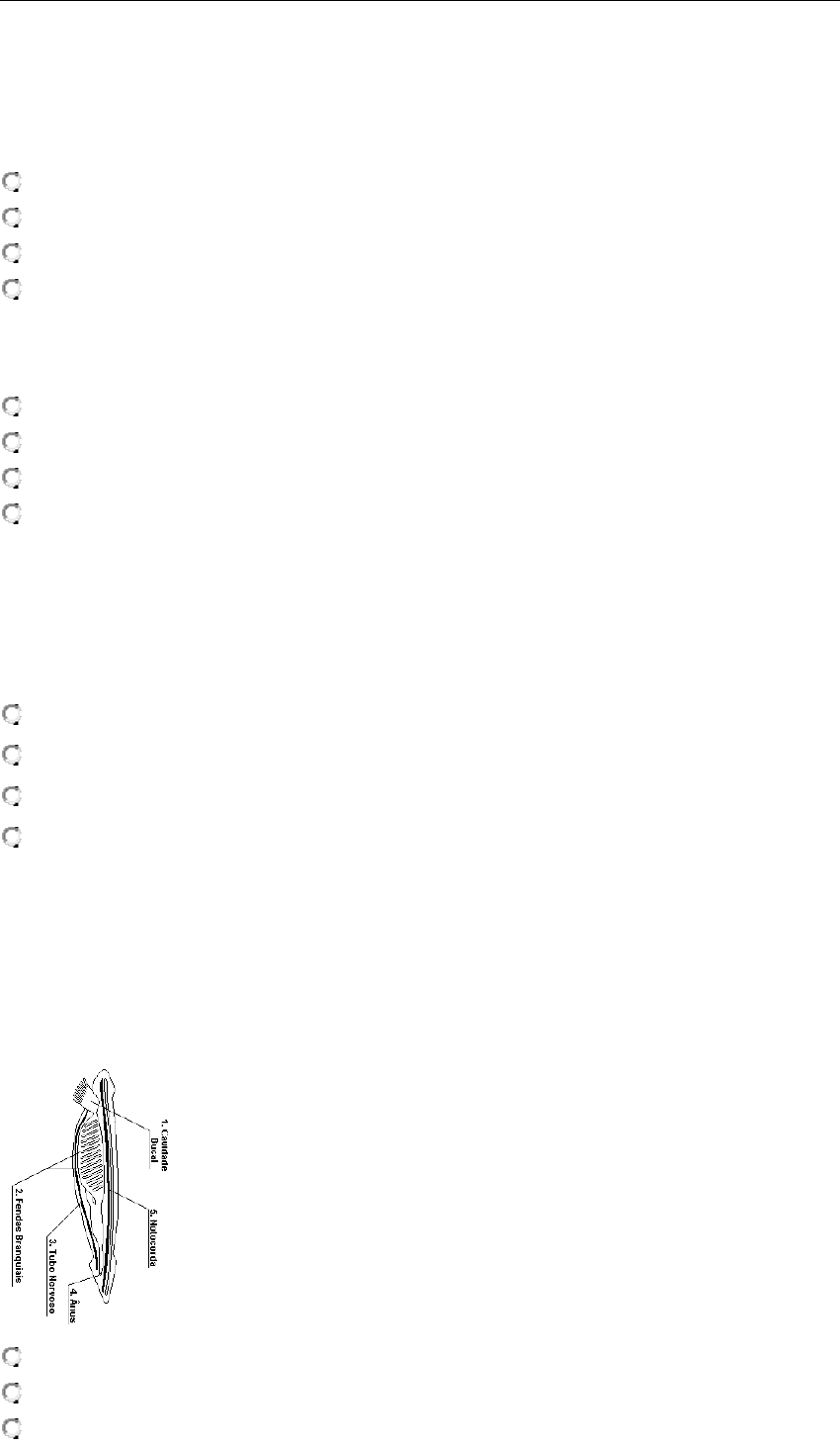 Disciplina: Zoologia de Vertebrados (BID23) Avaliação: Avaliação I - Individual Semipresencial ( Cod.:637755) ( peso.:1,50) Prova Objetiva: 17970134 Parte superior do formulário 1. Também conhecido como urocordados ou tunicados, o subfilo Urochordata é composto por aproximadamente 3.000 espécies. São animais marinhos, sésseis (fixos), que vivem aderidos a rochas ou a outras estruturas encontradas nos oceanos. Apresentam algumas poucas espécies de vida livre e seu tamanho varia de milímetros até mais de 10 cm, podem ser solitários ou coloniais. Uma característica interessante desses animais é a de possuir o corpo revestido por uma espessa túnica ou carapaça, a qual originou seu antigo nome, Tunicados. É considerando um dos precursores dos vertebrados, sendo que a maior semelhança com estes está presente em suas larvas e não nos indivíduos adultos. Com relação à grande semelhança das larvas dos tunicados com os vertebrados, assinale a alternativa CORRETA: a) Mandíbula. b) Esqueleto. c) Notocorda. d) Fendas branquiais. 2. Uma das principais características dos cordados pode ser definida da seguinte forma: trata-se de um tubo forte, porém com boa flexibilidade, que permitiu aos animais fixar músculos responsáveis por permitir um deslocamento mais eficiente. Com relação a essa definição, assinale a alternativa CORRETA que apresenta a respectiva estrutura a que a definição se refere: a) Cauda pós-anal. b) Tubo nervoso dorsal. c) Endóstilo. d) Notocorda. 3. Uma reportagem em um site de notícias, com o título: Fóssil Contraria teorias sobre Evolução de Vertebrados, relatou sobre a descoberta da mais antiga caixa craniana já encontrada de uma espécie de peixe semelhante ao tubarão, demonstrando, assim, que algumas das suposições sobre a evolução inicial dos vertebrados estão "completamente erradas", isso na opinião de alguns especialistas. Com relação à evolução e estrutura dos vertebrados, assinale a alternativa CORRETA: FONTE: https://www.terra.com.br/noticias/ciencia/fossil-contraria-teorias-sobre-evolucao-de-vertebrados,75281557419ea310VgnCLD200000bbcceb0aRCRD.html. Acesso em: 30 mar. 2020. a) Os vertebrados devem apresentar em algum momento da sua vida uma estrutura rígida de sustentação denominada notocorda que permite ao corpo do animal se desenvolver em volta de um eixo de sustentação. b) Apesar dos estudos traçarem novas características sobre sua origem, uma das características fundamentais aos vertebrados e seus antecessores é a presença de um coração com quatro cavidades. c) De acordo com o texto, o crânio de uma recente espécie de tubarão mudou tudo aquilo que era conhecido, sobre história evolutiva e da origem dos vertebrados que a princípio estava toda errada. d) Uma das características diagnósticas dos vertebrados é a presença de uma região encefálica, ou seja, de uma "cabeça" bem determinada e com função de proteção para o cérebro. 4. O animal da figura é o anfioxo. Ele é um dos cordados mais primitivos que se conhece e que ainda está vivo em nosso planeta. O anfioxo apresenta diversas estruturas que compõe os antepassados dos vertebrados e estudá-lo, portanto, é uma das formas de aprender como eram os nossos antepassados no momento em que os primeiros vertebrados teriam surgido. Entre as características nomeadas na figura, uma delas funcionou como eixo de fixação para a musculatura, permitindo que os animais, a partir do surgimento dela, conseguissem se deslocar com muito mais eficiência. Sobre a denominação dessa estrutura, assinale a alternativa CORRETA: FONTE: http://portal.virtual.ufpb.br/biologia/novo_site/Biblioteca/Livro_4/4-Vetebrados.pdf. Acesso em: 31 mar. 2020. a) Notocorda. b) Fendas branquiais. c) Cavidade bucal. d) Tubo nervoso. 5. Para compreender o surgimento dos cordados vertebrados, faz-se necessário conhecer brevemente outros três grupos. São eles: Hemichordata, Urochordata e Cephalochordata. Esses três grupos possuem as características que formarão os vertebrados, portanto, compreender como essas características se desenharam nesses grupos é fundamental. Com base no exposto, associe os itens, utilizando o código a seguir: I- Hemicordados. II- Ascídias. III- Cefalocordados. ( ) Os anfioxos possuem uma notocorda bem desenvolvida ao longo de todo o corpo. ( ) Possuem probóscide, chamada de estomocorda. ( ) São sésseis e possuem um sifão exalante e um sifão inalante. Assinale a alternativa que apresenta a sequência CORRETA: a) II - III - I. b) I - II - III. c) III - I - II. d) III - II - I. 6. No filo Chordata, o que se observa de características em seus representantes é que, em pelo menos alguma etapa do seu ciclo de vida, há um tubo neural que origina o sistema nervoso e as fendas faríngeas, que podem ser utilizadas para respiração aquática. Sobre exemplos de animais pertencentes ao filo Chordata, analise as opções a seguir: I- Tubarões. II- Escorpiões. III- Capivaras. IV- Cnidários. Assinale a alternativa CORRETA: a) As opções I e III estão corretas. b) As opções I, II e III estão corretas. c) As opções I e IV estão corretas. d) As opções I, III e IV estão corretas. 7. Uma das características empregadas para se classificar os animais em vertebrados ou invertebrados é o desenvolvimento embrionário. Nesse aspecto, uma importante diferença é a estrutura originada pelo blastóporo (abertura presente na gástrula). Nesse sentido, em um animal denominado protostômio, o blastóporo originará qual estrutura corporal? a) Ânus. b) Cérebro. c) Boca. d) Tronco. 8. Os cordados são representados pelos agnatos, peixes, anfíbios, répteis, aves e mamíferos e compartilham algumas características. Uma das características diagnósticas desse grupo é que em algum momento do seu desenvolvimento eles apresentarão uma haste fibrosa, no dorso, cuja função é sustentar o corpo e permitir a fixação de músculos. Sobre essa estrut