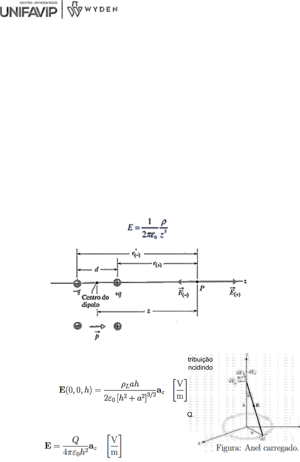 ELETROMAGNETISMO Exercícios Propostos 2 – Campos Eletrostáticos 01. Calcule o campo elétrico no ponto (0, 0, 5 m) em função das cargas: Q1 = 0,35 µC em (0, 4 m, 0) e Q2 = −0,55 µC em (3 m, 0, 0). Resposta: ER = 74,9 ax − 48,0 ay − 64,9 az [V/m] 02. Uma carga de −1 nC está localizada na origem no espaço livre. Qual o valor da carga que deve ser posicionada em (2, 0, 0) m para que Ex seja zero em (3, 1, 1) m? Resposta: Q = 0,43 nC 03. Encontre E no ponto P(1, 1, 1) m devido a presença de quatro cargas pontuais idênticas de 3 nC localizadas em P1(1, 1, 0) m, P2(−1, 1, 0) m, P3(−1, −1, 0) m e P4(1, −1, 0) m. Resposta: E = 6,82 ax + 6,82 ay + 32,8 az [V/m] 04. A figura mostra duas partículas carregadas de intensidade q mas de sinais contrários, separadas de uma distância d. Supondo-se que Z d , mostre que o campo elétrico deste dipolo elétrico (ρ = q · d), em um ponto P, uma distância Z do ponto médio do dipolo e sobre o eixo que passa pelo centro das partículas é dado pela expressão: 05. Um anel circular de raio a está carregado com uma distribuição uniforme de carga ρL [C/m] e está no plano xy com seu eixo coincidindo com o eixo z. a) Demonstre que: b) Determine E para a → 0, supondo carga total do anel igual a Q. Resposta: b) ELETROMAGNETISMO 06. A figura seguinte mostra uma seção de uma barra cilíndrica de plástico infinitamente longa, com uma densidade linear de carga positiva uniforme λ = 5 nC/m. Determine a intensidade do campo elétrico E a uma distância r = 0,20 m do eixo da barra. Resposta: E = 450 N/C 07. Uma carga pontual de 30 nC está localizada na origem, enquanto que um plano em y = 3 está carregado com 10 nC/m². Determine D em (0, 4, 3). Resposta: D = 5,076 ay + 0,0573 az [nC/m²] 08. A figura a seguir mostra dois pontos i e f em um campo elétrico uniforme de intensidade igual a E = 6,2 kV/m. Sendo d = 5 m, determine a diferença de potencial Vf − Vi movendo a carga de teste positiva q0 = 4,2 mC de i até f ao longo da trajetória icf mostrada na figura. Resposta: Vf − Vi = 31 kV 09. Uma carga total de (40/3) nC é uniformemente distribuída sobre um disco circular de 2 m de raio. Encontre o potencial de um ponto distante 5 m do plano do anel e pertencente a um eixo que passa pelo seu centro. Resposta: V = 23, 1 V 10. Dado o campo elétrico E = (3x² + y) ax + x ay [kV/m], determine o trabalho realizado ao movimentar uma carga de -2 µC do ponto (0, 5, 0) m até o ponto (2, -1, 0) usando a trajetória: (a) (0, 5, 0) ↦ (2, 5, 0) ↦ (2, -1, 0); (b) y = 5 – 3 x Resposta: (a) 12 mJ, (b) 12 mJ