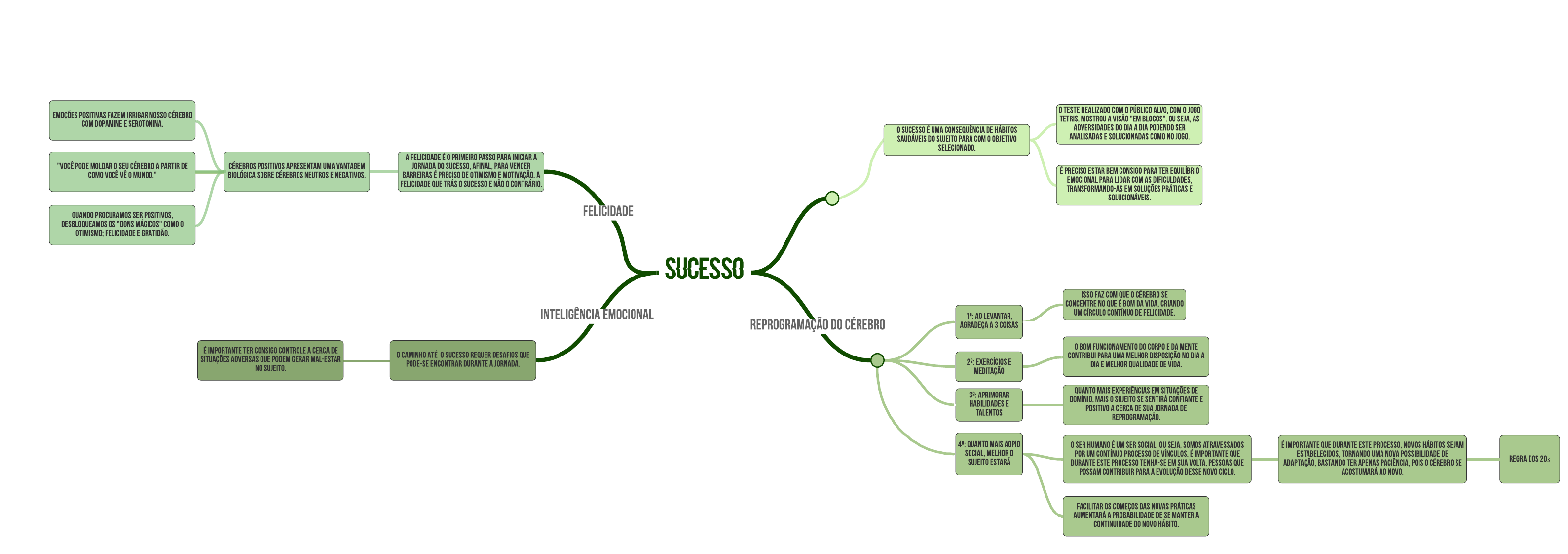 Sucesso Reprogramação do cérebro Intel igência emocional Fel icidade 1º: Ao levantar, agradeça a 3 coisas 2º: Exercícios e meditação 3º: Aprimorar habil idades e talentos 4º: Quanto mais aopio social , melhor o sujeito estará Isso faz com que o cérebro se concentre no que é bom da vida, criando um círculo contínuo de fel icidade. O bom funcionamento do corpo e da mente contribui para uma melhor disposição no dia a dia e melhor qual idade de vida. Quanto mais experiências em situações de domínio, mais o sujeito se sentirá confiante e posit ivo a cerca de sua jornada de reprogramação. O ser humano é um ser social , ou seja, somos atravessados por um contínuo processo de vínculos. é importante que durante este processo tenha-se em sua volta, pessoas que possam contribuir para a evolução desse novo ciclo. Facil itar os começos das novas práticas aumentará a probabil idade de se manter a continuidade do novo hábito. É importante que durante este processo, novos hábitos sejam estabelecidos, tornando uma nova possibil idade de adaptação, bastando ter apenas paciência, pois o cérebro se acostumará ao novo. Regra dos 20s o SUCESSO É UMA CONSEQUÊNCIA DE HÁBITOS SAUDÁVEIS DO SUJEITO PARA COM O OBJETIVO SELECIONADO. o TESTE REALIZADO COM O PÚBLICO ALVO, COM O JOGO tETRIS, MOSTROU A VISÃO "EM BLOCOS". oU SEJA, AS ADVERSIDADES DO DIA A DIA PODENDO SER ANALISADAS E SOLUCIONADAS COMO NO JOGO. é PRECISO ESTAR BEM CONSIGO PARA TER EQUILÍBRIO EMOCIONAL PARA LIDAR COM AS DIFICULDADES, TRANSFORMANDO-AS EM SOLUÇÕES PRÁTICAS E SOLUCIONÁVEIS. A FELICIDADE É O PRIMEIRO PASSO PARA INICIAR A JORNADA DO SUCESSO, AFINAL, PARA VENCER BARREIRAS É PRECISO DE OTIMISMO E MOTIVAÇÃO. a FELICIDADE QUE TRÁS O SUCESSO E NÃO O CONTRÁRIO. O CAMINHO ATÉ O SUCESSO REQUER DESAFIOS QUE PODE-SE ENCONTRAR DURANTE A JORNADA. É IMPORTANTE TER CONSIGO CONTROLE A CERCA DE SITUAÇÕES ADVERSAS QUE PODEM GERAR MAL-ESTAR NO SUJEITO. cÉREBROS POSITIVOS APRESENTAM UMA VANTAGEM BIOLÓGICA SOBRE CÉREBROS NEUTROS E NEGATIVOS. eMOÇÕES POSITIVAS FAZEM IRRIGAR NOSSO CÉREBRO COM dOPAMINE E sEROTONINA. "vOCÊ PODE MOLDAR O SEU CÉREBRO A PARTIR DE COMO VOCÊ VÊ O MUNDO." qUANDO PROCURAMOS SER POSITIVOS, DESBLOQUEAMOS OS "DONS MÁGICOS" COMO O OTIMISMO; FELICIDADE E GRATIDÃO. Mapa Mental Sucesso Mapa mental com linhas