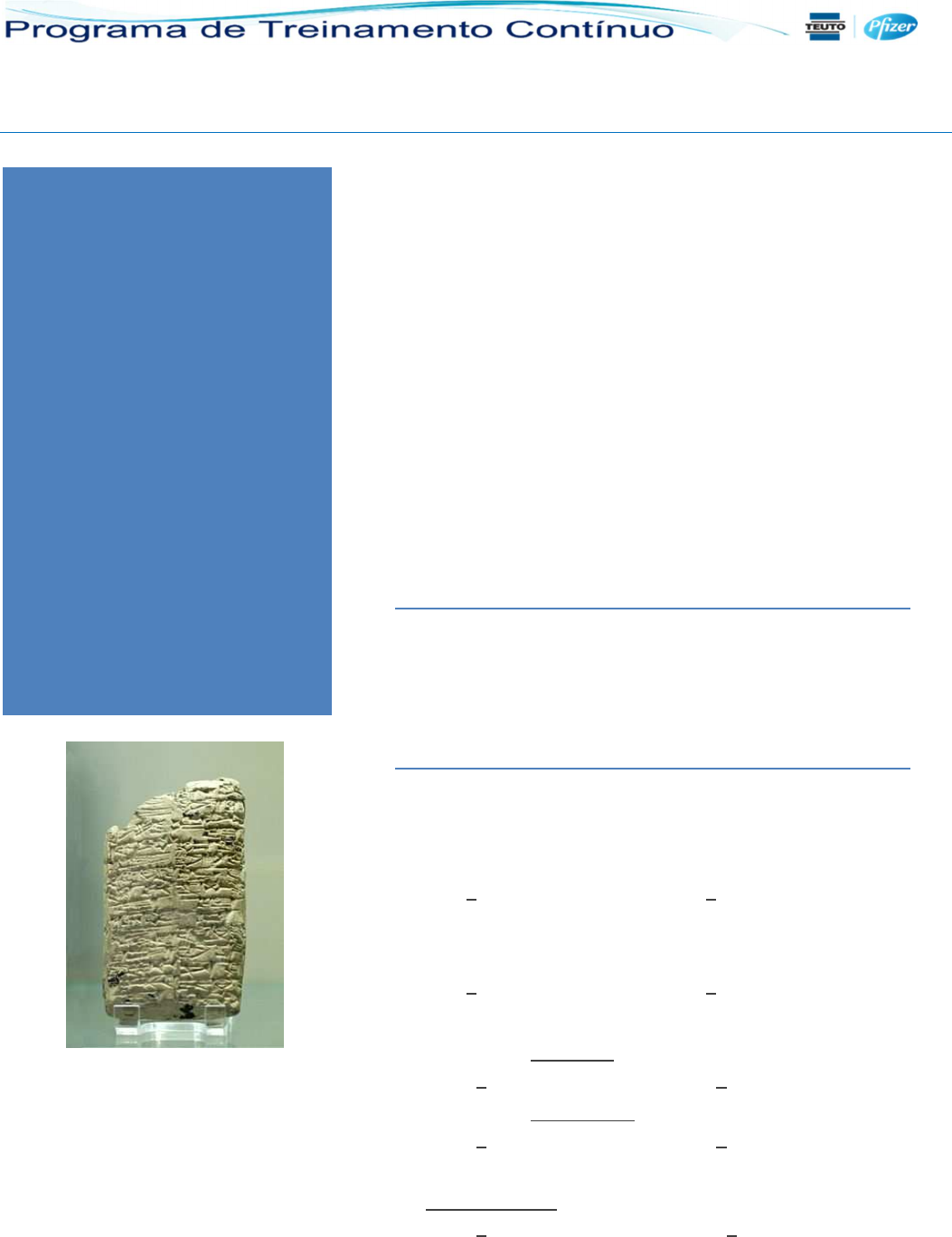 ALGARISMOS SIGNIFICATIVOS E ARREDONDAMENTO INTRODUÇÃO O termo algarismo significativo refere-se ao número mínimo de algarismos necessários para expressar o valor de uma medida experimental sem perda de exatidão. Nas análises laboratoriais, o último algarismo de um resultado é considerado incerto, porém ainda é significativo para a medida obtida. Arredondamento de casas decimais é a alteração de um valor numérico por outro aproximadamente equivalente. Ao efetuar os ensaios experimentais, os valores obtidos devem conter um número adequado de algarismos significativos, portanto é fundamental realizar o arredondamento numérico. O arredondamento deverá ser realizado somente no final da análise. Não deve ser aplicado a cálculos e resultados parciais, pois irá ocasionar erros de análise. Etapas a) Se o dígito a ser suprimido for < 5, o algarismo permanece inalterado: Ex.: 6,43 arredondar para 6,4 e 58,324 arredondar para 58,32. b) Se o dígito a ser suprimido for > 5, aumenta-se uma unidade do algarismo anterior: Ex.: 7,76 arredondar para 7,8 e 22,679 arredondar para 22,68. c) Se o dígito a ser suprimido for = 5 existem três possibilidades: i) Antecessor dígito par, o algarismo permanece inalterado: Ex.: 0,625 arredondar para 0,62 e 784,50 arredondar para 784. ii) Antecessor dígito ímpar, adicionar uma unidade: Ex.: 0,635 arredondar para 0,64 e 18,150 arredondar para 18,2. iii) Se os próximos algarismos que seguem o número 5 forem diferentes de 0, adicionar uma unidade: Ex.: 0,6354 arredondar para 0,64 e 784,57 arredondar para 785. Referências: Brasil. Associação Brasileira de Normas Técnicas (ABNT). NBR 5891 – Regras de arredondamento na numeração decimal, 1977. Skoog, West, Hooler, Crouch. Fundamentos de Química Analítica, 9 ed., 1072 p., 2013. Túlio Pessoa de Rezende Analista da Garantia da Qualidade Laboratório Teuto – Abril/2014 A INCERTEZA É CERTA Todas as medidas de quantidades que podem assumir um intervalo contínuo de valores (distância, massa, volume etc) consistem de duas partes: o valor reportado e a incerteza associada à medição. Nesse sentido, o arredondamento de casas decimais aumenta ainda mais o erro entre o valor verdadeiro e o valor mensurado. O conceito de arredondamento é muito antigo, talvez mais do que a própria divisão. Na figura acima, uma tábua de argila encontrada na Mesopotâmia, contém tabelas com os valores arredondados de números inversos e raízes quadradas na base 60.