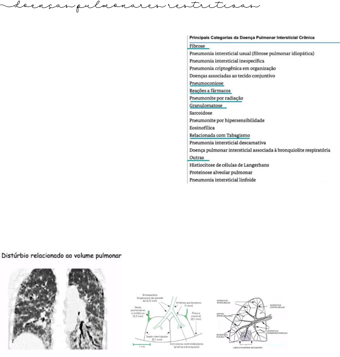 Patologias do Sistema Respiratório Pamela Barbieri – T23 – FMBM Prof. Dr. Nelson Vega ▪Doenças Pulmonares Intersticiais ▪Fibrose Pulmonar Idiopática Doenças pulmonares intersticiais crônicas: Pneumoconioses (silicose, asbestose) Doenças fibrosantes (fibrose pulmonar idiopática, sarcoidose pulmonar, pneumonia de hipersensibilidade crônica, pneumonites pós radioterapia) Neoplasias (adenocarcinomas, linfangites carcinomatoses, carcinoma lipídico). Disfunções da parede torácica: Doenças neuromusculares (poliomielite, esclerose lateral amiotrófica (ELA), cifoescoliose...) Obesidade (grau III e IV) Doenças pleurais (derrame pleural, neoplasia da pleura). Introdução: Fibrose pulmonar idiopática (Pneumonia intersticial usual): Definição de doenças pulmonares intersticiais: são um grande número de distúrbios que acometem o parênquima pulmonar – os alvéolos, o epitélio alveolar, o endotélio capilar e os espaços entre essas estruturas – bem como os tecidos perivasculares e linfáticos. Caracterizadas por Capacidade Vital Forçada < 80% - espirometria. Interstício: é um espaço cheio de cavidades preenchidas por líquido, que recobrem o tubo digestório, pulmão, sistema urinário e rodeiam artérias, veias e fáscia (considerado órgão 2012) Relacionada ao volume pulmonar e não fluxo de ar (doenças obstrutivas). Doenças restritivas afetarão interstícios – septo interlobular; interstício peribroncovascular; interstício pleural... → Fibrose Pulmonar Idiopática Se refere a uma síndrome clinicopatológica marcada por fibrose intersticial pulmonar progressiva e insuficiência respiratória. FPI é uma pneumonia intersticial crônica fibrosante, de etiologia desconhecida, que acomete principalmente idosos, e cujo substrato é a pneumonia intersticial usual. Costumam cursar com perda progressiva da função pulmonar e grave comprometimento da qualidade de vida, evoluindo para óbito. Epidemiologia: Brasil: incidência anual de casos de FPI: 6.841 e 9997 casos (3,5 a 5,1 por 100.000 hab). Patologias do Sistema Respiratório Pamela Barbieri – T23 – FMBM Prof. Dr. Nelson Vega Prevalência: 13.945 e 18,305 casos (7,1 a 9,4 por 100.000 hab). Muito rara em jovens. Indivíduos > 55 anos: prevalência de 9986 e 16109 casos (5,1 a 8,3 por 100.000 hab). • Etiologia: Causas desconhecidas. Predisposições genéticas: mutações germinativas de perda de função dos genes TERT e TERC (responsáveis por decodificar os componentes de telomerases), mutações de surfactante. 1/3 dos casos da FPI: apresentam uma variante genética comum, responsável por aumentar a secreção de MUC5B, uma mucina que pode deixar as células epiteliais alveolares suscetíveis às lesões ou eventos contrarreguladores exagerados que levam à fibrose. • Fatores de risco: Ambientais: tabagismo, fumaça de metais e poeiras de madeiras; Profissões: agricultura, cabelereiros e polimento de pedras. Refluxo gastresofágico. Para evoluir para fibrose, paciente tem predisposição genética associada a fatores de risco. Epitélio respiratório em risco = lesão epitelial persistente. Epitélio lesado/ativado + estímulos liberados de células inatas e adaptativas responsivas aos sinais de “perigo”. Ativam fibroblastos intersticiais. Anormalidades na sinalização (aumento de sinalizações através da via PI3K/AKT). Fibroblasto ativado sintetiza e deposita o colágeno, resultando em fibrose intersticial. Leva a insuficiência respiratória. • Patogenia: Microscopia: identificação de padrão PIU Patologias do Sistema Respiratório Pamela Barbieri – T23 – FMBM Prof. Dr. Nelson Vega ▪Fibrose intersticial focal ▪Proliferação fibroblástica exuberante (foco fibroblásticos) – lesões mais precoses. ▪Coexistência de lesões precoces e tardias é bastante típica. ▪Fibrose em favo de mel – destruição da arquitetura alveolar e a formação de espaços císticos revestidos por pneumócitos tipo II hiperplásicos ou epitélio bronquiolar). ▪Inflamação dentro das áreas fibróticas (principalmente com linfócitos; infiltrado linfoplasmocitário). • Diagnóstico: Clínico: sinais e sintomas (fatores de risco) + espirometria com distúrbio restritivo (CVF < 80%) + Imagem: TC de tórax + Biopia pulmonas (casos selecionados) broncoscopia ou videotoracoscopia. Principais sintomas clínicos: dispneia crônica progressiva, baixa tolerância aos exercícios físicos, tosse seca crônica. É mias comum em homens maiores de 50 anos, tabagistas ou ex tabagistas, expostos a fatores de risco. Exame físico: queda de saturação de O2 progressiva, hipocratismo digital em 20% dos casos, estertores finos em velcro bilaterais. Diagnóstico funcional – espirometria – prova de função pulmonar: Relação VEF1/CVF > 0,7 CVF < 80% Patologias do Sistema Respiratório Pamela Barbieri – T23 – FMBM Prof. Dr. Nelson Vega Diagnóstico de imagem – TC de tórax de alta resolução: Anormalidade reticular predominante periférica bibasal. Bronquiectasia de tração. Aspecto em favo de mel. Diagnóstico patológico – biopsia pulmonar por broncoscopia ou videotoracoscopia. Tratamento: medidas não farmacológicas e farmacológicas; transplante de pulmão. Não farmacológicas: cessar tabagismo; vacina influenza, streptococos; O2 suplementar/domiciliar; reabilitação pulmonar. Doenças coexistente: DRGE, câncer de pulmão, DPOC, distúrbios do sono, cor pulmonale. Farmacológicos: perfinidona e nintedanibe – controlam fibrose, mas não revertem. Patologias do Sistema Respiratório Pamela Barbieri – T23 – FMBM Prof. Dr. Nelson Vega Complicações: Insuficiência respiratória crônica progressiva, com necessidade de uso de O2 domiciliar. Associação com DPOC Pneumotórax espontâneo Risco maior de câncer de pulmão Cor pulmonale / HAP TEP Prognóstico: doença grave com prognóstico ruim. Sobrevida média de 3 anos de vida. Após diagnóstico, sobrevida máxima de 10 an