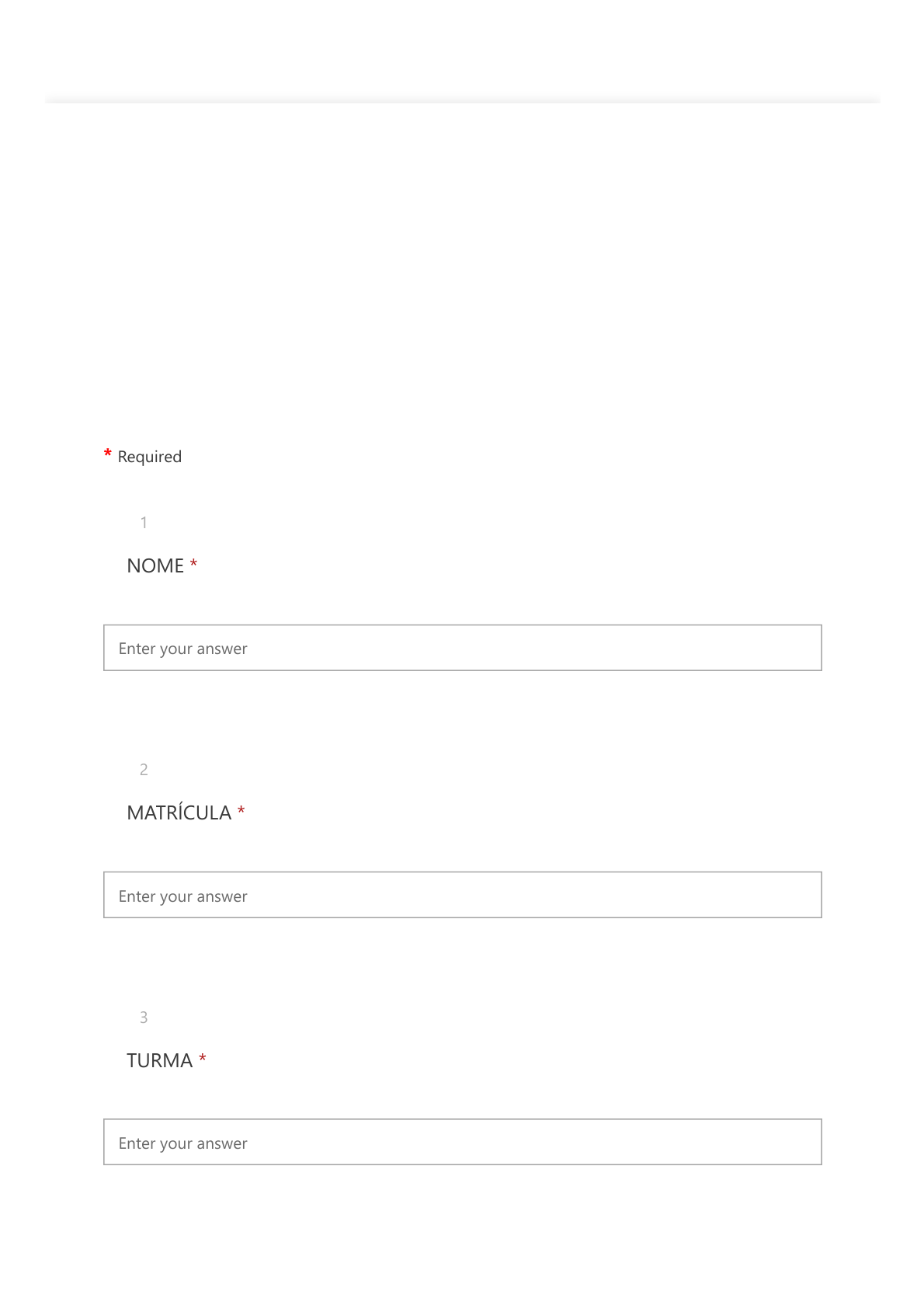 08/10/2020 Dimensões Biológicas - Exercício de Revisão https://forms.office.com/Pages/ResponsePage.aspx?id=DQSIkWdsW0yxEjajBLZtrQAAAAAAAAAAAANAAfvDQz5UNE9DS1ZXQjRXSVlUR0I3… 1/19 Dimensões Biológicas - Exercício de Revisão Profa. Carolinie Cruz - 2020/2 * Required 1 NOME * Enter your answer 2 MATRÍCULA * Enter your answer 3 TURMA * Enter your answer 08/10/2020 Dimensões Biológicas - Exercício de Revisão https://forms.office.com/Pages/ResponsePage.aspx?id=DQSIkWdsW0yxEjajBLZtrQAAAAAAAAAAAANAAfvDQz5UNE9DS1ZXQjRXSVlUR0I3… 2/19 A sequência correta, de cima para baixo, é: 4 Relacione, corretamente, os tipos celulares apresentados com suas respectivas características, numerando os parênteses abaixo de acordo com a seguinte indicação: 1. Células eucariontes 2. Células procariontes ( ) Apresentam cromossomos que não são separados do citoplasma por membrana. ( ) Não apresentam membranas internas no citoplasma. A invaginação da membrana plasmática é motivo de controvérsia entre pesquisadores. ( ) Por serem células mais complexas, apresentam tamanho maior. ( ) Apresentam uma complexa rede de tubos e filamentos que define sua forma e permite a realização de movimentos. * (1 Point) 1, 2, 1, 2. 2, 2, 1, 1. 1, 2, 2, 1. 2, 1, 2, 2. Essa passagem é possibilitada pela presença do seguinte componente na membrana plasmática: 5 Macromoléculas polares são capazes de atravessar a membrana plasmática celular, passando do meio externo para o meio interno da célula. * (1 Point) proteína triglicerídeo açúcar colesterol 08/10/2020 Dimensões Biológicas - Exercício de Revisão https://forms.office.com/Pages/ResponsePage.aspx?id=DQSIkWdsW0yxEjajBLZtrQAAAAAAAAAAAANAAfvDQz5UNE9DS1ZXQjRXSVlUR0I3… 3/19 Uma grande evidência dessa teoria está no fato de as mitocôndrias e os cloroplastos serem as únicas organelas a apresentarem 6 A Teoria da Endossimbiose, proposta pela microbiologista Lynn Margulis, na década de 60, sugere que as mitocôndrias e os cloroplastos descendem de bactérias primitivas que passaram a viver dentro de células eucarióticas, há milhões de anos. Assim sendo, uma célula eucariótica primitiva teria englobado, por fagocitose, uma célula procarionte, que passou a viver em seu citoplasma, estabelecendo, assim, uma relação de mutualismo. Disponível em: <https://www.todamateria.com.br/endossimbiose/>. Acesso em: 10 de set. 2020. * (1 Point) material genético próprio. núcleo verdadeiro. membrana plasmática. parede celular de peptidoglicano. Quais estão corretas? 7 No ano de 2013, o Nobel de Medicina ou Fisiologia foi concedido para os pesquisadores que elucidaram os mecanismos de transporte de moléculas, através de vesículas, no interior das células. Considere as seguintes afirmações sobre esse tema no citoplasma de células eucarióticas. I. As proteínas produzidas pelo retículo endoplasmático rugoso são transportadas por vesículas até a face cis do complexo golgiense. II. As vesículas que contêm secreções desprendem-se do complexo golgiense e fundem-se à membrana plasmática na exocitose. III. Algumas vesículas liberadas pelo complexo golgiense irão formar os peroxissomos. * (2 Points) Apenas I. 08/10/2020 Dimensões Biológicas - Exercício de Revisão https://forms.office.com/Pages/ResponsePage.aspx?id=DQSIkWdsW0yxEjajBLZtrQAAAAAAAAAAAANAAfvDQz5UNE9DS1ZXQjRXSVlUR0I3… 4/19 Apenas I e II. I, II e III. Apenas II e III. Apenas III. 8 Em relação às macromoléculas que constituem a maioria dos seres vivos, é correto afirmar que * (1 Point) o glicogênio e o amido são polissacarídeos produzidos pelas células vegetais. os triglicerídeos e polissacarídeos são carboidratos. as enzimas e os esteroides são proteínas. os ácidos nucleicos, DNA e RNA, são formados por várias unidades chamadas de nucleotídeos. os lipídeos e os peptideoglicanos compõem a membrana plasmática de todos os eucariotos. Assinale a alternativa que preenche corretamente a lacuna do texto. 9 As células animais são compostas basicamente por três partes: membrana plasmática, citoplasma e núcleo. O citoplasma preenche a célula e nele são encontradas estruturas denominadas organelas, cada qual com sua função. Uma organela, denominada de __________, é responsável pela geração de energia para a célula. * (1 Point) Ribossomo. Retículo endoplasmático liso. Lisossomo. Mitocôndria. 08/10/2020 Dimensões Biológicas - Exercício de Revisão https://forms.office.com/Pages/ResponsePage.aspx?id=DQSIkWdsW0yxEjajBLZtrQAAAAAAAAAAAANAAfvDQz5UNE9DS1ZXQjRXSVlUR0I3… 5/19 Centríolo. Estão corretas apenas as afirmativas 10 A respeito dos transportes realizados pela membrana plasmática, considere as afirmativas. I. A utilização de proteínas transportadoras é exclusiva de transportes ativos. II. A insulina age acelerando a difusão facilitada da glicose para o interior das células. III. Íons são moléculas muito pequenas e, portanto, atravessam a membrana sempre por difusão simples. IV. Em todos os tipos de difusão, a passagem de solutos acontece a favor do gradiente de concentração. * (1 Point) I, III e IV. I e II. I, II e IV. II e IV. II, III e IV. O componente da membrana plasmática envolvido no processo de rejeição é: 11 Os diferentes tipos de transplantes representam um grande avanço da medicina. Entretanto, a compatibilidade entre doador e receptor nem sempre ocorre, resultando em rejeição do órgão transplantado. * (1 Point) colesterol glicoproteína fosfolipídeo citoesqueleto 08/10/2020 Dimensões Biológicas - Exercício de Revisão https://forms.office.com/Pages/ResponsePage.aspx?id=DQSIkWdsW0yxEjajBLZtrQAAAAAAAAAAAANAAfvDQz5UNE9DS1ZXQjRXSVlUR0I3… 6/19 Com base nas funções desempenhadas pela membrana em diferentes tipos celulares, é correto afirmar que 12 As setas 1, 2 e 3, na figura seguinte, indicam biomoléculas componentes da membrana plasmática de uma célula animal. * (1 Point) a biomolécula 2 é um 