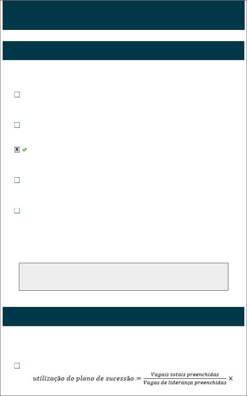 Disc.: RECRUTAMENTO E SELEÇÃO Aluno(a): ALEXSSANDRA DA COSTA GUEDES 201908662671 Acertos: 8,0 de 10,0 09/10/2020 1a Questão Acerto: 1,0 / 1,0 Sobre empresa própria, assinale a alternativa correta: empresa própria significa não ter chefe e ter mais qualidade de vida e tempo disponível; empresa própria é melhor se for feita em sociedade. as chances de sucesso da empresa diminuem consideravalmente se o empresário não tiver conhecimento nem técnico nem gerencial; montar uma incubadora de empresa é algo indicado para empresários iniciantes; empresa júnior é uma empresa normal com fins lucrativos formada por alunos de graduação; Respondido em 09/10/2020 13:58:21 Explicação: . 2a Questão Acerto: 1,0 / 1,0 Assinale a alternativa que melhor representa a fórmula para o cálculo do índice de utilização do plano de sucessão: Respondido em 09/10/2020 14:05:21 Explicação: . 3a Questão Acerto: 1,0 / 1,0 (2019 - IF-BA - IF Baiano - Assistente Em Administração) O recrutamento externo é uma forma como as organizações buscam profissionais qualificados no mercado, para atender os requisitos necessários a vaga em aberto. A respeito do tema, assinale a alternativa que indique corretamente uma vantagem da organização ao desenvolver o recrutamento externo. Ser um processo mais assertivo, rápido e econômico para a empresa. Aproveitar o investimento da organização em treinamento e desenvolvimento do pessoal. Trazer profissionais com novas ideias, possíveis vivências de experiências profissionais anteriores e energia revitalizadora à organização. Reduzir a incerteza quanto ao perfil do candidato, potencial e capacidade de desempenho das tarefas executadas. Atuar como fonte de inspiração e motivação para os funcionários atuais da empresa. Respondido em 09/10/2020 14:04:17 Explicação: . 4a Questão Acerto: 1,0 / 1,0 Qual a melhor opção para as empresas Ter recrutamento e seleção 100% online. Ter seleção 100 online e recrutamento presencial. Ter recrutamento 100% online e seleção presencial. Analisar o negócio da empresa e adaptar o uso do presencial e do online conforme o que mais se adaptar à estratégia. Necessariamente, um mix de online e presencial tanto no recrutamento quanto na seleção. Respondido em 09/10/2020 14:12:04 Explicação: . 5a Questão Acerto: 0,0 / 1,0 Considerando as características a seguir: "baseia-se na avaliação do candidato, levando-se em consideração o perfil de competências organizacionais e as competências do cargo, através de perguntas direcionadas a situações reais vivenciadas, focando ação e resultado proporcionando ao selecionador averiguar como o candidato coloca-se nas diversas situações profissionais e pessoais apresentadas, observando seu padrão de comportamento, atitude e os resultados concretos obtidos, além de perceber como reage em momentos de frustração e como lida com as suas emoções" Podemos definir qual técnica de seleção? Testes avaliativos escritos Provas orais Testes práticos Entrevista por competências Dinâmicas de grupo Respondido em 09/10/2020 14:41:59 6a Questão Acerto: 1,0 / 1,0 O advento da tecnologia tem influenciado cada vez mais as relações de trabalho, um bom exemplo dessa mudança é a ascensão do home office, assinale a seguir uma boa prática: Esperar seu novo empregador te capacitar Não aceite trabalhar em ambientes incertos Só aceite trabalhar em empresas de grande porte Espere o mercado se adaptar a sua formação Foque na empregabilidade, se adaptando a trabalhos mais flexíveis Respondido em 09/10/2020 14:25:36 Explicação: . 7a Questão Acerto: 0,0 / 1,0 A entrevista por competências baseia-se na avaliação do candidato, levando-se em consideração o perfil de competências organizacionais e as competências do cargo, através de perguntas direcionadas a situações reais vivenciadas, focando ação e resultado. Tendo como referência os estudos realizados sobre técnicas de seleção, pede-se para assinalar a ÚNICA alternativa correta: A análise curricular, nos casos em que se adota a seleção por competências, é considerada desnecessária, pois, "o papel aceita qualquer informação", segundo os estudiosos do modelo de seleção por competência, considerando assim, desnecessário ater-se à análise do currículo. A entrevista técnica ela será sempre conduzida pela equipe de RH; e a razão disso está no fato da área de RH ser responsável pela descrição e análise dos cargos, o que permite a essa área conhecimento pleno dos aspectos técnicos dos cargos. As anotações são permitidas e deve-se informar ao candidato que as mesmas ocorrerão no decorrer do tempo em que estiverem conversando. Em geral, anota-se informações pontuais para que a interação com o candidato não seja prejudicada. Durante a entrevista por competência, o selecionador deve ser parcial, pois, essa é uma exigência para que se tenha um resultado mais preciso, porque permite identificar o maior número de competências do candidato. A entrevista, quando por competências, será a única etapa do processo seletivo, pois, ela é suficientemente abrangente e, por isso, dispensa qualquer complemento para encontrar o candidato certo para o lugar certo. Respondido em 09/10/2020 14:44:51 8a Questão Acerto: 1,0 / 1,0 Diante de todas as novidades que se colocam dentro das organizações e como elas impactam seus colaboradores, por que é importante que os gestores e os departamentos de Recursos Humanos conheçam e apliquem a análise de perfis comportamentais? Para dificultar os processos de internos de promoção e movimentação. Para entender o que cada pessoa é de forma definitiva e sem mudanças. Para manter as coisas como estão e sem mudanças. Para rotular as pessoas. Para buscar o autoconhecimento e desenvolvimento continuamente, tanto de cada colaborador, como da organização. Respondido em 09/10/2020 14:26:26 Explicação: . 9a Questão Acerto: 1,0 / 1,0 U