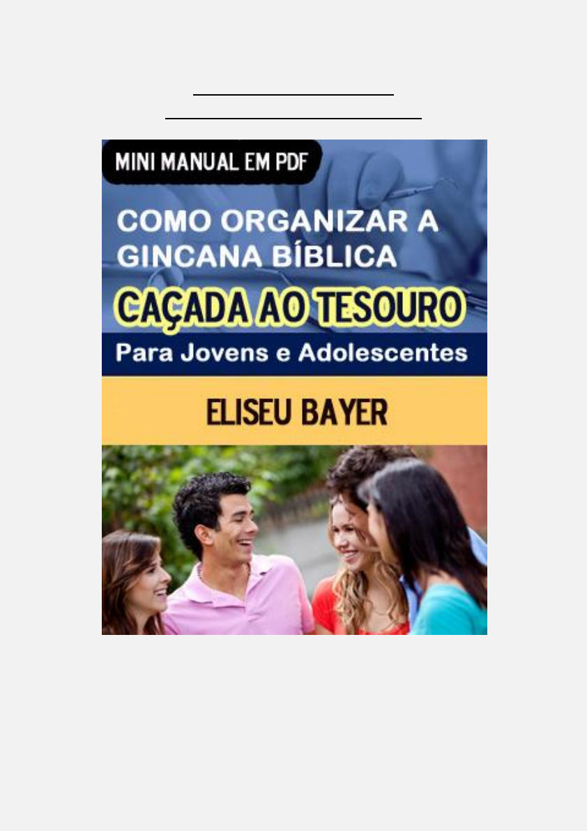 Conheça outras Gincanas Bíblicas para Jovens www.gincabiblica.com.br www.ideiasjovemcristao.com.br Conheça outras Gincanas Bíblicas para Jovens www.gincabiblica.com.br www.ideiasjovemcristao.com.br COMO ORGANIZAR A GINCANA BÍBLICA CAÇADA AO TESOURO PARA JOVENS E ADOLESCENTES de Maneira Criativa e Divertida www.ideiasjovemcristao.com.br www.ideiasparajovens.com.br http://www.ideiasjovemcristao.com.br/ http://www.ideiasparajovens.com.br/ Conheça outras Gincanas Bíblicas para Jovens www.gincabiblica.com.br www.ideiasjovemcristao.com.br Introdução Olá Líder de Jovens. Além de uma vida de oração, consagração e leitura da palavra de Deus, várias estratégias precisam ser adotadas por um líder de jovem que deseja desenvolver uma brilhante liderança. Cada dia que passa a missão de coordenar a juventude evangélica se torna uma tarefa mais difícil, pois a vida moderna tem causado profundas mudanças, e o inimigo tem investido pesado contra a vida espiritual de nossos jovens. Ao observarmos a Bíblia Sagrada, constataremos que Deus sempre usou Conheça outras Gincanas Bíblicas para Jovens www.gincabiblica.com.br www.ideiasjovemcristao.com.br jovens em pontos estratégicos, e em nossa atualidade precisamos lançar mão de todas as ferramentas possíveis para envolver os jovens na Obra de Deus. Por isso é necessário que o líder de jovens seja comprometido em motivar, animar, e agitar a moçada através de atividades estratégicas, como gincanas bíblicas, debates bíblicos, retiros e acampamentos contribuindo com a vida espiritual dos jovens. Neste manual estaremos explicando passo à passo como organizar uma saudável brincadeira chamada Pista de Orientação aos Jovens, conhecida como a famosa atividade Caçada ao Tesouro Conheça outras Gincanas Bíblicas para Jovens www.gincabiblica.com.br www.ideiasjovemcristao.com.br Podemos afirmar que a mocidade vai gostar – e muito. Trata-se de uma competição cuja principal intenção é saber se a juventude está em dia com a leitura da palavra de Deus. E o melhor: você pode descobrir isso se divertindo. Como líder de jovens tive a oportunidade organizar várias vezes a Caçada ao Tesouro, principalmente em retiros, e sempre tem sido uma atividade muito solicitada pelos jovens, devido a agitação e movimentação que é causado entre a juventude. Os enigmas bíblicos são decifrados pelos jovens de maneira divertida e engraçada. É muito legal! Realmente vale a pena. Então vamos lá! Pb. Eliseu Bayer www.ideiasjovemcristao.com.br http://www.ideiasjovemcristao.com.br/ Conheça outras Gincanas Bíblicas para Jovens www.gincabiblica.com.br www.ideiasjovemcristao.com.br Marcando o Dia e Escolhendo o local Para esta atividade será necessário reservar um dia lindo de sol, um domingo ou um feriado é uma boa sugestão. Depois você tem de Conheça outras Gincanas Bíblicas para Jovens www.gincabiblica.com.br www.ideiasjovemcristao.com.br escolher um local apropriado. Este é fator mais importante visto que o líder terá de desenhar um mapa detalhado do lugar e ainda fazer cópias. O local deve ser aberto, como em uma chácara, sítio ou fazenda, pois é necessário um espaço suficiente para a juventude desempenhar as tarefas da brincadeira. Conheça outras Gincanas Bíblicas para Jovens www.gincabiblica.com.br www.ideiasjovemcristao.com.br Como funciona? A partir do mapa, o organizador vai escolher pontos secretos no terreno onde serão escondidas as pistas que os participantes terão de encontrar. Conheça outras Gincanas Bíblicas para Jovens www.gincabiblica.com.br www.ideiasjovemcristao.com.br Em cada ponto secreto haverá uma dica. Cada informação contida nessas dicas será para decifrar um ENIGMA BÍBLICO. Vence quem descobrir o ENIGMA juntando todas as dicas encontradas no percurso e chegar primeiro na PISTA DE CHEGADA. MAS TEM DE PEGAR TODAS ELAS, Caso contrário, perderá a competição Conheça outras Gincanas Bíblicas para Jovens www.gincabiblica.com.br www.ideiasjovemcristao.com.br Dividindo as Equipes Para a brincadeira o organizador deve dividir a mocidade em equipes, o ideal é que divida em Conheça outras Gincanas Bíblicas para Jovens www.gincabiblica.com.br www.ideiasjovemcristao.com.br duas e diferencia-las por cores. Caso seja duas, podem ser identificados por AZUL E VERMELHO, por exemplo. Cada equipe deve ter um nome e um líder que deverá receber o mapa do terreno com as coordenadas de onde estariam as pistas. O organizador deve ir ao local antes pelo menos duas vezes, a primeira vez será para fazer o desenho do local e a segunda vez você verá no próximo tópico. Conheça outras Gincanas Bíblicas para Jovens www.gincabiblica.com.br www.ideiasjovemcristao.com.br Preparando o Enigma Bíblico A segunda vez que o organizador deverá ir ao local será um dia antes da brincadeira para espalhar as pistas. Conheça outras Gincanas Bíblicas para Jovens www.gincabiblica.com.br www.ideiasjovemcristao.com.br Exemplo: O Enigma é uma pessoa da Bíblia. Estarão espalhadas 10 (ou 15 se preferir) características dessa figura secreta pelo terreno PARA CADA EQUIPE A equipe A irá procurar as dicas de cor AZUL. E a equipe B irá procurar as dicas de cor VERMELHO. Vamos supor que o Enigma seja GIDEÃO: Dica 1: Essa pessoa venceu uma batalha com apenas 300 homens. Conheça outras Gincanas Bíblicas para Jovens www.gincabiblica.com.br www.ideiasjovemcristao.com.br Dica 2: Era da tribo de Manassés Dica 3: Fez 2 provas com Deus Dica 4: Essa pessoa malhava trigo no lagar, para se esconder de seus inimigos..... E assim vai.... Ganha a Equipe que achar todas as dicas e descobrir primeiro (em menos tempo) quem é o personagem bíblico misterioso. Para não haver confusão, o líder pode colocar figuras diferentes para cada equipe e evitar colocar pistas da mesma equipe em um só lugar. Conheça outras Gincanas Bíblicas para Jovens www.gincabiblica.com.br www.ideiasjovemcristao.com.br Na próxima página segue três 