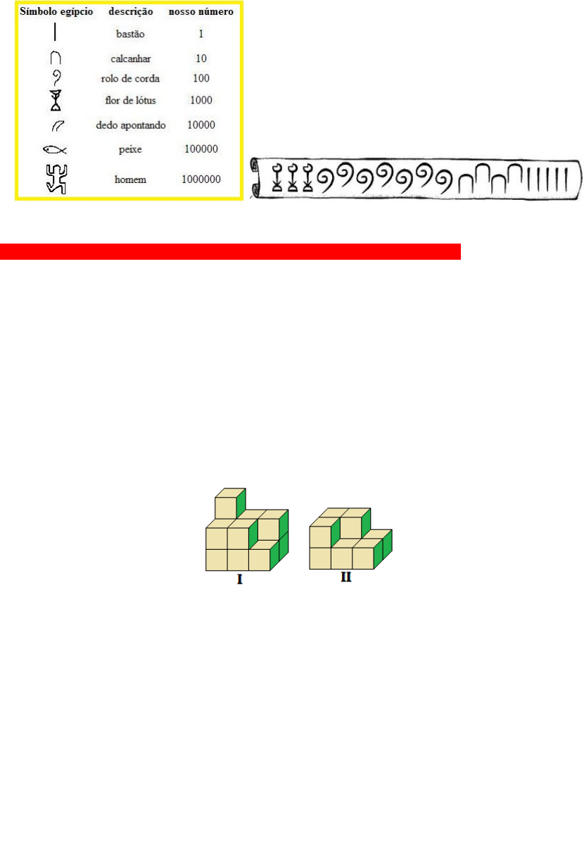 RECUPERAÇÃO PARALELO – 6º ANO BLOCO I 01. O sistema de numeração egípcio é aditivo, para se determinar o valor de um número, basta somar o valor dos símbolos. Os antigos egípcios utilizavam os seguintes símbolos no seu sistema de numeração: O número egípcio em, é representado no nosso sistema de numeração, pelo número A) 3 545. B) 3 875. C) 3 745. D) 3 783. E) 3 754. 02. Pode-se contar manualmente os cubinhos de cada um dos blocos abaixo. Determine o número de cubinhos de cada um dos blocos, sabendo que não existe cubinho suspenso em nenhuma das caixas, em seguida, calcule o total deles. Esse total em algarismos romanos é A) XVII. B) XVIII. C) XIX. D) XX. E) XXI. 03. O ábaco é um antigo instrumento de cálculo que, segundo muitos historiadores, foi criado na Mesopotâmia, pelo menos, em sua forma primitiva e depois os chineses e romanos o aperfeiçoaram. No ábaco acima, o número decimal que o representa é A) 215 679. B) 217 666. C) 216 678. D) 126 678. E) 213 876. 04. A partir de 1973, várias sondas espaciais executaram manobras de sobrevoo que as levaram a distâncias viáveis para a observação de Júpiter. As missões Pioneer obtiveram as primeiras imagens de close-up da atmosfera jupteriana e de vários de seus satélites. As sondas descobriram que os campos radioativos em torno do planeta eram muito mais fortes do que o esperado, mas ambas as espaçonaves sobreviveram ao ambiente hostil. Essas distâncias em números romanos são, respectivamente, A) B) C) D) E) 5. Um prego tem que atravessar três tábuas (A, B e C) de espessuras diferentes, e que estão coladas. Com relação à espessura de cada tábua, sabe-se que: a tábua A tem 17 milímetros, a tábua B tem 22 milímetros e a tábua C tem 11 milímetros. Calcule o comprimento mínimo, em milímetros, para que o prego atravesse totalmente as três tábuas coladas. BLOCO 02 1. Os números egípcios são representados por ideogramas e não pelos gráficos que conhecemos. Para representar pequenas quantidades, eles usaram o que era conhecido como "frações de Horus" ou frações unitárias. Apesar da importância e do grande desenvolvimento deste sistema numérico, ele dificilmente foi utilizado nas transações comerciais no cotidiano dos egípcios. Veja três exemplos: O número acima está escrito no sistema de numeração egípcio, reescreva esse número no sistema decimal. 2. A numeração romana utiliza sete letras maiúsculas, que correspondem aos seguintes valores: Em se tratando de números romanos, veja duas regras importantes Complete o quadro abaixo com os respectivos valores no sistema indo-arábico (sistema decimal) 03. Pedro vende na feira cenouras a R$ 1,00 por quilo e tomates a R$ 1,10 por quilo. Certo dia ele se distraiu, trocou os preços entre si, e acabou vendendo 100 quilos de cenoura e 120 quilos de tomate pelos preços trocados. Quanto ele deixou de receber por causa da sua distração? A) R$ 6,00. B) R$ 5,00. C) R$ 4,00. D) R$ 3,00. E) R$ 2,00. 4. O sistema de numeração decimal é de base 10, ou seja utiliza 10 algarismos (símbolos) diferentes para representar todos os números, esses algarismos são 0, 1, 2, 3, 4, 5, 6, 7, 8, 9, é um sistema posicional, ou seja, a posição do algarismo no número modifica o seu valor. É o sistema de numeração que nós usamos. O ábaco é um antigo instrumento de cálculo, formado por uma moldura com bastões ou arames paralelos, dispostos no sentido vertical, correspondentes cada um a uma posição digital (unidades, dezenas, ...) e nos quais estão os elementos de contagem (fichas, bolas, contas, ...) que podem fazer-se deslizar livremente. Escreva os valores correspondentes a cada ábaco e determine a soma desses valores. 5. A estátua da Liberdade, foi um presente dado por Napoleão III, como uma forma de premiação aos Estados Unidos, após uma vitória em batalha travada contra a Inglaterra. O historiador francês Edouard de Laboulay foi quem primeiro propôs a ideia do presente, e o povo francês arrecadou os fundos necessários para que, em1875, a equipe do escultor Frédéric Auguste Bartholdi começasse a trabalhar na estátua de dimensões colossais. Com os dados da figura ao lado, determine a altura x dessa imponente estátua.