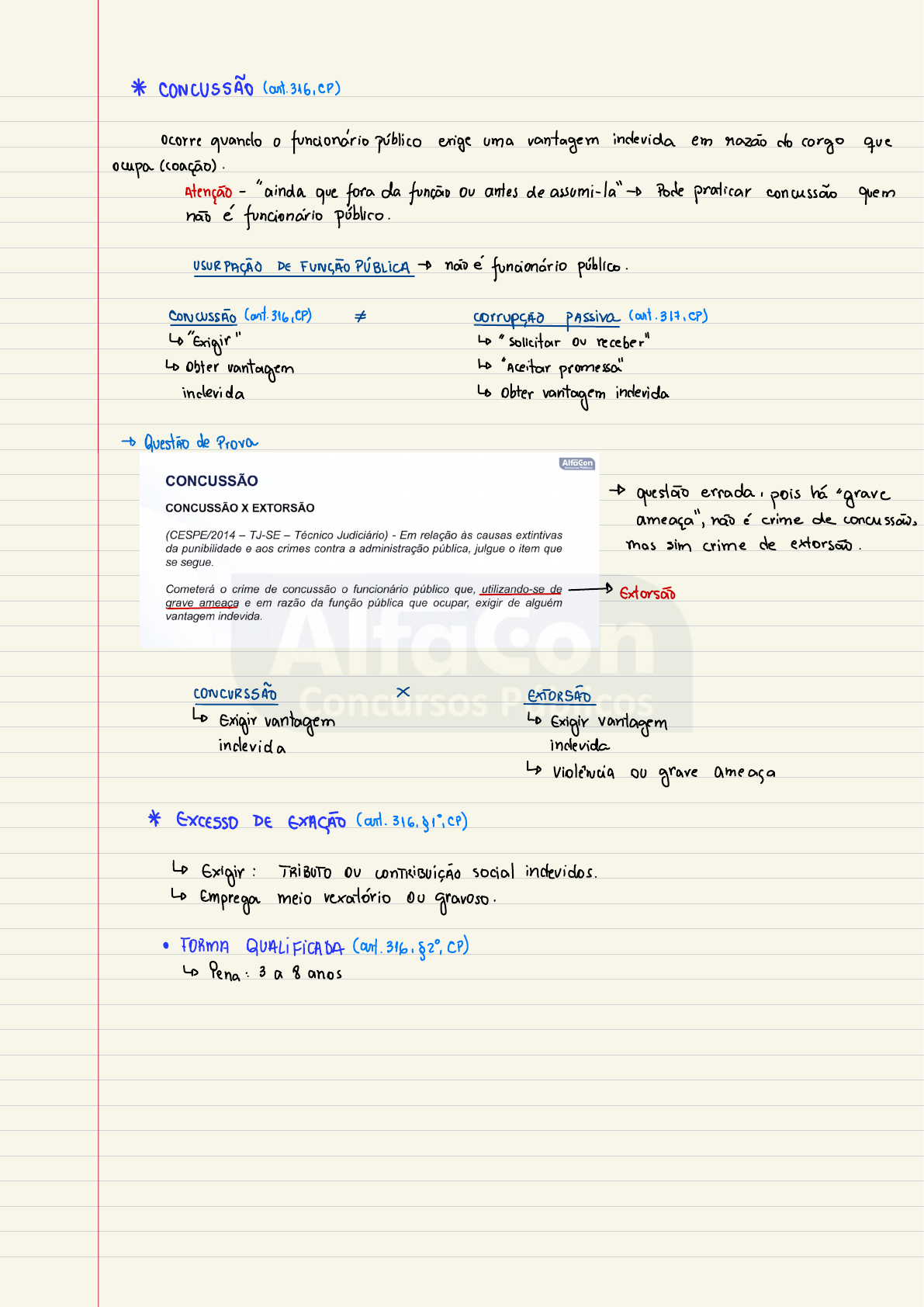* CONCUSSÃO (art . 316 , ep) Ocorre quando o funcionário público exige uma vantagem indevida em razão do cargo que ocupa (coação) . Atenção - " ainda que fora da função ou antes de assumi - la " → Pode praticar concussão quem não é funcionário público . USURPAÇÃO DE Função PÚBLICA → não é funcionário público . Concussão (art 316 MP) ¥ corrupção passiva (art . 317 , ep) ↳ " Exigir " ↳ " solicitar ou receber" ↳ Obter vantagem ↳ " aceitar promessa " indevida ↳ obter vantagem indevida → Questão de prova → questão errada , pois há "grave ameaça " , não é crime de concussão, mas sim crime de extorsão . Extorsão CONCVRSSAÕ X EXTORSÃO ↳ exigir vantagem ↳ Exigir vantagem indevida indevida ↳ violência ou grave ameaça * EXCESSO DE EXAÇÃO (art . 316 , § 1°, CP) ↳ Exigir : TRIBUTO OU contribuição social indevidos . ↳ Emprega meio vexatório ou gravoso . • FORMA QUALIFICADA (art . 316 . §2°, CP) ↳ Pena : 3 a 8 anos