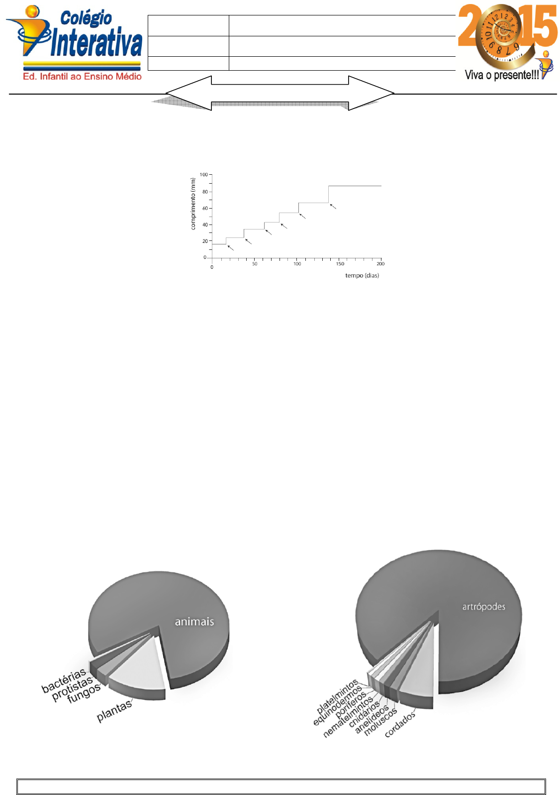 Unid. Parque Atheneu (62) 3273 – 0040 – www.colegiointerativa.com.br – e-mail: secretaria@colegiointerativa.com.br 1) (UERJ/2015) - No gráfico, está indicado o tamanho de um animal terrestre ao longo de um determinado período de tempo, a partir de seu nascimento. Nomeie o filo a que esse animal pertence, justificando sua resposta. Nos pontos indicados pelas setas, ocorre um processo relevante para o desenvolvimento desse animal até a fase adulta. Nomeie esse processo e aponte a razão de sua importância. 2) (UEG GO/2015) - Durante o verão em determinados estados brasileiros é comum escutarmos o canto das denominadas cigarras, como mecanismo de atração das fêmeas pelos machos através do seu canto. Nesse mesmo período, é comum encontrar sobre as árvores “restos” de cigarras, que a população humana denomina de cigarras “estouradas” de tanto cantar. Esses “restos” de cigarra são referentes à qual estrutura de seu corpo? 3) (Mackenzie SP/2013) - No filo artrópoda, destacam-se três principais grupos: os crustáceos, os aracnídeos e os insetos, diplópoda e quilópoda. Escreva as principais características consideradas para essas classes destacando suas diferenças. 4) (FATEC SP/2013) - Os gráficos a seguir representam a proporção entre o número de espécies conhecidas dos diferentes grupos de seres vivos. Na figura 1, está representada a relação entre os cinco reinos (de acordo com a classificação de Whittaker) e, na figura 2, a proporção entre os principais filos de animais. Figura 1 Figura 2 Professor (a): Laryssa Raquel Schmaltz marques Aluno (a): Série: 3ª Data: ____/ ____/ 2015. Ensino Médio – Unidade Parque Atheneu LISTA DE BIOLOGIA I Unid. Parque Atheneu (62) 3273 – 0040 – www.colegiointerativa.com.br – e-mail: secretaria@colegiointerativa.com.br Com base nas informações contidas nesses gráficos, escreva a diferença entre os gráficos e por que no segundo gráfico os artrópodes dominam? 5) (UEG GO/2013) - Os insetos têm grande importância ecológica como elos fundamentais em cadeias alimentares, ora sendo pragas agrícolas causando prejuízos à pecuária e à agricultura, ora sendo agentes polinizadores de plantas cultivadas causando benefícios ao homem. Exercendo diferentes funções, possuem durante seu desenvolvimento, fases distintas até atingir a vida adulta, conforme ilustrado abaixo: AMABIS, J. M.; MARTHO, G. R. Biologia dos organismos: classificação, estrutura e função nos seres vivos. São Paulo: Moderna, 2000. p.262. a) Com base na análise das figuras, identifique os tipos de desenvolvimento representados em A, B e C. b) Explique a diferença representada em B e C. c) A que filo pertence os grupos representados (A, B e C)? 6) (UEFS BA/2012) - A resistência dos insetos evolui rapidamente, porque a seleção natural preserva as mutações raras que não são vantajosas em condições normais, mas casualmente conferem proteção contra substâncias químicas danosas. Entomólogos com formação em Genética Evolutiva desenvolveram estratégias para retardar a evolução da resistência. A estratégia mais eficaz, baseada tanto em modelos evolutivos como em provas, é de fornecer à espécie que constitui praga “refúgios” livres de pesticidas, nos quais os genótipos suscetíveis possam se reproduzir, impedindo, dessa forma, que os genótipos resistentes dominem o ambiente. A estratégia oposta, que intuitivamente parece atraente — de tentar arrasar a população de insetos com “bombardeio de saturação” — simplesmente acelera a evolução da resistência porque aumenta a força da seleção natural. (FUTUYMA, 2002, p.10). Com base na análise do texto, qual a melhor estratégia utilizada pelos pesquisadores para retardar a evolução da resistência em populações de insetos? 7) (UDESC SC/2012) - A aranha marrom (gênero Loxosceles) é pequena e seu veneno pode provocar anemia e até levar o indivíduo à morte. O tratamento deve ser feito com soro antiloxoscélico – uma solução de anticorpos específicos contra o veneno desta aranha. Na cabeça da aranha há um primeiro par de apêndices, as(os) ______________, por meio das(os) quais a aranha injeta o veneno na presa. 8) (UNESP SP/2012) - Um besouro havia caído em uma piscina e, embora a maior parte de seu corpo estivesse acima do nível da água, a cabeça do inseto estava totalmente submersa. Pedrinho, que observava a cena, retirou o animal da piscina depois de mais de trinta minutos nessa situação. O besouro continuava vivo e saiu andando, como se nada tivesse acontecido. Pedrinho quis repetir a cena consigo mesmo, mas não conseguiu manter a cabeça submersa por mais de dois minutos sem respirar. Considerando as características do sistema respiratório dos insetos e as características do sistema respiratório dos mamíferos, explique por que o besouro conseguiu ficar tanto tempo com a cabeça submersa e explique por que Pedrinho não o conseguiu. Unid. Parque Atheneu (62) 3273 – 0040 – www.colegiointerativa.com.br – e-mail: secretaria@colegiointerativa.com.br 9) (UNICAMP SP/2012) - Um dos grupos mais numerosos de artrópodes, os insetos, passou a ocupar o ambiente terrestre. Algumas estruturas foram relevantes para que os insetos conquistassem a terra firme e ocupassem vários espaços do planeta, passando a ter importância ecológica e influência na economia. a) Indique duas estruturas que possibilitaram a conquista do meio terrestre e explique por que elas foram importantes. b) De que forma os insetos exercem influência ecológica e econômica? 10) (UFJF MG/2012) - A tirinha abaixo ilustra um diálogo entre uma forma imatura e uma forma adulta de uma espécie de borboleta (Lepidoptera). Fonte: Disponível em: <http://riscando7.blogspot. com.br/2009_10_01_archive.html>. Acesso em: 12/04/2012. a) O tipo de desenvolvimento ilustrado na tirinha é denominado holometabolia ou metamorfose completa. Qual a consequência 