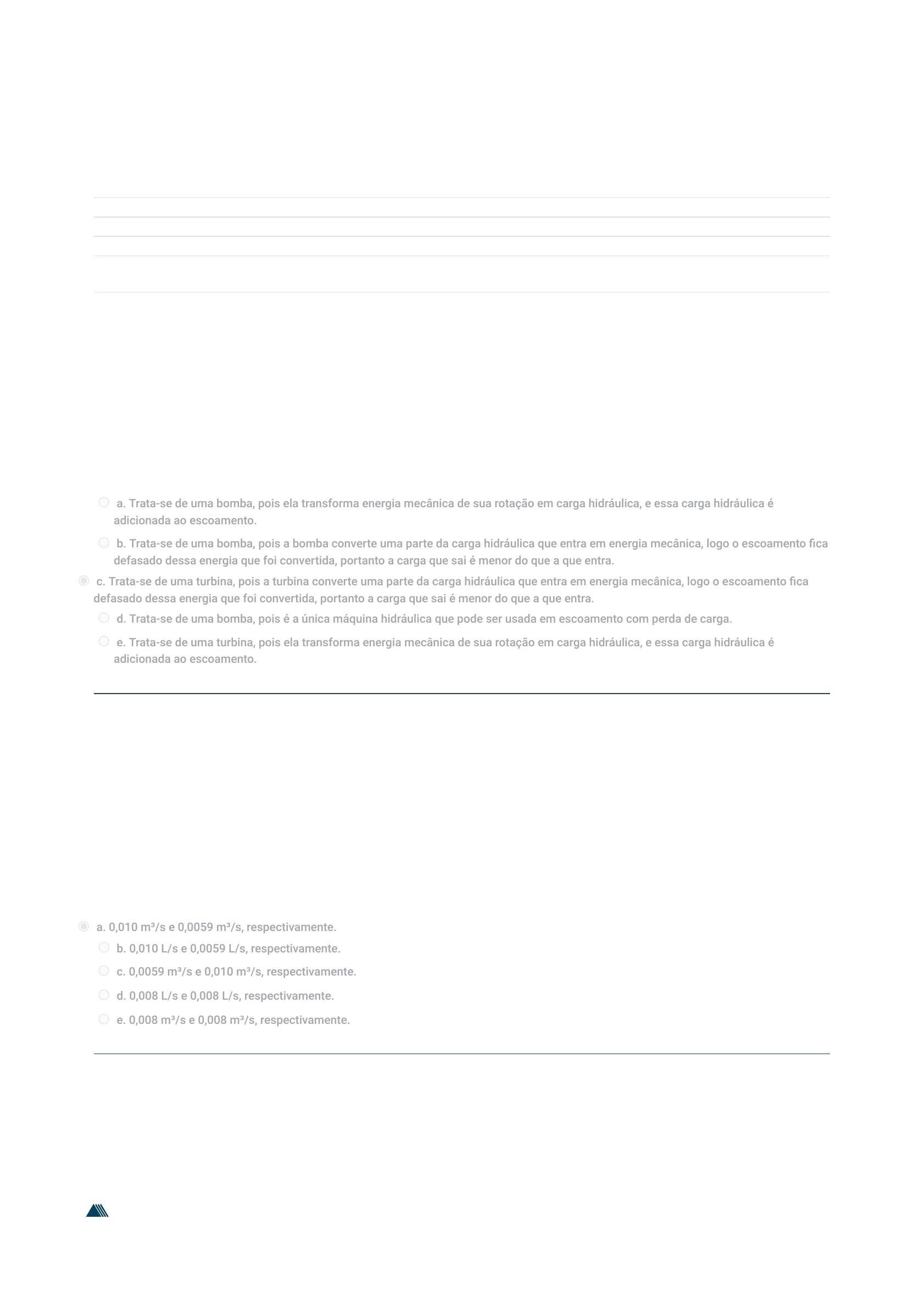 12/10/2020 Unidade 3 - Exercícios de fixação: avaliação da tentativa https://portalacademico.eniac.edu.br/mod/quiz/review.php?attempt=583743&cmid=177170 1/5 Página inicial / Meus Cursos / ENIAC_20202F_966 / Materiais de Estudo / Unidade 3 - Exercícios de �xação Iniciado em segunda, 12 out 2020, 14:22 Estado Finalizada Concluída em segunda, 12 out 2020, 14:27 Tempo empregado 5 minutos 1 segundo Avaliar 10,00 de um máximo de 10,00(100%) Questão 1 Correto Atingiu 1,00 de 1,00 Questão 2 Correto Atingiu 1,00 de 1,00 Quando a carga hidráulica que entra em uma máquina hidráulica é maior se comparada com a carga que sai, estamos tratando de qual equipamento? Justi�que. Escolha uma: a. Trata-se de uma bomba, pois ela transforma energia mecânica de sua rotação em carga hidráulica, e essa carga hidráulica é adicionada ao escoamento. b. Trata-se de uma bomba, pois a bomba converte uma parte da carga hidráulica que entra em energia mecânica, logo o escoamento �ca defasado dessa energia que foi convertida, portanto a carga que sai é menor do que a que entra. c. Trata-se de uma turbina, pois a turbina converte uma parte da carga hidráulica que entra em energia mecânica, logo o escoamento �ca defasado dessa energia que foi convertida, portanto a carga que sai é menor do que a que entra. d. Trata-se de uma bomba, pois é a única máquina hidráulica que pode ser usada em escoamento com perda de carga. e. Trata-se de uma turbina, pois ela transforma energia mecânica de sua rotação em carga hidráulica, e essa carga hidráulica é adicionada ao escoamento. Qual a vazão que escoa em um trecho de tubulação com 500 m de comprimento, rugosidade de 3,0 mm e diâmetro de 150 mm e em um trecho de tubulação com 300 m de comprimento, rugosidade de 0,26 mm e diâmetro de 100 mm? Sabe-se que ambos os trechos iniciam e terminam no mesmo ponto e que a perda de carga entre esses dois pontos é de 3 m. Escolha uma: a. 0,010 m³/s e 0,0059 m³/s, respectivamente. b. 0,010 L/s e 0,0059 L/s, respectivamente. c. 0,0059 m³/s e 0,010 m³/s, respectivamente. d. 0,008 L/s e 0,008 L/s, respectivamente. e. 0,008 m³/s e 0,008 m³/s, respectivamente. https://portalacademico.eniac.edu.br/ https://portalacademico.eniac.edu.br/course/view.php?id=7209 https://portalacademico.eniac.edu.br/course/view.php?id=7209#section-1 https://portalacademico.eniac.edu.br/mod/quiz/view.php?id=177170 https://atendimento.eniac.edu.br/ 12/10/2020 Unidade 3 - Exercícios de fixação: avaliação da tentativa https://portalacademico.eniac.edu.br/mod/quiz/review.php?attempt=583743&cmid=177170 2/5 Questão 3 Correto Atingiu 1,00 de 1,00 Questão 4 Correto Atingiu 1,00 de 1,00 Questão 5 Correto Atingiu 1,00 de 1,00 Qual é o conceito de curva de canalização? Escolha uma: a. A curva da canalização aponta a variação da energia necessária ao sistema, vinculando uma altura de carga hidráulica requerida em função da vazão que passa pela canalização do sistema. b. A curva da canalização aponta a variação da energia necessária ao sistema, vinculando uma altura de carga hidráulica requerida em função da vazão que passa pela canalização do sistema, sendo que a carga hidráulica necessária decresce quanto maior for a vazão. c. A curva da canalização aponta a variação da energia cedida ao sistema, vinculando uma altura de carga hidráulica fornecida em função da vazão que passa pela canalização do sistema, sendo que a carga hidráulica necessária decresce quanto maior for a vazão. d. A curva da canalização aponta a variação da energia necessária ao sistema, vinculando uma altura de carga hidráulica requerida em função da velocidade que passa pela canalização do sistema. Sendo que a carga hidráulica necessária cresce quanto maior for a velocidade. e. A curva da canalização aponta a variação da energia necessária ao sistema, vinculando a perda de carga do conduto de aspiração em função da vazão que passa pela canalização do sistema, sendo que a carga hidráulica necessária decresce quanto maior for a vazão. Qual é o conceito de ponto de funcionamento de um sistema? Escolha uma: a. O ponto de funcionamento é quando a energia fornecida é menor do que a necessária para que dada vazão seja bombeada. b. O ponto de funcionamento é quando a energia fornecida é igual a energia necessária para que dada vazão seja bombeada. c. O ponto de funcionamento é quando o NPSH disponível é maior do que o NPSH requerido pelo fabricante. d. O ponto de funcionamento é quando a perda de carga da aspiração é igual a perda de carga da canalização de recalque. e. O ponto de funcionamento é quando a energia fornecida é maior do que a necessária para que dada vazão seja bombeada. Uma moto-bomba centrífuga, com sucção não afogada, apresenta cavitação. Consultado, o fabricante garantiu que o NPSH requerido para as condições da instalação em questão não ultrapassa 4,2 m. As condições são as seguintes: • A pressão atmosférica local é 103 325 Pa • A pressão de vapor da água é de 0,25 mca • As perdas de carga na aspiração, para a vazão de operação, totalizam 2,5 m • As perdas de carga no recalque, para a vazão de operação, totalizam 3,7 m • O peso especí�co da água é de 9.806 N/m² Para eliminar a cavitação, com uma folga de segurança de 25% no NPSH, a altura de sucção deve ser: Escolha uma: a. 3,58 m. b. 1,16 m. c. 0,29 m. d. 1,33 m. e. 2,54 m. 12/10/2020 Unidade 3 - Exercícios de fixação: avaliação da tentativa https://portalacademico.eniac.edu.br/mod/quiz/review.php?attempt=583743&cmid=177170 3/5 Questão 6 Correto Atingiu 1,00 de 1,00 Questão 7 Correto Atingiu 1,00 de 1,00 Qual é o conceito de curva de estrangulação? Escolha uma: a. A curva de estrangulação aponta a variação da energia cedida ao sistema pela bomba, vinculando uma altura de carga hidráulica fornecida em função da vazão que passa pela bomba
