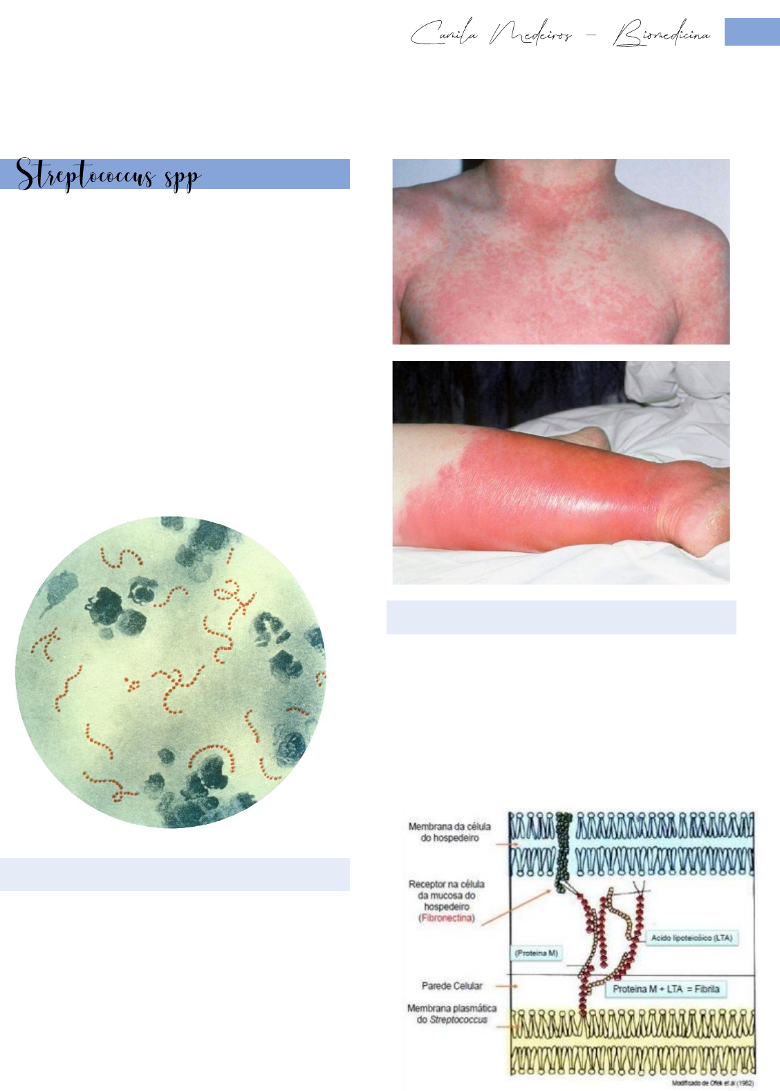 25 • Compreendem os cocos gram-positivos, catalase negativos. • São nutricionalmente exigentes, crescem bem em Agar Sangue e caldo nutriente contendo glicose. • Anaeróbios facultativos, porém crescem melhor em atmosfera enriquecida com CO2 ou anaerobiose. • São encontrados nos mais diversos ambientes. • Metabolismo fermentativo, principalmente da molécula da glicose. PATOLOGIAS • Faringite • Escarlatina (pele cheia de manchas vermelhas, aparenta aspecto granuloso). • Erisipela • Meningites • Pneumonia • Endocardite • Cáries FATORES DE VIRULÊNCIA Em Streptococcus, podemos destacar a proteína M, que está presente na superfície da parede celular da bactéria. Essa proteína atua como fator anti-fagocitico, impedindo o processo de opsonização (reconhecimento pelo sistema complemento), facilitando a aderência da bactéria as células humanas. identificação de bactérias gram positivas STREPTOCOCCUS. 26 • A Estreptolisina S Não imunogênica, ou seja, não é reconhecida como antígeno estranho pelo sistema imune. Lisa eritrócitos, neutrófilos e plaquetas. • Estreptolisina O Diagnóstico de Febre reumática exames: ASLO ou LÁTEX. Imunogênica, desencadeia a formação de anticorpos. Lisa eritrócitos, neutrófilos e plaquetas. • Cápsula de ácido hialurônico Identificada em Streptococcus pyogenes Importante no processo de disseminação da Streptococcus pyogenes - grande quantidade de ácido hialurônico no tecido conjuntivo, possibilitando que a bactéria consiga se esconder do sistema imune (porque ela possui o ácido hialurônico). • Estreptoquinase (Fibrinolisina). Dissolve a fibrina. A bactéria presente no tecido humano, começa a produzi enzimas coagulase, formando um coágulo entorno delas para que possam se reproduzir (meio que uma proteção). Posteriormente, após a sua reprodução, a bactéria libera a Estreptoquinase para que ocorra a destruição desse coágulo e elas sejam liberadas para infectar outras células. CLASSIFICAÇÃO Streptococcus pyogenes Streptococcus agalactiae Streptococcus pneumoniae A classificação dos Streptococcus pode ser baseada por hemólise no Ágar sangue ou classificação baseada em constituição (sorológico). • Grupos sorológicos de Lancefield: o A B C D E F G Área médica Grupo (hemólise) Polissacarídeo grupo-específico Espécie A (β-hemólise) ramnose-N- acetilglicosamina S. pyogenes B (β-hemólise) ramnose- glicosamina e galactose S. agalactiae C (β-hemólise) ramnose-N- acetilgalactosamina S. equi, S. equisimilis, S. zooepidemicu s, S. dygalactiae D (α-hemólise, NH) ácido teicoíco glicerol com D- alanina e glicose S. bovis F (β (α) - hemólise, NH) glicopiranosil-N- acetilgalactosamina S. milleri - Viridans (α- hemólise, NH) Não possui polissacarídeo grupo-específico S. mutans, S. sanuis, S. salivarius, S. mitis - (α-hemólise) Não possui polissacarídeo grupo-específico S. pneuomoniae Febre reumática A febre reumática é uma infecção associada a Streptococcus pyogenes, afetando várias partes do corpo como articulações, coração, sistema nervoso e pele. Pode ser diagnosticada com a presença de uma toxina liberada pela bactéria (Estreptolisina E e Estreptolisina O). 27 Cultura: Isolamento e Identificação Material clínico Ágar sangue Gram: CGP Colônia (hemólise) Catalase negativa Identificação CULTURA Ao analisar as placas, deve-se atentar à possíveis hemólises (zonas claras) ao redor das colônias. Com relação aos fatores de virulência das Streptococcus, podemos observar a presença de Estreptolisinas. Estas podem lisar eritrócitos (causando a hemólise), no entanto, o grau de hemólise depende dos níveis de expressão desses fatores de virulência da bactéria. • As bactérias Beta-hemolíticas apresentam alto nível de expressão de hemolisina. A morte das hemácias será identificada pela presença de halos em torno da colônia bacteriana. S. pyogenes, S. agalactiae. • As bactérias Alfa-hemolíticas não produzem uma hemólise tão elevada, considera-se uma hemólise parcial. S. pneumoniae, S. viridans • As bactérias Gama-hemolíticas apresentam ausência de hemólise, pois não produzem Estreptolisinas. S. bovis (Grupo D enterococcus). PROVA DA CATALASE Diferenciação entre cocos gram-positivos: Gêneros Staphylococcus e Streptococcus. Não ocorreu a formação de bolhas, logo identificamos Streptococcus. Observamos no meio de cultura Ágar sangue uma hemólise total, assim, confirmando a presença de Streptococcus spp. beta-hemolíticos. Em sequência, realizaremos testes para confirmar a espécie. TESTE DA BACITRACINA O teste tem a finalidade de diferenciar S. pyogenes de outras cepas do grupo A ou de outras espécies com colônias beta-hemolíticas. No teste, 28 utiliza-se um disco de bacitracina em meio Ágar sangue para um melhor crescimento da bactéria. Se a bactéria cresceu ao redor do disco, ela é resistente. Identificamos S. agalactiae. Se a bactéria não cresceu ao redor do disco, é sensível. Identificamos S. pyogenes. TESTE DE CAMP O teste visa a identificação de cepas de S. agalactiae (grupo B). Estas cepas produzem o fator CAMP (Christie, Atkins e Munch – Petersen) que atua sinergicamente com a Beta-hemolisina produzida pelo Staphylococcus aureus em ágar sangue (Fator CAMP interage com a Beta- hemolisina, favorecendo a atividade da mesma). A S. agalactiae apresenta o fator CAMP (fator de virulência), permitindo que a bactéria se ligue com imunoglobulinas. facilitando a disseminação da bactéria. PROCEDIMENTO • Utilizamos o meio de cultura Ágar sangue novamente e realizamos uma estria vertical com a bactéria Staphylococcus aureus. • Então pegamos uma colônia da amostra analisada e fazemos uma estria horizontal perto da estria da Staphylococcus aureus. • Caso o laboratório tenha uma amostra de Listeria monocytogeneses, podemos usar como controle positivo. a Listeria monocytogeneses possui o fat