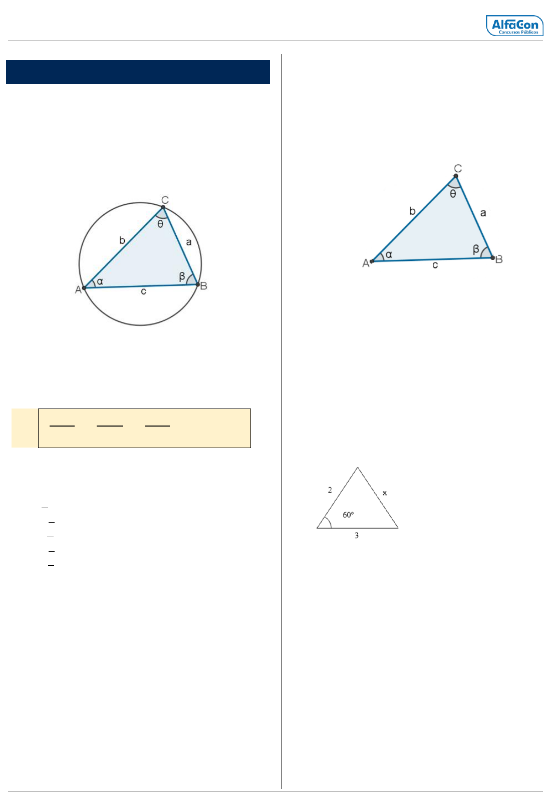 Professor: ANDRÉ ARRUDA Turma: PMPR Data: 21/05/2020 (19h15-22h45) MATEMÁTICA MUDE SUA VIDA! 1 TRIGONOMETRIA LEI DOS SENOS (TEOREMA DOS SENOS) Num triângulo qualquer, as medidas dos lados são proporcionais às medidas dos senos dos ângulos opostos a ele. Considere como exemplo o triângulo ABC abaixo: Em um caso como esse, os lados e ângulos possuem medidas quaisquer. Assim, temos: Fórmula que representa a Lei dos senos: 𝐚 𝐬𝐞𝐧 𝛂 = 𝐛 𝐬𝐞𝐧 𝛃 = 𝐜 𝐬𝐞𝐧 𝛉 = 2.r Exemplo: Num triângulo ABC são dados A=60º, B=75º e AB = 2√2 metros. A medida do lado BC vale: a) √3 m b) 2√3m c) 3√3m d) 4√3m e) 5√3m LEI DOS COSSENOS (TEOREMA DOS COSSENOS) Num triângulo qualquer, o quadrado da medida de um lado é igual à soma dos quadrados das medidas dos outros dois, menos o duplo produto entre as medidas desses dois lados e o Cosseno do ângulo por eles formados. Considere como exemplo o triângulo ABC abaixo: Fórmulas que representam a Lei dos Cossenos: a2 = b2+c2 – 2.b.c.cos α b2 = a2+c2 – 2.a.c.cos β c2 = a2+b2 – 2.a.b.cos θ Exemplo: Determine o valor de x no triângulo abaixo: https://www.alfaconcursos.com.br/ Professor: ANDRÉ ARRUDA Turma: PMPR Data: 21/05/2020 (19h15-22h45) MATEMÁTICA MUDE SUA VIDA! 2 TRIGONOMETRIA NO TRIÂNGULO RETÂNGULO 1) Calcule o valor do segmento desconhecido no triângulo retângulo a seguir: a) b) c) 2) Calcular os catetos de um triângulo retângulo cuja hipotenusa mede 6 cm e um dos ângulos mede 60º. 3) Quando o ângulo de elevação do sol é de 60º, a sombra de uma árvore mede 15m. Calcule a altura da árvore, considerando √3 = 1,7. 4) Um avião levanta vôo sob um ângulo de 30º. Depois de percorrer 8 km, o avião se encontra a uma altura de: a) 2 km b) 3 km c) 4km d) 5 km e) 6km 5) Um foguete é lançado sob um ângulo de 30 º. A que altura se encontra depois de percorrer 12 km em linha reta? 6) Um ciclista acrobático vai atravessar de um prédio a outro com uma bicicleta especial, percorrendo a distância sobre um cabo de aço, como demonstra o esquema a seguir: Qual a medida mínima do comprimento do cabo de aço? 7) Uma escada apoiada em uma parede, num ponto distante 4m do solo, forma com essa parede um ângulo de 60º. Qual é o comprimento da escada em metros? 8) Calcule x indicado na figura: 9) Uma escada medindo 4m tem umas de suas extremidades apoiada no topo de um muro, e a outra extremidade dista 2,4 m da base do muro. A altura desse muro é: a) 2,3 m b) 3,0 c) 3,2 m d) 3,4m e) 3,8m https://www.alfaconcursos.com.br/ Professor: ANDRÉ ARRUDA Turma: PMPR Data: 21/05/2020 (19h15-22h45) MATEMÁTICA MUDE SUA VIDA! 3 10) Um móvel parte de A e segue numa direção que forma com a reta AC um ângulo de 30º. Sabe-se que o móvel caminha com uma velocidade constante de 50Km/h. Determine a que distância o móvel se encontra da reta AC após 3 horas de percurso. 11) A figura representa o esquema de um observador instalado no ponto P de uma praça, em Maringá, que avista um balão meteorológico no ponto N situado no topo de um edifício, sob um ângulo α. Considerando-se a distância do observador ao edifício igual a 36m e sen α = 4/5, pode-se afirmar que a altura desse edifício mede, em metros: a) 27 b) 36 c) 48 d) 54 e) 72 12) Um terreno de forma triangular tem frentes de 20 metros e 40 metros, em ruas que formam, entre si, um ângulo de 60º. Admitindo-se √3 = 1,7, a medida do perímetro do terreno, em metros, é: a) 94 b) 93 c) 92 d) 91 e) 90 13) Num triângulo retângulo cujos catetos mede √8 e √9 , a hipotenusa mede: a) √10 b) √11 c) √13 d) √17 e) √19 14) Uma escada é apoiada em uma parede perpendicular ao solo, que por sua vez é plano. A base da escada, ou seja, seu contato com o chão, dista 10m da parede. O apoio dessa escada com a parede está a uma altura de 10√3 m do solo. Isto posto, o ângulo entre a escada e o solo é de a) 60º b) 45º c) 30º d) 15º ________________________________________________ Gabarito: 1) a = 15; b= 6cm; c = 13cm 2) 3√3 e 3 3) 25,5 m 4) letra C 5) 6 km --------- 6) 41,23 m aproximadamente 7) 8 m 8) 50√3 9) letra C 10)75 Km 11) letra C 12) letra A 13) letra D 14) letra A -------------------- https://www.alfaconcursos.com.br/ Professor: ANDRÉ ARRUDA Turma: PMPR Data: 21/05/2020 (19h15-22h45) MATEMÁTICA MUDE SUA VIDA! 4 RELAÇÕES MÉTRICAS NO TRIÂNGULO RETÂNGULO 1) No triângulo abaixo, calcule z: 2) No triângulo abaixo, calcule y: 3) No triângulo abaixo, calcule x: 4) No triângulo abaixo, calcule x: 5) No triângulo abaixo, calcule x: 6) No triângulo abaixo, calcule x: 7) Determine x e y no triângulo abaixo: 8) No triângulo abaixo, calcule x: https://www.alfaconcursos.com.br/ Professor: ANDRÉ ARRUDA Turma: PMPR Data: 21/05/2020 (19h15-22h45) MATEMÁTICA MUDE SUA VIDA! 5 9) Calcule a altura e as projeções dos catetos sobre a hipotenusa, no triângulo retângulo de catetos 12cm e 16cm. 10) Calcule a hipotenusa, a altura relativa à hipotenusa, e as projeções dos catetos sobre a hipotenusa de um triângulo retângulo de catetos 3 e 4. 11) A altura relativa à hipotenusa de um triângulo retângulo mede 12m. Se a hipotenusa mede 25m, calcule os catetos. 12) Em um triângulo retângulo de lados 9m, 12m e 15m, a altura relativa ao maior lado será: a) 7,2m b) 7,8m c) 8,6m d) 9,2m e) 9,6m ________________________________________________ GABARITO 1) z=20 2) y=6 3) x=9 4) x=8 5) x=3 6) x=6 7) x=10 e y=4,8 8) x=2 9) 48/5; 36/5; 64/5 10) 5; 9/5; 16/5; 12/5 11) 20m e 15m 12) Letra A ------------------------ https://www.alfaconcursos.com.br/