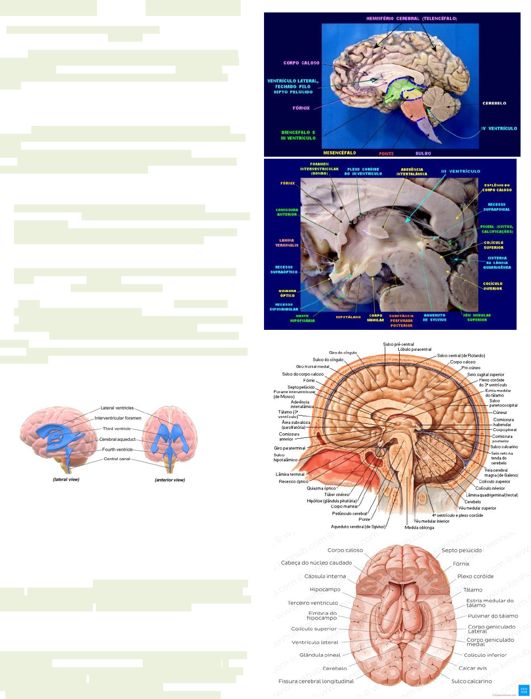 O Diencéfalo + Telencéfalo formam o Cérebro (prosencéfalo), a parte mais volumosa e desenvolvida do Encéfalo (Cérebro + TE). O Diencéfalo (do grego Dia, entre, através e Enkephalous, cérebro, significa “o que está entre o cérebro”, ou seja, entre os hemisférios cerebrais) é recoberto pelo Telencéfalo, sendo visível apenas quando retiramos este último. O telencéfalo se desenvolve enormemente em sentido lateral e posterior para constituir os hemisférios cerebrais. Deste modo, encobre quase completamente o diencéfalo, que permanece em situação ímpar e mediana, podendo ser visto apenas na face inferior do cérebro. Pode ser dividido em 4 partes: Tálamo, Hipotálamo, Epitálamo e Subtálamo. O Diencéfalo contém o III Ventrículo no seu interior (mediano). III Ventrículo É uma cavidade em forma de fenda longitudinal que possui como limites as partes do Diencéfalo. O III Ventrículo se comunica com o IV Ventrículo pelo Aqueduto Cerebral (Mesencéfalo) e com os Ventrículos Laterais pelos Forames Interventriculares (ou Forame de Monro). Num corte sagital mediano, vemos o líquor no interior do III Ventrículo, pois observa-se a fenda. Quando o corte é sagital mais lateral (paramediano) vemos as paredes laterais que formam o III Ventrículo e que são partes do Diencéfalo. Limites do III ventrículo O Sulco Hipotalâmico vai do Aqueduto Cerebral até o Forame de Monro, e separa as estruturas do Diencéfalo: acima do sulco temos o Tálamo e o Epitálamo, enquanto abaixo temos o Hipotálamo • O Tálamo é visível por fazer uma proeminência no III Ventrículo e ter uma ponte de fibras nervosas que conectam os dois tálamos (Aderência Intertalâmica). Essa aderência intertalâmica pode não existir em 30% das pessoas e aparece como um círculo no corte sagital mediano • Parede lateral: Sulco Hipotalâmico, Núcleos do Hipotálamo e o Tálamo. Essas estrias são feixes de fibras nervosas que saem do Epitálamo e correm acima do Tálamo. Nela está aderida a Tela Corioide, que tem invaginações para a luz do III Ventrículo chamadas Plexos Corioides do III Ventrículo • Parede superior (teto): Estrias Medulares do Tálamo. O Fórnice (Fornix - Do latim Fornix, abóboda, arco de porta) é um feixe de fibras nervosas abaixo do Corpo Caloso do Telencéfalo • A Lâmina Terminal é uma fina lâmina de tecido nervoso do Telencéfalo que une os dois hemisférios cerebrais, entre o Quiasma Óptico e a Comissura Anterior • Parede Anterior: Fórnice, Comissura Anterior e Lâmina Terminal. Parede Posterior: Epitálamo (Glândula Pineal), a Comissura Posterior e a decussação das Habênulas. Assoalho: Hipotálamo (Quiasma Óptico), o Túber Cinéreo, o Infundíbulo com a Hipófise, e os Corpos Mamilares (tudo nessa ordem, de anterior→posterior). Recessos do III ventrículo Recesso são pequenas invaginações do ventrículo cavando para dentro das estruturas adjacentes do Diencéfalo. O III Ventrículo possui 5 recessos: Recesso Anterior (abaixo do Fórnice e perto da Comissura Anterior); Recesso Óptico (ou Recesso Supraquiasmático – está acima do Quiasma Óptico); Recesso Infundibular (acima da haste do infundíbulo); Recesso Suprapineal (Acima da Pineal, perto da comissura das Habênulas); Recesso Pineal (perto da G. Pineal). Tálamo Do grego Thalamos, “quarto de dormir”. Provavelmente recebeu esse nome por conter a Pineal, glândula responsável pelo sono e ciclo circadiano. Os Tálamos são estruturas pares de substância cinzenta com formato oval muito relacionadas com a sensibilidade. Ele faz parte do Diencéfalo e está acima do Sulco Hipotalâmico. A extremidade anterior é mais afinalada e possui o Tubérculo Anterior do Tálamo, responsável pelo limite do Forame de Monro. A extremidade posterior é mais arredondada e possui o Pulvinar do Tálamo - do latim Pulvinar, travesseiro, almofada. Possui eminências que formam o Corpo Geniculado Medial (via auditiva) e o Corpo Geniculado Lateral (via óptica). Stella Fernandes - MEDUFMS/Turma LIII Diencéfalo Página 1 de Diencéfalo Porção lateral: revestida por epitélio ependimário, pois faz parte do assoalho do Ventrículo Lateral (Telencéfalo) • Porção medial: forma a parede lateral do III Ventrículo e é vista num corte sagital paramediano • Face superior do Tálamo: dividida em porção medial e porção lateral. Face inferior do Tálamo: contínua com o Hipotálamo e o Subtálamo. Face lateral do Tálamo: separada do Telencéfalo por um feixe espesso de fibras nervosas descendentes e ascendentes chamada Cápsula Interna. Essas fibras conectam áreas corticais às áreas do TE e da ME (vias), principalmente fibras relacionadas com a sensibilidade. É visível num corte coronal e axial (só pode ser vista num corte sagital se for muito lateralizado). Entre essa Cápsula Interna e a Lâmina Medular Externa (aderida à face lateral do Tálamo), está o Núcleo Reticular do Tálamo. A Lâmina medular externa penetra no Tálamo e forma a Lâmina Medular Interna, separando o Tálamo longitudinalmente (septo longitudinal). A Lâmina Medular Interna se bifurca em Y na face anterior do Tálamo e delimita os Núcleos Talâmicos Anteriores. No interior dessa Lâmina temos núcleos intralaminares do Tálamo. Núcleos do Tálamo Existem muitos núcleos no interior do Tálamo e o principal ponto de referência é a Lâmina Medular Interna. São divididos em 5 grupos: Grupo anterior, grupo posterior, grupo mediano, grupo medial e grupo lateral. Contém os núcleos do Tubérculo Anterior do Tálamo, limitados pela bifurcação em Y da Lâmina Medular Interna. Esses núcleos são relacionados com a memória e possuem conexções corticais e com os corpos mamilares (fascículo mamilotalâmico) • Grupo Anterior O Pulvinar do Tálamo > conexões com a área de associação temporoparietal do córtex cerebral ligadas à atenção seletiva, mas não muito conhecidas > lesão no Pulvinar causa problemas 