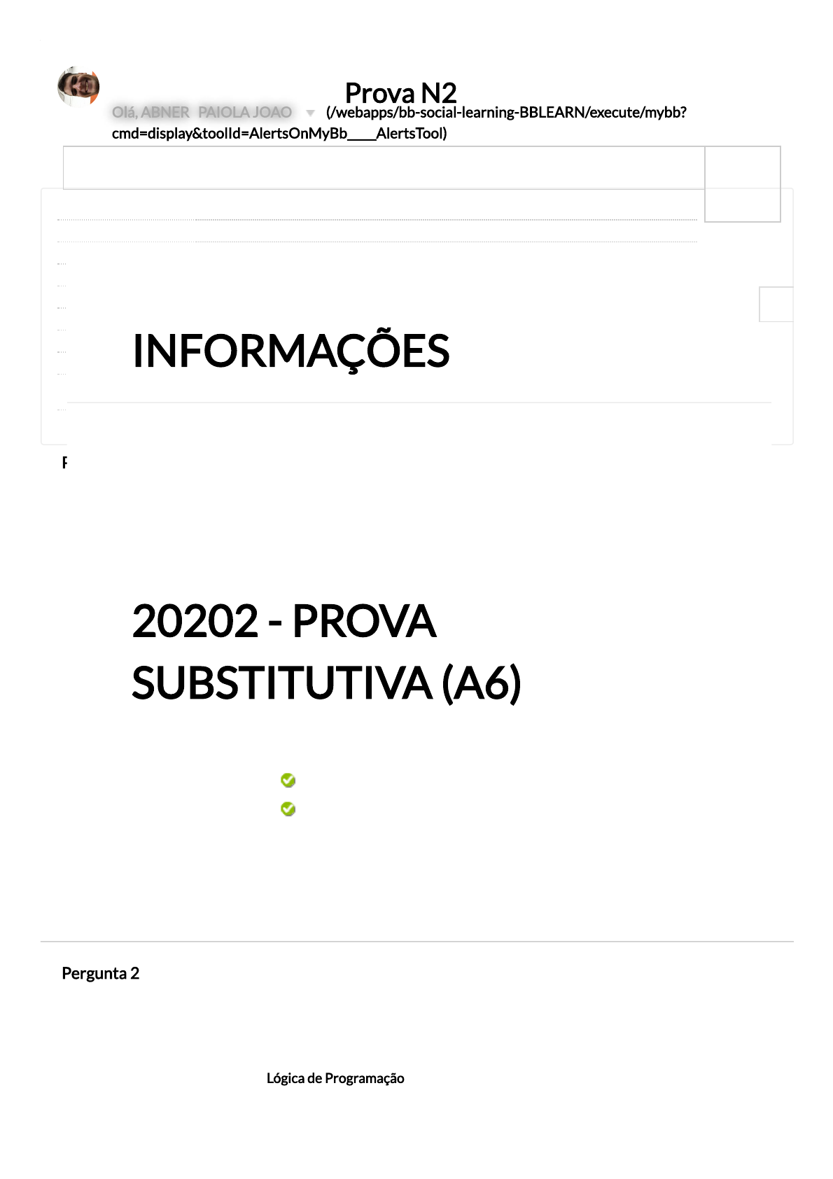 13/10/2020 Blackboard Learn https://anhembi.blackboard.com/webapps/late-Course_Landing_Page_Course_100-BBLEARN/Controller 1/4 Minha Área(/) Olá, ABNER PAIOLA JOAOOlá, ABNER PAIOLA JOAO (/webapps/bb-social-learning-BBLEARN/execute/mybb? cmd=display&toolId=AlertsOnMyBb_____AlertsTool) Conheça sua Disciplina ALGORITMOS E PROGRAMACAO Esclareça suas Dúvidas > Usuário ABNER PAIOLA JOAO Curso CCO04046 ALGORITMOS E PROGRAMAÇÃO GR0049202 - 202020.ead-11066.01 Teste 20202 - PROVA SUBSTITUTIVA (A6) Iniciado 13/10/20 17:20 Enviado 13/10/20 17:41 Status Completada Resultado da tentativa 7 em 10 pontos Tempo decorrido 20 minutos Instruções Resultados exibidos Respostas enviadas, Respostas corretas, Comentários Caso necessite a utilização do "EXCEL" clique no link ao lado -----------> excel.xlsx Pergunta 1 Resposta Selecionada: Resposta Correta: Feedback da resposta: Leia o trecho a seguir: “Os operadores aritméticos são utilizados para a realização de cálculos matemáticos e são compostos por um conjunto de símbolos utilizados nas operações básicas da matemática. Alguns operadores aritméticos utilizados na realização de cálculos podem ser também representados por funções matemáticas, como a potenciação, a radiciação, o resto da divisão e o quociente da divisão”. GUEDES, S. Lógica de Programação Algorítmica . São Paulo: Pearson Education do Brasil, 2014. p. 18-19. Os operadores aritméticos são fundamentais na construção dos algoritmos, realizando cálculos, operações e funções matemáticas. Considerando essas informações e o conteúdo estudado, analise as a�rmativas a seguir e assinale V para a(s) verdadeira(s) e F para a(s) falsa(s): ( ) Para a resolução das expressões aritméticas, as operações devem obedecer a uma hierarquia entre elas. ( ) No caso de operadores de mesma prioridade, deve-se resolver da direita para a esquerda. ( ) O operador mod tem a função de retornar o quociente da divisão entre dois valores. ( ) O operador div tem a função de retornar o resto da divisão entre dois valores. A partir das associações feitas anteriormente, assinale a alternativa que apresenta a sequência correta: V, F, F, F. V, F, F, F. Resposta correta. Assim como acontece com a sequência existente nas expressões matemáticas, as operações devem seguir a mesma hierarquia. No caso de operadores de mesma prioridade, se deve resolver o cálculo da esquerda para a direita. O operador mod retorna sempre o resto da divisão entre dois valores. O operador div retorna sempre o quociente da divisão entre dois valores. Pergunta 2 De acordo com Forbellone (2005, p. 30), “uma estrutura sequencial de um algoritmo está relacionada com o fato de que o conjunto de ações primitivas será executado em uma sequência linear de cima para baixo e da esquerda para a direita, ou seja, da mesma maneira em que foram escritas”. FORBELLONE, A. L. V. Lógica de Programação : a construção de algoritmos e estruturas de dados. 3. ed. São Paulo: Prentice Hall, 2005. p. 30-31. Considerando a citação apresentada e os conteúdos estudados, analise as asserções a seguir e a relação 1 em 1 pontos 0 em 1 pontos 20202 - PROVA SUBSTITUTIVA (A6) Prova N2 Encontre em seu conteúdo INFORMAÇÕES SOBRE AS PROVAS 20202 - PROVA SUBSTITUTIVA (A6) Voltar à disciplina https://anhembi.blackboard.com/ https://anhembi.blackboard.com/webapps/login/?action=logout https://anhembi.blackboard.com/webapps/bb-social-learning-BBLEARN/execute/mybb?cmd=display&toolId=AlertsOnMyBb_____AlertsTool https://anhembi.blackboard.com/bbcswebdav/pid-14068599-dt-content-rid-84766551_1/xid-84766551_1 13/10/2020 Blackboard Learn https://anhembi.blackboard.com/webapps/late-Course_Landing_Page_Course_100-BBLEARN/Controller 2/4 (https://laureatebrasil.blackboard.com/bbcswebdav/institution/laure Calendário e Critérios > Avisos + PERÍODO DE PROVA SUBSTITUTIVA (A6) + A�nal, quando devo fazer a Avaliação Substitutiva (A6)? + DE OLHO NO CALENDÁRIO: PROVA N2 + Como o planejamento te conduzirá ao sucesso? + Aviso Lembrete - Prazo �nal das atividades avaliativas (A1 … Mais antigos... ATIVIDADE 1 (A1) 17/08 - 09/10 Unidade 1 Conteúdo da unidade > Voltar à disciplina https://laureatebrasil.blackboard.com/bbcswebdav/institution/laureate/calendario/20202/grad/regular_b1.html 13/10/2020 Blackboard Learn https://anhembi.blackboard.com/webapps/late-Course_Landing_Page_Course_100-BBLEARN/Controller 3/4 ATIVIDADE 2 (A2) 17/08 - 09/10 Unidade 2 Conteúdo da unidade > ATIVIDADE 3 (A3) 17/08 - 09/10 Unidade 3 Conteúdo da unidade > ATIVIDADE 4 (A4) 17/08 - 09/10 Unidade 4 Conteúdo da unidade > Voltar à disciplina 13/10/2020 Blackboard Learn https://anhembi.blackboard.com/webapps/late-Course_Landing_Page_Course_100-BBLEARN/Controller 4/4 Prova N2 > Bibliotecas Virtuais > Revisão de notas > Minhas Notas > Voltar à disciplina