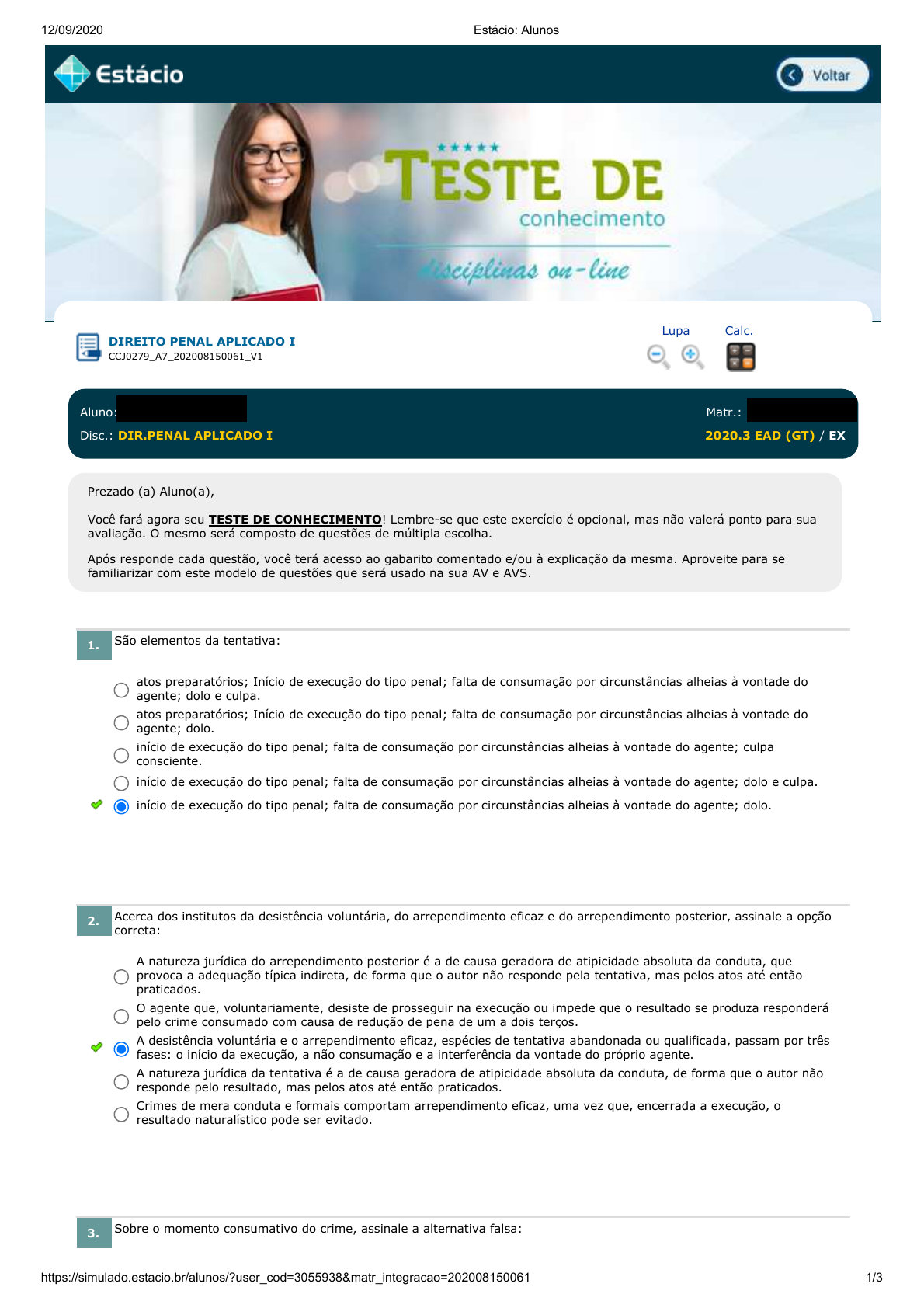 12/09/2020 Estácio: Alunos https://simulado.estacio.br/alunos/?user_cod=3055938&matr_integracao=202008150061 1/3 São elementos da tentativa: Acerca dos institutos da desistência voluntária, do arrependimento eficaz e do arrependimento posterior, assinale a opção correta: Sobre o momento consumativo do crime, assinale a alternativa falsa: DIREITO PENAL APLICADO I Lupa Calc. CCJ0279_A7_202008150061_V1 Aluno: DIEGO GABRIEL Matr.: 202008150061 Disc.: DIR.PENAL APLICADO I 2020.3 EAD (GT) / EX Prezado (a) Aluno(a), Você fará agora seu TESTE DE CONHECIMENTO! Lembre-se que este exercício é opcional, mas não valerá ponto para sua avaliação. O mesmo será composto de questões de múltipla escolha. Após responde cada questão, você terá acesso ao gabarito comentado e/ou à explicação da mesma. Aproveite para se familiarizar com este modelo de questões que será usado na sua AV e AVS. 1. atos preparatórios; Início de execução do tipo penal; falta de consumação por circunstâncias alheias à vontade do agente; dolo e culpa. atos preparatórios; Início de execução do tipo penal; falta de consumação por circunstâncias alheias à vontade do agente; dolo. início de execução do tipo penal; falta de consumação por circunstâncias alheias à vontade do agente; culpa consciente. início de execução do tipo penal; falta de consumação por circunstâncias alheias à vontade do agente; dolo e culpa. início de execução do tipo penal; falta de consumação por circunstâncias alheias à vontade do agente; dolo. 2. A natureza jurídica do arrependimento posterior é a de causa geradora de atipicidade absoluta da conduta, que provoca a adequação típica indireta, de forma que o autor não responde pela tentativa, mas pelos atos até então praticados. O agente que, voluntariamente, desiste de prosseguir na execução ou impede que o resultado se produza responderá pelo crime consumado com causa de redução de pena de um a dois terços. A desistência voluntária e o arrependimento eficaz, espécies de tentativa abandonada ou qualificada, passam por três fases: o início da execução, a não consumação e a interferência da vontade do próprio agente. A natureza jurídica da tentativa é a de causa geradora de atipicidade absoluta da conduta, de forma que o autor não responde pelo resultado, mas pelos atos até então praticados. Crimes de mera conduta e formais comportam arrependimento eficaz, uma vez que, encerrada a execução, o resultado naturalístico pode ser evitado. 3. 12/09/2020 Estácio: Alunos https://simulado.estacio.br/alunos/?user_cod=3055938&matr_integracao=202008150061 2/3 Adalberto, auxiliar de enfermagem, durante uma festa, desejando provocar o aborto na sua ex-namorada Magnólia lhe serve um drinque que contém grande quantidade de substância abortiva. Magnólia, após ingerir a bebida sente-se mal e pede carona a Adalberto que, prontamente aceita o pedido. Durante o trajeto Adalberto, ao perceber que Magnólia ainda demonstra interesse por ele e, em decorrência da substância abortiva ingerida apresenta fortes dores abdominais, Adalberto decide levá-la rapidamente ao hospital mais próximo a fim de tentar evitar a consumação do delito inicialmente visado por ele. Ao chegar ao hospital, Magnólia foi prontamente socorrida, uma vez que Adalberto era a ele conhecido por todos. Após detalhados exames, Adalberto questiona a um dos médicos acerca da saúde de sua amada e de seu bebê, quando é surpreendido pela notícia de que Magnólia não se encontrava grávida, mas apenas sofrera um breve mal-estar decorrente de alguma substância que ingerira na festa. Diante do caso concreto apresentado, assinale a alternativa correta em relação à conduta e respectiva responsabilização penal de Adalberto: Tadeu, desejando matar Marcelo, vai à sua casa e, pela madrugada, penetra no quarto onde este dormia, descarregando o revolver que portava. Em seguida se retira. Submetido a exame cadavérico, os legistas concluem que Marcelo morrera em razão de um enfarto, horas antes de ser atingido pelos disparos de Tadeu: Tulio, desejando matar Marcos, vai até a casa do mesmo e aciona por seis vezes o gatilho do revólver que era autorizado a portar, enquanto Marcos dormia. Porém, todas as munições falham e, diante disso, Tulio resolve ir embora sem atingir seu intento. Diante dos fatos narrados, é correto afirmar que: nos crimes materiais, a consumação ocorre com o evento ou resultado; nos crimes culposos, só há consumação com o resultado naturalístico; nos crimes permanentes, a consumação se protrai no tempo, desde o instante em que se reúnem os seus elementos até que cesse o comportamento do agente; nos crimes formais a consumação ocorre com a própria ação, já que não se exige resultado naturalístico; nos crimes omissivos impróprios, a consumação ocorre com a simples omissão do agente. 4. Será responsabilizado pelo delito de aborto sem o consentimento da gestante na forma tentada. Será isento de pena, por exclusão de sua culpabilidade. Sua conduta em relação ao aborto será atípica por tratar-se de arrependimento eficaz. Sua conduta em relação ao aborto será atípica por tratar-se de crime impossível. Sua conduta em relação ao aborto será atípica por tratar-se de arrependimento posterior. 5. Deu-se crime impossível por ineficácia do meio utilizado Houve homicídio tentado Deu-se crime impossível por impropriedade do objeto material Houve homicídio doloso com a qualificadora do meio que tornou impossível a defesa da vítima Deu-se violação de cadáver Explicação: O ALUNO DEVERÁ CONHECER AS DIFERENÇAS SOBRE TENTATIVA, ARREPENDIMENTO EFICAZ E DESISTENCIA VOLUNTARIA E ARREPENDIMENTO POSTERIOR E CRIME IMPOSSIVEL. 6. Todas as alternativas acima estão incorretas Houve crime impossível por impropriedade absoluta do objeto Houve desistência voluntária Houve crime impossivel por ineficacia absoluta do meio H