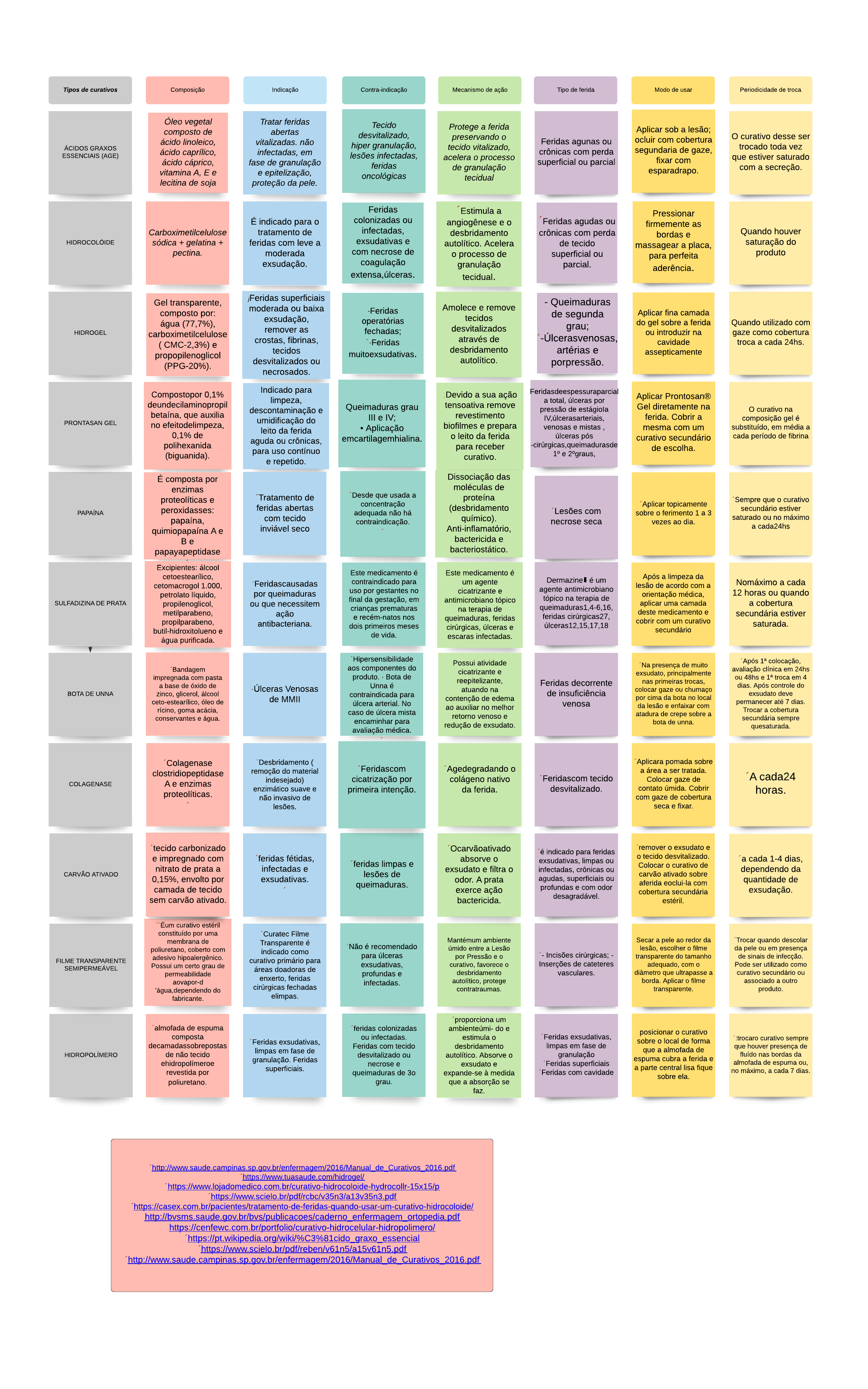 Tipos de curativos Composição Óleo vegetal composto de ácido linoleico, ácido caprílico, ácido cáprico, vitamina A, E e lecitina de soja Tratar feridas abertas vitalizadas. não infectadas, em fase de granulação e epitelização, proteção da pele. Tecido desvitalizado, hiper granulação, lesões infectadas, feridas oncológicas Protege a ferida preservando o tecido vitalizado, acelera o processo de granulação tecidual Feridas agunas ou crônicas com perda superficial ou parcial ÁCIDOS GRAXOS ESSENCIAIS (AGE) Modo de usar Aplicar sob a lesão; ocluir com cobertura segundaria de gaze, fixar com esparadrapo. O curativo desse ser trocado toda vez que estiver saturado com a secreção. Periodicidade de troca HIDROCOLÓIDE PAPAÍNA HIDROPOLÍMERO HIDROGEL FILME TRANSPARENTE SEMIPERMEÁVEL PRONTASAN GEL SULFADIZINA DE PRATA Carboximetilcelulose sódica + gelatina + pectina. Gel transparente, composto por: água (77,7%), carboximetilcelulose ( CMC-2,3%) e propopilenoglicol (PPG-20%). Compostopor 0,1% deundecilaminopropil betaína, que auxilia no efeitodelimpeza, 0,1% de polihexanida (biguanida). É composta por enzimas proteolíticas e peroxidasses: papaína, quimiopapaína A e B e papayapeptidase ´ ´almofada de espuma composta decamadassobrepostas de não tecido ehidropolímeroe revestida por poliuretano. ´´Éum curativo estéril constituído por uma membrana de poliuretano, coberto com adesivo hipoalergênico. Possui um certo grau de permeabilidade aovapor-d 'água,dependendo do fabricante. É indicado para o tratamento de feridas com leve a moderada exsudação. jFeridas superficiais moderada ou baixa exsudação, remover as crostas, fibrinas, tecidos desvitalizados ou necrosados. Indicado para limpeza, descontaminação e umidificação do leito da ferida aguda ou crônicas, para uso contínuo e repetido. ´Tratamento de feridas abertas com tecido inviável seco ´Curatec Filme Transparente é indicado como curativo primário para áreas doadoras de enxerto, feridas cirúrgicas fechadas elimpas. ´feridas fétidas, infectadas e exsudativas. ´ ´Feridas exsudativas, limpas em fase de granulação. Feridas superficiais. Feridas colonizadas ou infectadas, exsudativas e com necrose de coagulação extensa,úlceras. ·Feridas operatórias fechadas; ´·Feridas muitoexsudativas. Queimaduras grau III e IV; - Aplicação emcartilagemhialina. ´feridas colonizadas ou infectadas. Feridas com tecido desvitalizado ou necrose e queimaduras de 3o grau. ´Desde que usada a concentração adequada não há contraindicação. ´ ´feridas limpas e lesões de queimaduras. ´Não é recomendado para úlceras exsudativas, profundas e infectadas. ´Estimula a angiogênese e o desbridamento autolítico. Acelera o processo de granulação tecidual. Amolece e remove tecidos desvitalizados através de desbridamento autolítico. :Devido a sua ação tensoativa remove revestimento biofilmes e prepara o leito da ferida para receber curativo. Dissociação das moléculas de proteína (desbridamento químico). Anti-inflamatório, bactericida e bacteriostático. Mantémum ambiente úmido entre a Lesão por Pressão e o curativo, favorece o desbridamento autolítico, protege contratraumas. ´Ocarvãoativado absorve o exsudato e filtra o odor. A prata exerce ação bactericida. ´proporciona um ambienteúmi- do e estimula o desbridamento autolítico. Absorve o exsudato e expande-se à medida que a absorção se faz. Feridasdeespessuraparcial a total, úlceras por pressão de estágioIa IV,úlcerasarteriais, venosas e mistas , úlceras pós -cirúrgicas,queimadurasde 1º e 2ºgraus, - Queimaduras de segunda grau; ´-Úlcerasvenosas, artérias e porpressão. ´Feridas agudas ou crônicas com perda de tecido superficial ou parcial. Aplicar Prontosan® Gel diretamente na ferida. Cobrir a mesma com um curativo secundário de escolha. ´Lesões com necrose seca Dermazine é um agente antimicrobiano tópico na terapia de queimaduras1,4-6,16, feridas cirúrgicas27, úlceras12,15,17,18 Feridas decorrente de insuficiência venosa ´é indicado para feridas exsudativas, limpas ou infectadas, crônicas ou agudas, superficiais ou profundas e com odor desagradável. ´Feridascom tecido desvitalizado. ´- Incisões cirúrgicas; - Inserções de cateteres vasculares. ´Feridas exsudativas, limpas em fase de granulação ´Feridas superficiais ´Feridas com cavidade Aplicar fina camada do gel sobre a ferida ou introduzir na cavidade assepticamente ´Aplicar topicamente sobre o ferimento 1 a 3 vezes ao dia. Após a limpeza da lesão de acordo com a orientação médica, aplicar uma camada deste medicamento e cobrir com um curativo secundário ´Na presença de muito exsudato, principalmente nas primeiras trocas, colocar gaze ou chumaço por cima da bota no local da lesão e enfaixar com atadura de crepe sobre a bota de unna. ´Aplicara pomada sobre a área a ser tratada. Colocar gaze de contato úmida. Cobrir com gaze de cobertura seca e fixar. ´remover o exsudato e o tecido desvitalizado. Colocar o curativo de carvão ativado sobre aferida eoclui-la com cobertura secundária estéril. Secar a pele ao redor da lesão, escolher o filme transparente do tamanho adequado, com o diâmetro que ultrapasse a borda. Aplicar o filme transparente. posicionar o curativo sobre o local de forma que a almofada de espuma cubra a ferida e a parte central lisa fique sobre ela. Quando houver saturação do produto Quando utilizado com gaze como cobertura troca a cada 24hs. ´Sempre que o curativo secundário estiver saturado ou no máximo a cada24hs Nomáximo a cada 12 horas ou quando a cobertura secundária estiver saturada. ´Após 1ª colocação, avaliação clínica em 24hs ou 48hs e 1ª troca em 4 dias. Após controle do exsudato deve permanecer até 7 dias. Trocar a cobertura secundária sempre quesaturada. ´Trocar quando descolar da pele ou em presença de sinais de infecção. Pode ser utilizado como curativo secundário ou asso