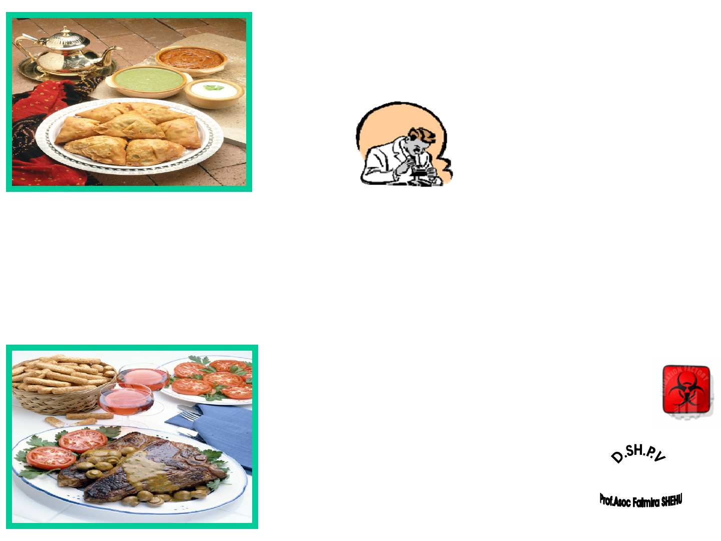 .....USHQIMET, SI MUND TE KONTAMINOHEN? KONTAMINIMI BIOLOGJIKKONTAMINIMI BIOLOGJIK Shendeti PublikShendeti Publik Siguria ushqimoreSiguria ushqimore KONTAMINIMI BIOLOGJIKKONTAMINIMI BIOLOGJIK Të përshkruani kushte të pasigurisë së ushqimeve. Të përshkruani shkurtimisht llojet e ndryshme të ndotësve biologjik, burimet dhe ndikimet e tyre të mundëshme mbi shëndetin Të tregoni rrugët e mundëshme të transmetimit të ndotësve mikrobiologjik të ushqimit. Faktorët që sjellin kontaminimin biologjik në ushqime. Cilet jane kushtet qe favorizojne zhvillimin e bakterieve ne ushqime ? Të identifikoni rreziqet dhe risqet në faza të ndryshme të prodhimit dhe konsumit të ushqimeve. PERMBAJTJA Cilesia e njCilesia e njëë ushqimiushqimi Ciles ia ushq yese Siguria kimike ••PesticidetPesticidet ••Metalet e rMetalet e rëëndanda ••Mykotoksinat, etjMykotoksinat, etj Siguria Siguria mikrobiologjike ++ Rrezik!Rrezik! 1. Lënda e parë, ose produkte që duhet të kalojnë në faza të ndryshme të përpunimit përpara se të konsumohen (mish, vezë, produkte itike); 2. Gjysëm të përpunuara, ose ushqime jo plotësisht të kaluara në procese që para konsumit kërkojnë një trajtim termik (përgatitje të përzjera krudo, ushqime me vezë jo të mbushura); 3. Ushqime të procesuara të gatëshme për konsum, ose ushqime që kanë pësuar një trajim termik si hap të fundit (primi o secondi piatti e verdure cotte) dhe ushqime në të cilat tarjtimi termik nuk bëhet ose bëhet si hap i fundit (perime të lara, mbushje pasticerie, akullore, përgatitje me shumë ingredientë). Kushte të pasigurisë së ushqimeveKushte tKushte tëë pasigurispasigurisëë ssëë ushqimeveushqimeve Origjiojne nga agresioni i ardhur në ushqime nga ana e agjentëve biologjik, insektet, larvat e tyre, jashtëqitjet e roditorëve,etj. Origjiojne nga agresioni i ardhur nOrigjiojne nga agresioni i ardhur nëë ushqime nga ana e agjentushqime nga ana e agjentëëve biologjik, ve biologjik, insektet, larvat e tyre, jashtinsektet, larvat e tyre, jashtëëqitjet e qitjet e roditorroditorëëve,etj.ve,etj. Rreziqet biologjike nRreziqet biologjike nëë ushqim qushqim qëë interesojninteresojnëë shshëëndetin ndetin publik ppublik pëërfshijnrfshijnëë shtamet patogjene tshtamet patogjene tëë bakterieve, virusbakterieve, virusëët, t, parazitet, helmintet, protozoarparazitet, helmintet, protozoarëët, algat dhe produkte tt, algat dhe produkte tëë caktuara toksike qcaktuara toksike qëë ato mund tato mund tëë prodhojnprodhojnëë. . - Përmirësimi i standardit jetësor të higjienës - Sistemet e ruajtjes më të efektshme - Mekanizimin e proceseve të mirëmbajtje - Shpërndarja e frigoriferëve në familje KONTAMINIMI BIOLOGJIKKONTAMINIMI BIOLOGJIK ………..në vitet e kaluara Kanë kontribuar në luftimin e ndotjes mikrobiale.Kanë kontribuar në luftimin e ndotjes mikrobiale. SOTSOT PPëërhapjarhapja e e ushqimitushqimit kolektivkolektiv dhedhe kateringutkateringut RritjeRritje ttëë rasteverasteve ttëë kontaminimitkontaminimit dhedhe ttëë episodeveepisodeve toksinfektivetoksinfektive.. NE DITET E SOTMENE DITET E SOTME FAKTORE QE SJELLIN KONTAMINIMIN E USHQIMEVE FAKTORE QE SJELLIN KONTAMINIMIN E USHQIMEVE 1. Ushqime krudo fillimisht të kontaminuara. 2. Alimentaristë portator të agjentëve patogjen që prekin ushqimin e destinuar për një trajtim pasues termik. 3. Kontaminimi i kryqëzuar ndërmjet ushqimeve Krudo dhe të gatuara. 4. Përdorimi i ushqimit “të avancuar". 5. Furnizimi nga burime të pasigurta (fruta deti, qumësht krudo, konserva dhe ushqime shtëpiake) 6. Konservimi në zona me kondensim ose pikim. RREZIKU I KONTAMINIMITRREZIKU I KONTAMINIMITRREZIKU I KONTAMINIMIT Sa më tepër një ushqim të jetë i manipuluar / shumë ingredientë, më i rritur është nr. i m.o Sa mSa mëë teptepëër njr njëë ushqim tushqim tëë jetjetëë i i manipuluar / shummanipuluar / shumëë ingredientingredientëë, m, mëë i i rritur rritur ëështshtëë nr. i m.o nr. i m.o Sa më i lartë të jetë nr. i m.o, më e ulët është cilësia higjieniko-sanitare e ushqimit Sa mSa mëë i larti lartëë ttëë jetjetëë nr. i m.o, mnr. i m.o, mëë e ule ulëët t ëështshtëë cilcilëësia sia higjienikohigjieniko--sanitare e sanitare e ushqimit ushqimit Jetë-gjatësia (Schef-life) uletJetJetëë--gjatgjatëësia (Schefsia (Schef--life) uletlife) ulet duartduartgojagoja kolla hundahunda ajri tështima plagplagëëtt llëëkurakura fefeççetet Vegla-veshje USHQIMI ingredientët MIKRORGANIZMATMIKRORGANIZMATMIKRORGANIZMAT Edhe pse nuk duken, mikrorganizmat ndodhen kudo, ne mund t’i hamë vazhdimisht dhe në pjesën më të madhe të rasteve nuk krijojnë probleme Edhe pse nuk duken, mikrorganizmat ndodhen kudo, ne mund t’i hamë vazhdimisht dhe në pjesën më të madhe të rasteve nuk krijojnë probleme Në ushqime ndodhen shumë substanca ushqyese dhe mund të shumëzohen mirë NNëë ushqimeushqime ndodhenndodhen shumshumëë substancasubstanca ushqyeseushqyese dhedhe mundmund ttëë shumshumëëzohenzohen mirmirëë Nqs.janë shumë Nqs.janë shumë Dëmtojnë ushqiminDëmtojnë ushqimin Mund të provokojnë sëmundje ushqimoreMund të provokojnë sëmundje ushqimore Kontaminim i kryqëzuarKontaminim i kryqKontaminim i kryqëëzuarzuar KarkasKarkasëë--karkaskarkasëë;; ••Mish i bardhMish i bardhëë-- mish i kuq;mish i kuq; ••MishMish--perime;perime; ••Produkte tProdukte tëë bbëërara--produkte krudo;produkte krudo; ••EtjEtj…….... Transmetimi i shtameve nga njTransmetimi i shtameve nga njëë ushqim tek ushqim tek njnjëë tjettjetëër i tr i tëë njnjëëjtjtëës natyrs natyrëë NNëë ççfarfarëëdodo llojlloj mmëënyrenyre dhedhe nnëë ççfarfarëëdodo llojlloj faze faze ttëë vijvijëë kontaminimi mikrobik i ushqimeve, kontaminimi mikrobik i ushqimeve, schefschef--life dhe/ose rrezikshmlife dhe/ose rrezikshmëëria va