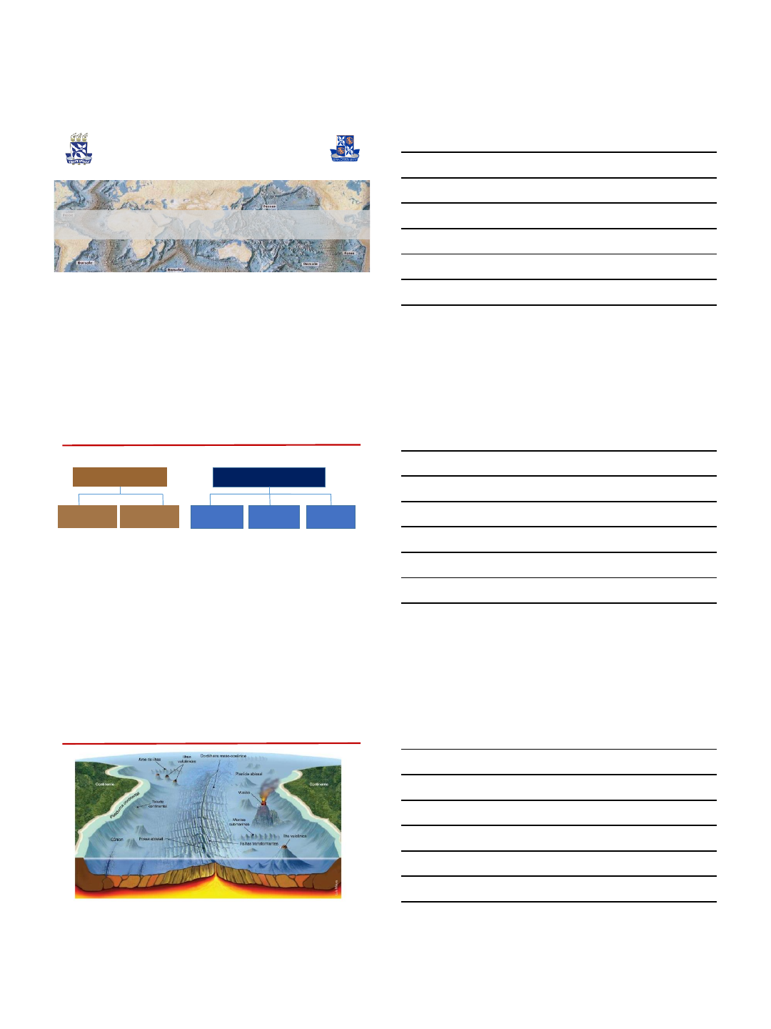 14/06/2017 1 Profa: Carine Santana Silva UNIVERSIDADE FEDERAL DA BAHIA INSTITUTO DE GEOCIÊNCIAS Departamento de Oceanografia Morfologia do Fundo Oceânico Plataforma Continental Domínio OceânicoDomínio Continental Talude Continental Fossas Oceânicas Planícies Abissais Dorsais Oceânicas UNIDADES MORFOLÓGICAS DO FUNDO OCEÂNICO 2 UNIDADES MORFOLÓGICAS DO FUNDO OCEÂNICO 3 14/06/2017 2 UNIDADES MORFOLÓGICAS DO FUNDO OCEÂNICO Margem passiva (ou tipo Atlântico) Margem ativa (ou tipo Pacífico) 1. Plataforma Continental 2. Talude 3. Sopé do Talude 1. Plataforma Continental 2. Talude 3. Fossa Oceânica 4. Arcos de Ilha 4 Prolongamento da área continental; Planície submersa que margeia todos os continentes; Extensão varia de 70 km a 1.000 km; Nessa região a luz do sol atinge praticamente o fundo oceânico Plâncton fotossíntese Cadeia alimentar marinha Regiões pesqueiras; PLATAFORMA CONTINENTAL 5 PLATAFORMA CONTINENTAL 6 a) Plataforma Continental – Declividade média de 1:1000 Vai desde a linha de praia até a quebra da plataforma, que ocorre em profundidades médias de 130 m. No Brasil: Maior largura foz do rio Amazonas (330 km) Menor largura Salvador (8km) 14/06/2017 3 Imediatamente após a plataforma continental. Tem origem sedimentar e inclina- se até o fundo oceânico, atingindo entre 3.000 e 5.000 metros de profundidade. Nessa área encontramos restos de seres marinhos e argila muito fina; TALUDE CONTINENTAL 7 SOPÉ OU ELEVAÇÃO CONTINENTAL 8 Na base dos taludes continentais (margens do tipo atlântico), nota-se a presença de sequências sedimentares (relacionadas aos processos de transporte e deposição de sedimentos) que moldam as plataformas e taludes continentais – elevação ou sopé continental. Sopé Estendem-se do talude continental até as encostas das cordilheiras oceânicas; Profundidade superior a 5.000 m; Podem ser interrompidas por montes submarinos (altura ~200- 1.000m) ou por montanhas submarinas de origem vulcânica (> 1.000m) Zona afótica Fauna adaptada às altas pressões e baixas temperaturas. PLANÍCIE ABISSAL 9 14/06/2017 4 São depressões alongadas (compridas) e estreitas, com grande inclinação que ocorrem ao longo das áreas de subducção de placas tectônicas; São fendas que atingem grandes profundidades entre 7.000 e 11.037m, onde a placa oceânica mergulha de volta para o manto. FOSSAS OCEÂNICAS Maiores fossas do mundo: Oceano Pacífico: das Filipinas (10.790m) e das Marianas (11.000 m); Oceano Atlântico: de Milwaukee – Porto Rico (9.220 m); Oceano Índico: de Sonda (7.100 m). 10 Elevações que ocorrem de forma regular ao longo dos oceanos; Comprimento total de 84 mil km e largura de ~ 1000 Km; Área de intensa atividade sísmica e vulcânica separação da crosta submarina em 2 partes = “cicatriz” produzida na separação dos continentes; Oceano Atlântico: Dorsal Mesoceânica ou Mesoatlântica. CORDILHEIRA OCEÂNICA OU DORSAL OCEÂNICA 11 Situam-se na plataforma continental; ILHAS COSTEIRAS São picos elevados e emersos das cadeias dorsais ou cordilheiras oceânicas; ILHAS OCEÂNICAS 12 14/06/2017 5 Bibliografia básica 13