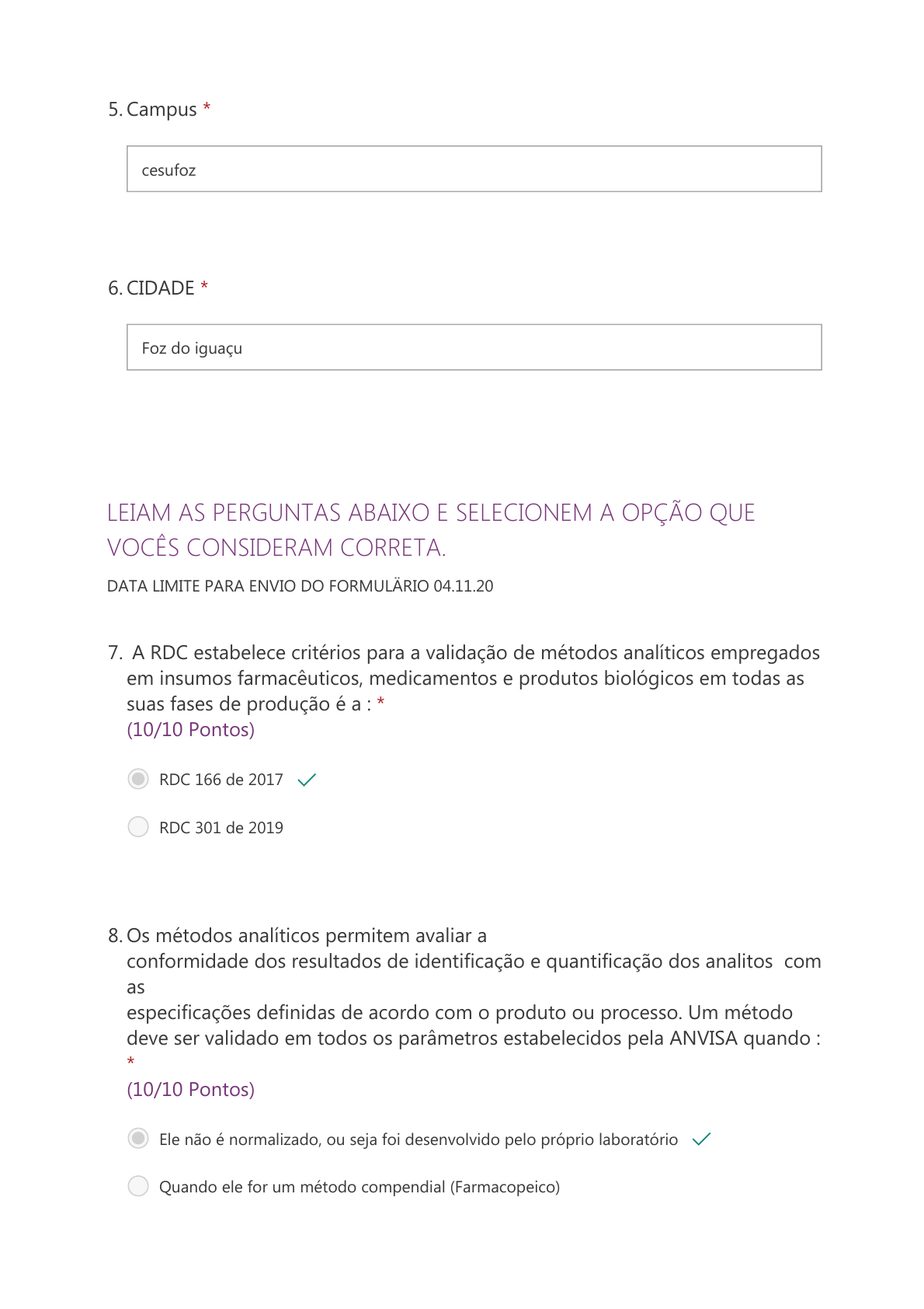 13/10/2020 ATIVIDADE AVALIATIVA DISCIPLINA : INTRODUÇÃO EM CIÊNCIAS FARMACÊUTICAS https://forms.office.com/Pages/ResponsePage.aspx?id=jOaT0T_lEEambVb_MA_sevoyrwj3Qr5Ig4VXM_j7MspUMDg4R01IMDhDQjVOUVZGS1Y… 2/5 Campus * 5. cesufoz CIDADE * 6. Foz do iguaçu LEIAM AS PERGUNTAS ABAIXO E SELECIONEM A OPÇÃO QUE VOCÊS CONSIDERAM CORRETA. DATA LIMITE PARA ENVIO DO FORMULÄRIO 04.11.20 A RDC estabelece critérios para a validação de métodos analíticos empregados em insumos farmacêuticos, medicamentos e produtos biológicos em todas as suas fases de produção é a : * (10/10 Pontos) 7. RDC 166 de 2017 RDC 301 de 2019 Os métodos analíticos permitem avaliar a conformidade dos resultados de identificação e quantificação dos analitos com as especificações definidas de acordo com o produto ou processo. Um método deve ser validado em todos os parâmetros estabelecidos pela ANVISA quando : * (10/10 Pontos) 8. Ele não é normalizado, ou seja foi desenvolvido pelo próprio laboratório Quando ele for um método compendial (Farmacopeico) 13/10/2020 ATIVIDADE AVALIATIVA DISCIPLINA : INTRODUÇÃO EM CIÊNCIAS FARMACÊUTICAS https://forms.office.com/Pages/ResponsePage.aspx?id=jOaT0T_lEEambVb_MA_sevoyrwj3Qr5Ig4VXM_j7MspUMDg4R01IMDhDQjVOUVZGS1Y… 3/5 Um projeto para a validação de metodologia analítica, deve ser desenvolvido e planejado de modo a garantir que todas as atividades relacionadas estejam devidamente registradas. O documento que deve ser elaborado junto com a equipe , antes de iniciar o processo de validação chama-se: * (10/10 Pontos) 9. Protocolo de validação Relatório final de validação Na validação de métodos analíticos, deverá ser utilizada um material de Referência oficializado pela Farmacopeia Brasileira, preferencialmente, ou por outros compêndios oficialmente reconhecidos pela Anvisa. Esse material é chamado de: * (10/10 Pontos) 10. Material certificado básico Substância Química de Referência Farmacopeica O parâmetro que deve ser demonstrado por meio da comprovação de que a resposta analítica se deve exclusivamente ao analito, sem interferência do diluente, da matriz, de impurezas ou de produtos de degradação e que é definido como o grau em que um método pode quantificar uma substância com precisão na presença de interferências nas condições indicadas do ensaio para a amostra matriz em estudo é denominado : * (10/10 Pontos) 11. linearidade Seletividade O parâmetro analítico que expressa a proximidade entre os resultados obtidos da análise de uma mesma amostra, no mesmo laboratório, em pelo menos dois dias diferentes, realizada por operadores distintos contemplando as mesmas concentrações e o mesmo número de determinações descritas na avaliação da repetibilidade. * (10/10 Pontos) 12. Precisão 13/10/2020 ATIVIDADE AVALIATIVA DISCIPLINA : INTRODUÇÃO EM CIÊNCIAS FARMACÊUTICAS https://forms.office.com/Pages/ResponsePage.aspx?id=jOaT0T_lEEambVb_MA_sevoyrwj3Qr5Ig4VXM_j7MspUMDg4R01IMDhDQjVOUVZGS1Y… 4/5 Exatidão A precisão é a avaliação da proximidade dos resultados obtidos em uma série de medidas de uma amostragem múltipla de uma mesma amostra. A precisão é expressa em função do cálculo do: * (10/10 Pontos) 13. Desvio-padrão ou Coeficiente de Variação Erro relativo A diferença entre precisão intermediária e repetitividade é que : * (10/10 Pontos) 14. Precisão intermediária inclui a influência de efeitos aleatórios de acordo com o uso pretendido do método dentro do mesmo laboratório, mas variando operador, instrumento e dias tem que ser alterados. Já a repetitividade é obtenção de resultados a partir de ensaios independentes, com o mesmo método, com material de ensaio idêntico, no mesmo laboratório, pelo mesmo operador e utilizando o mesmo equipamento. A precisão intermediária é avaliada pelo desvio-padrão e a repetitividade pelo cálculo do erro absoluto Linearidade é a capacidade de um método analítico de demonstrar que os resultados obtidos são diretamente proporcionais à concentração do analito na amostra, dentro de um intervalo especificado. De acordo com a RDC 166 /2017 , qual deve ser o valor mínimo do coeficiente de regressão linear ( correlação R2) ,aceito para que o método apresente linearidade? * (10/10 Pontos) 15. 1,000 0,990 13/10/2020 ATIVIDADE AVALIATIVA DISCIPLINA : INTRODUÇÃO EM CIÊNCIAS FARMACÊUTICAS https://forms.office.com/Pages/ResponsePage.aspx?id=jOaT0T_lEEambVb_MA_sevoyrwj3Qr5Ig4VXM_j7MspUMDg4R01IMDhDQjVOUVZGS1Y… 5/5 Esse conteúdo foi criado pelo proprietário do formulário. Os dados que você enviar serão enviados ao proprietário do formulário. Nunca forneça sua senha. Da plataforma Microsoft Forms | Política de privacidade | Condições de uso Voltar à página de agradecimento A exatidão deve ser expressa pela relação percentual de recuperação do analito de concentração conhecida adicionado à amostra ou pela relação entre a concentração média, determinada experimentalmente, e a concentração teórica correspondente, dada pela fórmula abaixo. Qual os valores da recuperação aproximada para a concentração a 80% e 100% , respectivamente , que completam a tabela abaixo? Fórmula Recup(%)= Concentração obtida/ concentração teórica x100 %. Concentração Teórica mg/ml Concentração Obtida mg/ml 80 0,0804 0,0799 100 0,1005 0,0995 * (10/10 Pontos) 16. 99,4 e 99,0% 80 e 100% http://go.microsoft.com/fwlink/p/?LinkId=2083423 https://go.microsoft.com/fwlink/p/?linkid=857875 javascript:void(0)