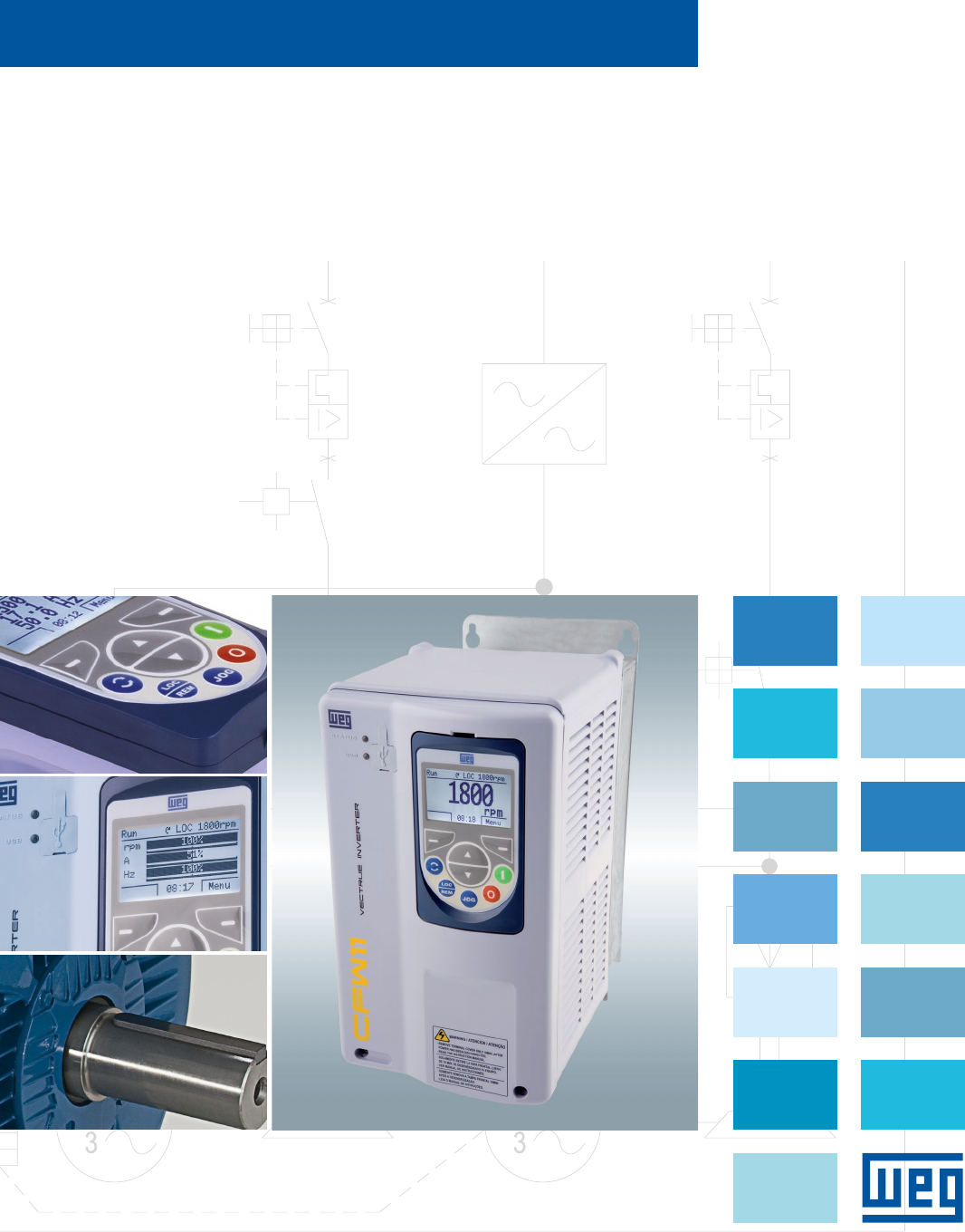 CFW11 Inversor de Frequência Motores | Automação | Energia | Transmissão & Distribuição | Tintas www.weg.net CFW11 - Inversor de Frequência2 Tecnologia Vectrue Technology® Tecnologia de Controle dos Inversores de Frequência WEG g Escalar V/F linear ou ajustável: controle da velocidade do motor com compensação de escorregamento g VVW - Voltage Vector WEG - controle vetorial de tensão: controle da velocidade do motor com ajuste automático as variações de carga e rede g Vetorial sensorless (sem encoder) - motores de indução: controle vetorial de torque e velocidade com alta resposta dinâmica, mesmo em baixas velocidades g Vetorial com encoder: controle vetorial de torque e velocidade com alta resposta dinâmica em toda a faixa de velocidade (até motor parado) g Vetorial WMagnet sensorless (sem encoder) e com encoder: controle vetorial com alta resposta dinâmica para motores WMagnet WEG em toda a faixa de velocidade Frenagem Ótima - Optimal Braking® Tecnologia de Frenagem dos Inversores de Frequência WEG Disponível nos modos de controle vetorial permite a frenagem controlada do motor, eliminando em algumas aplicações, o uso do resistor de frenagem. Pode ser aplicada em acionamentos de alta performance dinâmica, com torques frenantes da ordem de 5 vezes o torque característico de uma frenagem CC e sem a utilização de resistor de frenagem, tornando-se uma solução eficaz e de custo reduzido para aplicações com frenagem. CFW11 - Inversor de Frequência É um acionamento de velocidade variável com tecnologia de última geração para motores de indução trifásicos e motores de ímã permanente (PM) WMagnet WEG. Apresenta excelente performance estática e dinâmica, controle preciso de torque, velocidade, posicionamento e alta capacidade de sobrecarga, possibilitando um aumento de produtividade, qualidade e economia de energia elétrica nos processos onde é utilizado. Curva de torque para frenagem reostática Curva de torque para Optimal Braking® Curva de torque para frenagem CC Gráfico Torque x Rotação típico para motor de 10 cv acionado por inversor CFW11 Torque (%) 100 (%) TB1 0 0 20% 100% 200% Rotação (%) Produto beneficiado pela Lei da Informática REDUZIDO IPI www.weg.net CFW11 - Inversor de Frequência 3 Fluxo Ótimo® Tecnologia para Acionamento de Motores de Alto Rendimento Plus Esse tipo de acionamento quando utilizado em conjunto com os inversores de frequência CFW11 com Fluxo Ótimo®, em aplicações com cargas de torque constante, proporcionam torque nominal em baixas rotações, eliminando a necessidade de ventilação independente ou o sobredimensionamento do motor. g Melhor desempenho g Redução de espaço e custos WMagnet Drive System® Sistema de Acionamento com Motor de Ímãs Permanentes WMagnet® Motor mais compacto, de maior eficiência e economia do mercado, com inversor de frequência CFW11. Perfeito para aplicações onde variação de velocidade, baixo nível de ruído e tamanho reduzido são essenciais. Controle sensorless com controle de torque em velocidade zero, operação em baixas velocidades, dispensando o uso de ventilação forçada. Também disponível com controle vetorial com e sem encoder. Nota: para maiores detalhes consulte o catálogo do WMagnet Drive System® Tecnologia Software SuperDrive G2 g Conexão USB com o inversor g Parametrização, comando e sinalização g Gravação de software aplicativo (via SoftPLC) g Monitoração e ajuda on-line g Gratuito no site www.weg.net g Função Trace g Registro e visualização gráfica das variáveis do CFW11 g Excelente ferramenta para diagnósticos de defeitos g Simula um osciloscópio g Inclusa no software SuperDrive G2 Função Trace Software SuperDrive G2 Função SoftPLC Disponível na versão padrão do CFW11, essa função de software agrega ao CFW11 as funcionalidades de um CLP - controlador lógico programável, permitindo a criação de aplicativos de software próprios. Outras Vantagens g Software de programação WLP (WEG Ladder Programmer) gratuito no site WEG g Conexão USB com o CFW11 g Linguagem de programação ladder g Blocos de CLP, matemáticos e controle g Acesso a todos os parâmetros e E/S do inversor g Parâmetros de usuário programados individualmente g Monitoração e ajuda on-line Software WLP: comunicação USB com o CFW11 para a utilização do SoftPLC Motor de alto rendimento Plus Motor de ímãs permanentes WMagnet® www.weg.net CFW11 - Inversor de Frequência4 O CFW11 possui inovações tecnológicas que simplificam a sua configuração e operação, a instalação de seus acessórios é baseada na filosofia “conecte e use” (do inglês plug-and-play), onde os acessórios são configurados automaticamente quando conectados ao inversor, garantindo mais rapidez e simplicidade. Flexibilidade g Módulos de expansão de entradas e saídas (I/Os) g Módulos de comunicação em rede g Módulo de memória flash (MMF) incluso no produto padrão: g Armazenamento e transferência dos parâmetros do inversor g Ideal para aplicações em fabricantes de máquinas em série g Armazenamento dos softwares aplicativos gerados via SoftPLC Simples e Inovador g Módulo Safe Torque Off (STO) de parada de segurança: g A ativação da função de parada de segurança, bloqueia os pulsos PWM de acionamento dos IGBTs, garantido que o motor permanecerá parado g Categoria 3 PL d / SIL CL 2 com certificação TÜV Rheinland®, conforme as normas EN ISO 13849-1, IEC 61800-5-2, IEC 62061 e IEC 61508 Interface de Operação (IHM) Remota Pode ser instalada em portas de painéis ou consoles de máquinas com grau de proteção IP56.Moldura para montagem da IHM remota: RHMIF-01 (opcional) Slot 5 - Módulo de memória flash incorporado (disponível no produto padrão) Porta USB Slot 1 - Expansão de I/Os (acessório) Slot 2 - Interface com encoder (acessório) Slot 3 - Comunicação 1 (acessório) Slot 4 - Comunicação 2 (acessório) www.weg.net CFW11 - Inverso