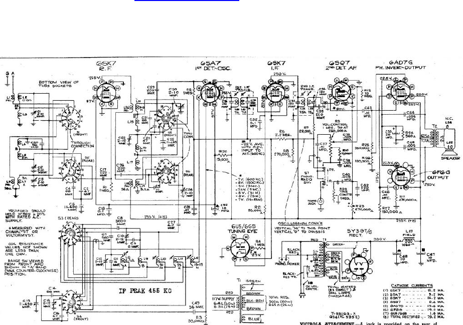 Modelo Q34 - 1947 e 1948 RCA Radio Corporation of America Restauração Em setembro de 2014, recebi alguns receptores antigos por doação da filha do Sargento PM Ibanez Mulina Costa (in memoriam). Aquele policial-militar era mais um apaixonado pelos receptores valvulados e sempre que conseguia algum rádio na sua cidade (Rosário do Sul/RS) atirava-se com denodo na recuperação do equipamento. Embora não obtivesse todas as peças antigas para transformá-lo em um rádio bastante original, todos os seus rádios foram bem conservados e em funcionamento, mesmo que precário devido ao tempo em que ficaram estocados. Dentre tantos rádios recebidos, destacou-se um RCA Q 34, chassi RC539. Trata-se de um super- heteródino construído nos anos 1947 e 1948 pela Radio Corporation of America nos Estados Unidos. O esquema do Q34, cortesia www.nostalgiaair.org, segue abaixo: 1. Verificações iniciais Ao tirar o chassi do gabinete de madeira e após a limpeza de poeira e insetos mortos, observei alguns fatos que em muito contrariavam a originalidade. Várias válvulas não correspondiam às do esquema e a retificação era feita por dois diodos ligados aos fios de alta-tensão do transformador de entrada, como mostram as fotos abaixo. O RCA Q34 usa, quanto ao push-pull, uma válvula 6F6 e uma 6AD7. Esta última também age com driver. Na montagem recebida, no lugar da 6AD7 havia uma outra 6F6 e, como driver, foi posta uma válvula 6J5. Também estava incorreta a válvula que opera como osciladora e mixer: em vez da original 6SA7, foi colocada e ligada por fios à base, uma válvula 6BE6. http://www.nostalgiaair.org/ O chassi como foi recebido com as válvulas não originais. À esquerda o esquema original das válvulas e à direita a válvula exótica 6BE6, ligada com uma adaptação por fios à base da original 6SA7. Na foto, o uso de dois diodos retificadores ligados na alta-tensão do transformador de entrada. O transformador de saída em push-pull e um choque estavam aparafusados no canto superior direito da parte traseira da caixa, conforme a foto abaixo. Por outro lado, o alto-falante original deste RCA Q34 é de um tipo raro, com forma oval e funcionamento eletrodinâmico. Não obtendo tal peça, o antigo proprietário usou um AF oval, porém com ímã permanente, necessitando então de um choque de filtro, o qual prendeu na madeira, junto ao transformador de push-pull. 2. A retificação por válvula e o alto-falante Nas restaurações eu sempre começo providenciando a tensão retificada de funcionamento, o chamado +B (VCC), o que resultou na colocação de uma base para a válvula retificadora 5Y3 e suas ligações de alta-tensão e filamentos. Inobstante eu ter recebido o rádio com retificação a diodo, por sorte, o transformador de entrada possuía as saídas de 5 VCA para alimentar os filamentos da válvula retificadora 5Y3 do esquema original. Em seguimento, providenciei um alto-falante eletrodinâmico para servir de choque de filtro para o +B. Infelizmente, eu só tinha um AF circular, posto a raridade de se encontrar um alto-falante eletrodinâmico e oval conforme a fabricação da RCA. Antes da colocação, um novo transformador de push-pull foi montado no alto-falante com o trançado de fios para as duas placas (válvulas 6F6 e 6AD7), a conexão do catodo da válvula retificadora e o retorno do +B (foto abaixo). Após foram montados dois capacitores eletrolíticos de 47 microfarads x 450V cada e refeitas todas as antigas ligações e distribuição da tensão contínua +B. Os demais capacitores defeituosos foram substituídos. Nas fotos abaixo, um aspecto dos capacitores comuns antigos e os dois eletrolíticos novos. 3. As válvulas de saída em push-pull Recebida por gentileza do parceiro Sérgio Caon, instalei a válvula 6AD7. Ela tem duas funções, pois funciona como “driver” e como saída do push-pull. O esquema original da RCA (abaixo à esquerda), esclareceu muito a montagem. Ela opera com a sua parte esquerda (triodo) como inversora de fase ou “driver” e na parte direita (heptodo) como válvula de saída, como a 6F6. Na figura da direita, a montagem pronta e operante, com a 6AD7 entre a 6F6 e a 6SQ7 (detetora). 4. O final do restauro elétrico O circuito foi recebido com capacitores “cansados” e algumas resistências inadequadas. Após a colocação das válvulas corretas e substituídos os capacitores, foi a vez de checar as tensões, com a colocação de novas resistências, deixando as tensões indicadas na tabela abaixo: Válvula Placa (VCC) Screen (VCC) 6F6 230 243 6AD7 Pentodo= 230 Triodo=200 243 6SQ7 146 - 6SK7 FI 243 84 6SK7 RF 243 84 6SA7 243 Screen=84 Anódina= 100 5Y3 Catodo=319 +B = 243 As figuras a seguir mostram como o circuito foi recebido, antes e depois da restauração eletrônica: 4. O tecido “ortofônico” e a restauração do gabinete. Nunca acreditei em “tecidos ortofônicos”, bem entendidos aqueles que foram apregoados a partir da metade da década de 1930. Este foi um nome para vender! Como 99% dos receptores que recebi, este tinha um tecido “heterofônico”, a saber, um retalho qualquer! Antes do pano, tive que acertar o furo da madeira que prende de um lado o alto-falante e de outro o tecido, posto que o receptor recebido possuía um AF elíptico. Com o indispensável auxílio da Helena Halushuk, ajustamos a tabua de sustentação do AF à um desenho circular e fixamos o tecido. E no gabinete do rádio, havia uma trinca, a qual foi restaurada. Melhor que palavras são as fotos: Acima, o gabinete pronto. A seguir foi colocado, na parte inferior e sobre o tecido, uma tira de cartolina preta para fazer o destaque do dial sobre o tecido (foto à esquerda). 5. Pintura do chassi e o controle de tonalidade. Muita limpeza com escova e thinner e duas mãos de laca automotiva. Acima, fotos do restauro do controle de tom, com limpeza interna do potenciômetro e substituição de capacitor. Enfim, inobstante a compreensão das dificu