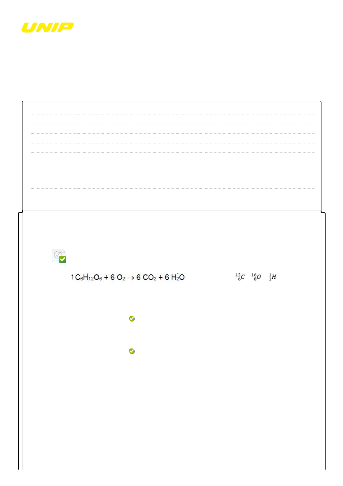15/10/2020 Revisar envio do teste: QUESTIONÁRIO UNIDADE III – J38A_... https://ava.ead.unip.br/webapps/assessment/review/review.jsp?attempt_id=_48594795_1&course_id=_120979_1&content_id=_1624078_1&retur… 1/9 Revisar envio do teste: QUESTIONÁRIO UNIDADE III QUIMICA GERAL J38A_25302-IESFI-PR_20202 CONTEÚDO Usuário ANDRE VINICIUS PAIANO Curso QUIMICA GERAL Teste QUESTIONÁRIO UNIDADE III Iniciado 15/10/20 12:15 Enviado 15/10/20 12:16 Status Completada Resultado da tentativa 4 em 4 pontos Tempo decorrido 1 minuto Resultados exibidos Todas as respostas, Respostas enviadas, Respostas corretas, Comentários, Perguntas respondidas incorretamente Pergunta 1 Resposta Selecionada: b. Respostas: a. b. c. d. e. Feedback da resposta: O processo de respiração celular pode ser resumido assim: a glicose C6H12O6 é “queimada” na presença de oxigênio O2, produzindo CO2, água e energia, a qual é utilizada para diversos processos metabólicos. A reação química que resume este processo é . A partir dos dados é correto afirmar que os valores de massa molar da glicose e do CO2, são, respectivamente, iguais a: 180 g/mol e 44 g/mol. 180 g/mol e 264 g/mol. 180 g/mol e 44 g/mol. 96 g/mol e 22 g/mol. 96 g/mol e 132 g/mol. 24 g/mol e 18 g/mol. Resposta: B Comentário : Observando os dados fornecidos a partir da representação dos elementos químicos C (carbono), H (hidrogênio) e O (oxigênio), utiliza-se os valores de massa que estão acima e à esquerda dos símbolos, e, portanto, a massa do carbono é 12 g/mol, do hidrogênio é 1 g/mol e do oxigênio é 16 g/mol. No cálculo da massa molar das substâncias, vem: C6H12O6 = (6x12) + ASSOCIADA / COLIGADA BIBLIOTECAS MURAL DO ALUNOCONTEÚDOS ACADÊMICOS 0,4 em 0,4 pontos http://company.blackboard.com/ https://ava.ead.unip.br/webapps/blackboard/execute/courseMain?course_id=_120979_1 https://ava.ead.unip.br/webapps/blackboard/content/listContent.jsp?course_id=_120979_1&content_id=_1610512_1&mode=reset https://ava.ead.unip.br/webapps/portal/execute/tabs/tabAction?tab_tab_group_id=_63_1 https://ava.ead.unip.br/webapps/portal/execute/tabs/tabAction?tab_tab_group_id=_27_1 https://ava.ead.unip.br/webapps/portal/execute/tabs/tabAction?tab_tab_group_id=_47_1 https://ava.ead.unip.br/webapps/portal/execute/tabs/tabAction?tab_tab_group_id=_25_1 https://ava.ead.unip.br/webapps/login/?action=logout 15/10/2020 Revisar envio do teste: QUESTIONÁRIO UNIDADE III – J38A_... https://ava.ead.unip.br/webapps/assessment/review/review.jsp?attempt_id=_48594795_1&course_id=_120979_1&content_id=_1624078_1&retur… 2/9 (12x1) + (6x16) = 180 g/mol; CO2 = (1x12) + (2x16) = 44 g/mol. Como o problema pede apenas a massa molar, ou seja, de UM mol de cada substância, estes valores obtidos NÃO devem ser multiplicados pelos coeficientes estequiométricos 1 (da glicose 6 (do CO2). Pergunta 2 Resposta Selecionada: e. Respostas: a. b. c. d. e. Feedback da resposta: As bases, conforme a Teoria de Arrhenius, são substâncias que, quando dissolvidas em água, se dissociam, liberando íon hidroxila como único ânion. No dia a dia, usa-se uma base forte, que se dissocia completamente para desentupir canos e pias; utiliza-se também suspensões de base fracas, com baixa solubilidade e pouco de dissociação, como antiácidos, para neutralizar o excesso de acidez estomacal. Assinale a alternativa que mostra, respectivamente, nome e fórmula de bases que podem ser indicadas para desentupimento de pias e combate à acidez do estômago: NaOH hidróxido de sódio; Al(OH)3, hidróxido de alumínio. SoOH hidróxido de sódio; AlOH, hidróxido de alumínio Mg(OH)2 hidróxido de magnésio; KOH, hidróxido de potássio NaOH hidróxido de sódio; NH4OH hidróxido de amônio. Na(OH)2 hidróxido de sódio; Mg(OH)2, hidróxido de magnésio. NaOH hidróxido de sódio; Al(OH)3, hidróxido de alumínio. Resposta: E Comentário: Hidróxido de sódio NaOH é uma base forte, completamente dissociada, poderosa para desentupir pias; e hidróxido de alumínio é uma base fraca, de baixa solubilidade e pouco dissociada, própria para ser ingerida sem ferir a mucosa da boca e esôfago, a qual vai neutraliza o excesso de acidez (HCl) do estômago. Pergunta 3 O ácido sulfúrico é um ácido muito forte e extremamente corrosivo, apresentando alto poder oxidante e desidratante, sendo capaz de carbonizar compostos orgânicos. No laboratório observamos sua ação sobre a matéria orgânica quando adicionamos ácido sulfúrico 0,4 em 0,4 pontos 0,4 em 0,4 pontos 15/10/2020 Revisar envio do teste: QUESTIONÁRIO UNIDADE III – J38A_... https://ava.ead.unip.br/webapps/assessment/review/review.jsp?attempt_id=_48594795_1&course_id=_120979_1&content_id=_1624078_1&retur… 3/9 Resposta Selecionada: e. Respostas: a. b. c. d. e. Feedback da resposta: concentrado em um béquer com açúcar (sacarose, C12H22O11). Com o tempo, açúcar se transformou em carvão, conforme a ilustração abaixo: H2SO4 → 2H+ + SO42- H2SO4 → H2+ + SO42- H2SO4 → H2+ + SO42- H2SO4 → 2H+ + (SO4-)2 H2SO4 → H2+ + 2SO4- H2SO4 → 2H+ + SO42- Resposta: E Comentário : Como a questão pede ionização total, haverá a liberação de todos os átomos de hidrogênio na forma de H+(sabe-se que H+ é uma abreviação do íon hidrônio, H3O+). Como o ácido sulfúrico tem dois H, eles serão liberados na forma 2H+. Assim, como houve liberação de duas cargas positivas, o íon remanescente apresentará duas cargas negativas, SO42-. Pergunta 4 Resposta Selecionada: a. O Ibuprofeno (substância ativtem ação farmacológica de um agente anti-inflamatório não esteroidal. É um derivado do ácido fenilpropiônico, inibidor da síntese das prostaglandinas, apresentando propriedades analgésicas e antipiréticas. Sua fórmula estrutural está apresentada a seguir. Sobre este composto, é incorreto afirmar que: Sua fórmula molecular é HO2. 0,4 em 0,4 pontos 15/10/2020 Revisar envio do teste: QUESTIONÁRIO UNIDADE III – J38A_... https://ava.ead.u