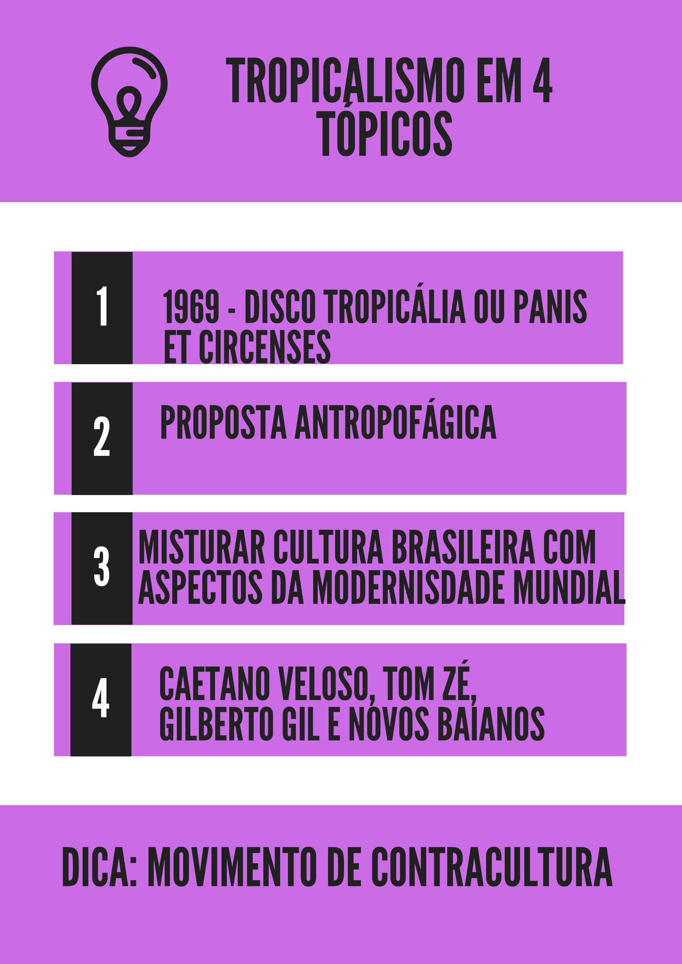 TROPICALISMO EM 4 TÓPICOS CAETANO VELOSO, TOM ZÉ, GILBERTO GIL E NOVOS BAIANOS 1 3 4 DICA: MOVIMENTO DE CONTRACULTURA PROPOSTA ANTROPOFÁGICA 2 1969 - DISCO TROPICÁLIA OU PANIS ET CIRCENSES MISTURAR CULTURA BRASILEIRA COM ASPECTOS DA MODERNISDADE MUNDIAL