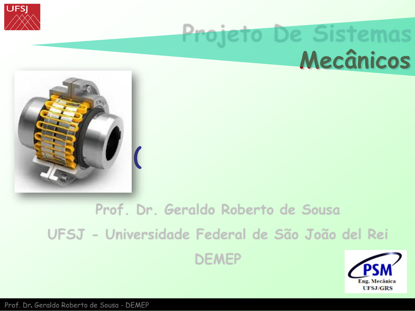 Prof. Dr. Geraldo Roberto de Sousa - DEMEP 1 Projeto De Sistemas Mecânicos Prof. Dr. Geraldo Roberto de Sousa UFSJ - Universidade Federal de São João del Rei DEMEP Acoplamentos: (Atividades de Fixação) Prof. Dr. Geraldo Roberto de Sousa - DEMEP 2 PEDE-SE: Especificar o acoplamento Teteflex da junção motor/redutor, sabendo-se que o comprimento do eixo de saída do motor é 59 mm e do eixo de entrada do redutor é 60 mm. É Dado o SEC: Atividade de Fixação 01 Prof. Dr. Geraldo Roberto de Sousa - DEMEP 3 DADOS SISTEMA DE ELEVAÇÃO DE CARGAS: • Mecanismos p/ trabalho diário (06 horas). • Rendimento do redutor: 97% • Rendimento de cada acoplamento: 98% • Rendimento de cada mancal: 97% • p = 6 (nº de polos do motor) • ED: 100% • Partidas por hora: 10 • Temperatura de trabalho: 50 Graus OBS: Considerar 5% sobre o valor de Q a título de peso próprio das roldanas, cabos, ganhos, etc... PEDE-SE: 1. A especificação e o Dimensionamento dos acoplamentos da árvore do tambor e da junção motor/redutor. Atividade de Fixação 02