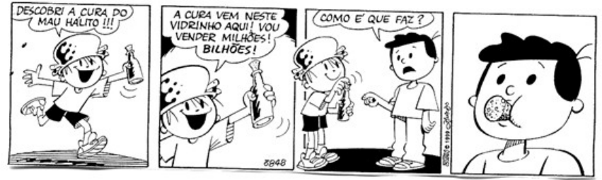 PROFESSORA: INÊS MARIA VARGAS DE SOUZA INTERPRETAÇÃO DE TEXTO – GÊNERO: TIRINHA TURMAS (5º e 6º) DATA /17/10/2020 PESO: 10 AVALIAÇÃO INDIVIDUAL DE INTERPRETAÇÃO DE TEXTO GÊNERO TIRINHAS. ALUNA: MARIA APARECIDA LEMOS Leia o texto e depois responda as questões abaixo: (1ª) Qual o gênero e a tipologia do texto Tirinha (2ª) O humor do texto acontece por que a) Maluquinho descobriu um novo remédio. b) a doença do mau hálito é muito incômoda. c) o remédio é a rolha do vidro e não o seu conteúdo. d) o remédio pode ser vendido para milhões de pessoas. (3ª) Os três sinais de exclamação que aparecem no primeiro quadrinho foram usados para ressaltar a) a descoberta de algo sem importância. b) a euforia do personagem com a descoberta. c) seu desejo de vender o remédio para o amigo. d) seu entusiasmo ao explicar como se tomava o remédio. (4ª) A expressão do rosto do amigo de Maluquinho no último quadrinho revela: a) surpresa. b) desânimo. c) raiva. d) decepção. No espaço abaixo elabore uma tirinha, pode ser sobre qualquer assunto, relacionado aos seus cotidiano? ( seu cachorro, gato, brinquedo,etc...)