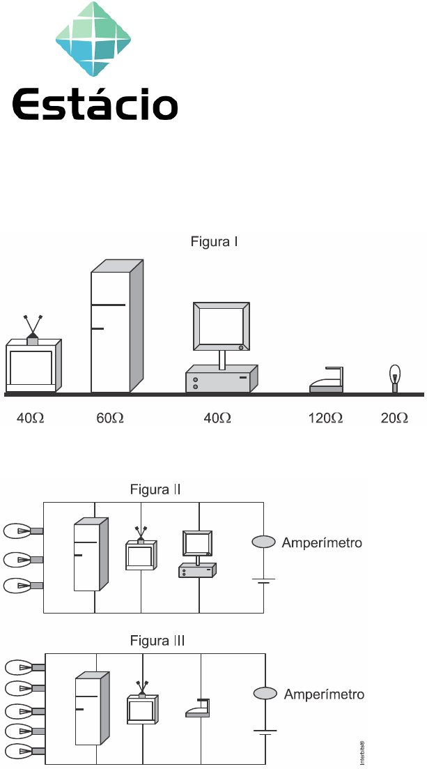 Aula remota: Eletricidade aplicada – 2020.2 Lista para av1 1. Uma residência possui dois aparelhos de TV, duas geladeiras, um computador, um ferro elétrico e oito lâmpadas incandescentes. A resistência elétrica de cada equipamento está representada pela figura I. A tensão elétrica que alimenta a rede da residência é de Um eletricista fez duas ligações, que se encontram representadas pelas figuras II e III. Com base nas informações, verifica-se que a corrente indicada pelo amperímetro da figura a) II registrará uma corrente de b) II registrará uma corrente de c) II registrará uma corrente de d) III registrará uma corrente de e) III registrará uma corrente de TEXTO PARA A PRÓXIMA QUESTÃO: Uma sala é iluminada por um circuito de lâmpadas incandescentes em paralelo. Considere os dados abaixo: − a corrente elétrica eficaz limite do fusível que protege esse circuito é igual a 10 A; − a tensão eficaz disponível é de 120 V; − sob essa tensão, cada lâmpada consome uma potência de 60 W. 2. A resistência equivalente, em ohms, de apenas 8 lâmpadas acesas é cerca de: a) 30 b) 60 c) 120 d) 240 3. Um circuito elétrico é constituído por um resistor de e outro resistor de Esse circuito é submetido a uma diferença de potencial de e a corrente que passa pelos resistores é a mesma. A intensidade desta corrente é de: a) 8 A b) 6 A c) 3 A d) 2 A e) 1 A 4. Em uma aula de laboratório o professor montou um circuito com resistores ôhmicos e associados a uma fonte de alimentação ideal conforme o circuito abaixo. E solicitou ao aluno que, usando um amperímetro ideal, medisse o valor da intensidade de corrente elétrica que flui através de O aluno, porém fez a ligação do amperímetro da maneira indicada na figura a seguir. Com base nisso, assinale a alternativa que representa o valor indicado, em ampères, no amperímetro. a) b) c) d) 5. O circuito elétrico representado no diagrama abaixo contém um gerador ideal de Volts com resistência interna desprezível alimentando cinco resistores. Qual o valor da medida da intensidade da corrente elétrica, expressa em amperes, que percorre o amperímetro conectado ao circuito elétrico representado? a) b) c) d) e) 6. O gráfico a seguir representa as intensidades das correntes elétricas que percorrem dois resistores ôhmicos R1 e R2, em função da ddp aplicada em cada um deles. Abaixo do gráfico, há o esquema de um circuito no qual R1 e R2 estão ligados em série a uma fonte ideal de 12 v. Neste circuito, a intensidade, da corrente elétrica que percorre R1 e R2 vale: a) 0,8 A b) 1,0 A c) 1,2 A d) 1,5 A e) 1,8 A 7. Um aparelho elétrico possui a indicação 110 V - 2200 W. Determine a potência dissipada por esse desse aparelho, se o mesmo for ligado a uma tensão de alimentação de 55 V. 8. Num determinado fio, submetido a uma diferença de potencial (ddp) de 220 volts, é percorrido por 120 coulombs num intervalo de tempo de 30 s. Determine : a) a corrente elétrica i que percorre o fio. b) a resistência elétrica do fio. 9. Sabe-se que a resistência elétrica de um fio cilíndrico é diretamente proporcional ao seu comprimento e inversamente proporcional à área de sua secção reta. a) O que acontece com a resistência do fio quando triplicado o seu comprimento? b) O que acontece com a resistência do fio quando duplicamos o seu raio? 10. O circuito elétrico do enfeite de uma árvore de natal é constituído de 60 lâmpadas idênticas (cada uma com 6 V de tensão de resistência de 30 ohms) e uma fonte de tensão de 6 V com potência de 18 watts que liga um conjunto de lâmpadas de cada vez, para produzir o efeito pisca-pisca. Considerando-se que as lâmpadas e a fonte funcionam de acordo com as especificações fornecidas, calcule: a) a corrente que circula através de cada lâmpada quando acesa. b) O número máximo de lâmpadas que podem ser acesas simultaneamente. 10A. 12A. 0,10A. 16,6A. 0,14A. 4 Ω 2. Ω 12V 3 12 R,R 3 R (Vt) 2 R. (A) 0,0 0,2 0,3 0,4 21 A 0,5A 1,0A 1,5A 2,0A 120V. 2,5A Aula remota : Eletricidade aplicada – 2020. 2 Lista para av1 1 . Uma residência possui dois aparelhos de TV, duas geladeiras, um computador, um ferro elétrico e oito lâmpadas incandescentes. A resistência elétrica de cada equipamento está representada pela figura I. A tensão elétrica que alimenta a rede da residência é de 120V. Um eletricista fez duas ligações, que se encontram representadas pelas figuras II e III. Com base nas informações, verifica - se que a corrente indicada pelo amperímetro da figura a) II registrará uma corrente de 10A. b) II registrará uma corrente de 12A. c) II registrará uma corrente de 0,10A. d) III registrará uma corrente de 16,6A. e) III registrará uma corrente de 0,14A. TEXTO PARA A PRÓXIMA QUESTÃO: Uma sala é iluminada por um circuito de lâmpadas incandescentes em paralelo. Considere os dados abaixo: Aula remota: Eletricidade aplicada – 2020.2 Lista para av1 1. Uma residência possui dois aparelhos de TV, duas geladeiras, um computador, um ferro elétrico e oito lâmpadas incandescentes. A resistência elétrica de cada equipamento está representada pela figura I. A tensão elétrica que alimenta a rede da residência é de 120V. Um eletricista fez duas ligações, que se encontram representadas pelas figuras II e III. Com base nas informações, verifica-se que a corrente indicada pelo amperímetro da figura a) II registrará uma corrente de 10A. b) II registrará uma corrente de 12A. c) II registrará uma corrente de 0,10A. d) III registrará uma corrente de 16,6A. e) III registrará uma corrente de 0,14A. TEXTO PARA A PRÓXIMA QUESTÃO: Uma sala é iluminada por um circuito de lâmpadas incandescentes em paralelo. Considere os dados abaixo: