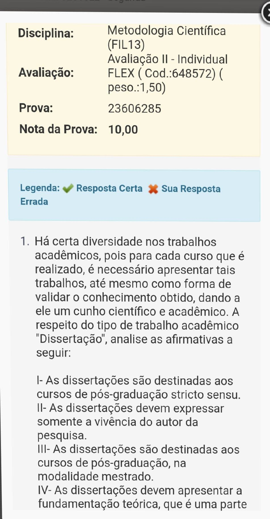 Metodologia Científica (FIL13) Avaliaçãoll - Individual FLEX (Cod.:648572) ( peso.:1,50) Disciplina: Avaliação: Prova: 23606285 Nota da Prova: 10,00 Legenda: Resposta Certa Sua Resposta Errada 1. Há certa diversidade nos trabalhos acadêmicos, pois para cada curso que é realizado, é necessário apresentar tais trabalhos, até mesmo como forma de validar o conhecimento obtido, dando a ele um cunho científico e acadêmico. A respeito do tipo de trabalho acadêmico "Dissertação', analise as afirmativas a seguir -As dissertações são destinadas aos Cursos de pós-graduação stricto sensu. I1- As dissertações devem expressar Somentea viv�ncia do autor da pesquisa. Il- As dissertações são destinadas aos cursos de pós-graduação, na modalidade mestrado. IV- As dissertações devem apresentar a fundamentação teórica, que é uma parte 1. Há certa diversidade nos trabalhos acadêmicos, pois para cada curso que é realizado, é necessário apresentar tais trabalhos, até mesmo como forma de validar o conhecimento obtido, dando a ele um cunho científico e acadêmico. A respeito do tipo de trabalho acadêmico "Dissertação', analise as afirmativass a seguir -As dissertações são destinadas aos cursos de pós-graduação stricto sensu. I1- As dissertações devem expressar somente a vivência do autor da pesquisa. l- As dissertações são destinadas aos cursos de pós-graduação, na modalidade mestrado. IV- As dissertações devem apresentar a fundamentação teórica, que é uma parte importante da pesquisa. Assinale a alternativa CORRETA: a) As afirmativas 1, Ile lll estão corretas. b) As afirmativas I, Il e IV estão corretas. c) As afirmativas I1, Ill e IV estão corretas. vd) As afirmativasI, Il e IV estão CorretasS. 2.Leia o seguinte texto: A professora Adriangela Bonetti foi designac deficiência e transtorno global de desenvolvi 2.Leia o seguinte texto: A professora Adriangela Bonetti foi designac deficiência e transtorno global de desenvolvi projeto coletivo para lidar com esses estuda foco na aceleração dos alunos ea APAE do i políticas de educação especial na perspecti Educação implantava um Sistema de Gestãc que sofria pressão do Ministerio Publico par ferramentas que conheceu em um curso, Ad esforço Ihe valeu um prêmio nacional e um c do municipio. Essa mudança trouxe uma sér escola: Como transformar sua visão de educ que os alunos com deficiência continuassen parcerias, por vezes conflituosas, com a AP este estudo tem como objeto principal a pro escola Alexandre Bacchi e no município de ( pesquisa empregado nesta investigação ec FONTE: Adaptado de: GALERY, Augusto; ALC Guaporé, RS. Disponível em: <http://www.diversa.org.br/.../o_caso_escol Acesso em: 20 ago. 2016. a) A pesquisa segue o método Comparativo. b) A pesquisa segue o método histórico. c) A pesquisa segue o modelo de senso comum. d) A pesquisa elaborada segue o método Estudo de Caso. 3. "A ciência é todo um conjunto de atitudes racionais, que podem ser dirigidas ao conhecimento com objetivo limitadn a ciotamátinn rana7 da car 3. "A ciência é todo um conjunto de atitudes racionais, que podem ser dirigidas ao conhecimento com objetivo limitado e sistemático, capaz de ser submetido à verificação de outros autores, pesquisadores da área. Assim, a ciencia é um conjunto de conhecimentos racionais que são obtidosS metodicamente, passiveis de serem verificaveis, e que fazem referëncia a objetos de uma mesma natureza" (LAKATOS; MARCONI, 1992, p. 45). Ao apresentar sua definição de Ciência, os autores deixam implicito queo conhecimento científico se constitui como uma das modalidades daquilo que se denomina de Conhecimento Humano, havendo outras modalidades e perspectivas. Levando em consideração a breve afirmaçao das autoras e os conhecimentos construídos com a disciplina de Metodologia Cientifica, analise as sentenças a seguir -É inerente ao homem a busca pelo conhecimento. Desde a Antiguidade, o homem procura entender a natureza ea si mesmo, num processo de autorrealização, e, para isso, descobre e constrói respostas para suas indagações. I1- A ciência é derivada da característica humana da inquietude, de sua necessidade de transcender-se, ir além de ci a doc oonherimantne aue lha eãn UITuuTILU. veouta Auyuiuaut,u homem procura entender a natureza ea SI mesm0, num processo de autorrealização, e, para isso, descobree Constroi respostas para suas indagações. I-A ciência é derivada da característica humana da inquietude, de sua necessidade de transcender-se, ir além de si e dos conhecimentos que Ihe são oferecidos. II1-O ato de pesquisar é de exclusividade de cientistas e laboratoristas porque somente as ciências conhecidas comno experimentais são capazes de produzir conhecimento válido. IV-Na educação brasileira, é possÍvel verificar uma dissociação entre teoria e prática, revelando que o ato de pesquisar ainda épouco desenvolvido nas instituições de ensino. Assinale a alternativa CORRETA: FONTE: LAKATOS, Eva Maria; MARCONI, Marina de Andrade. Metodologia do trabalho científico. São Paulo: Atlas, 1992. a) As sentenças 1, Il e V estão corretas. b) As sentenças I, |Ie l estão corretas. c) As sentenças Il, Ill e IV estão corretas. d) Somente a sentença lll está correta. 4. Com relação à estrutura geral do trabalho acadèmico, podemos destacar 4. Com relação à estrutura geral do trabalho acadêmico, podemos destacar a "introdução"'. Nesta parte é necessário restringir o conteúdo; comentar os objetivos da pesquisa e apresentar aspectos da metodologia utilizada. Com relação a outros aspectos da introdução, classifique V para as sentenças verdadeiras e F para as falsas: )0 objetivo principal da introdução é apresentar logo os resultados e aplicações práticas da pesquisa. Além da apresentação geral do tema, a introdução deve apresentar a estrutura geral do trabalho. A introdução de um trabalho