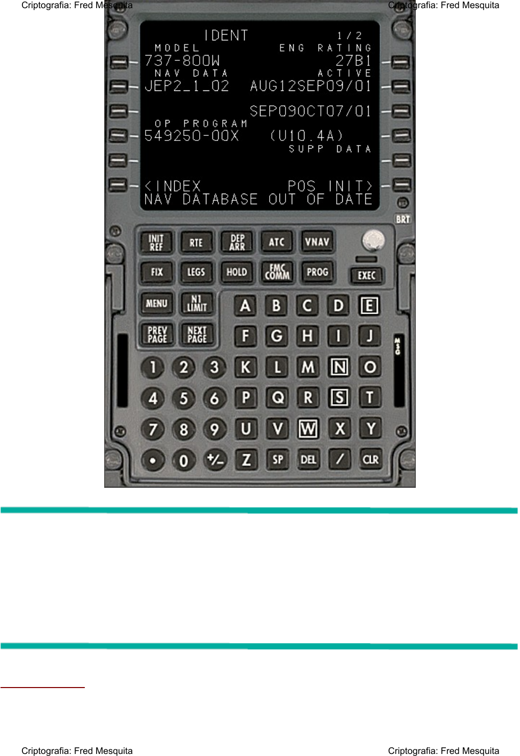 Produzido por: Fred Mesquita – fredfvm@gmail.com 1 Manual FMC Flight Management Computer Nota da Tradução: Este arquivo foi ext raído do manual original do Boeing 737-500 NG, parte integrante do estudo e uso do FMC da referida aeronave. Alguns termos foram mant idos em inglês por se t ratarem da operação normal do FMC. Outros tiveram que ser adaptados para criar sentido ao texto. Criptografia: Fred Mesquita Criptografia: Fred Mesquita Criptografia: Fred Mesquita Criptografia: Fred Mesquita Produzido por: Fred Mesquita – fredfvm@gmail.com 2 ÍNDICE Capítulo 1 - DESCRIÇÃO DO FMC Página Descrição . . . . . . . . . . . . . . . . . . . . . . . . . . . . . . . . . . . . . . . . . . . . . . . . . . . . . . . . . . . . . . . . . 05 O Teclado do FMC . . . . . . . . . . . . . . . . . . . . . . . . . . . . . . . . . . . . . . . . . . . . . . . . . . . . . . . . . 05 Função INIT REF . . . . . . . . . . . . . . . . . . . . . . . . . . . . . . . . . . . . . . . . . . . . . . . . . . . . . . . . . . 06 Função RTE . . . . . . . . . . . . . . . . . . . . . . . . . . . . . . . . . . . . . . . . . . . . . . . . . . . . . . . . . . . . . . 06 Função DEP ARR . . . . . . . . . . . . . . . . . . . . . . . . . . . . . . . . . . . . . . . . . . . . . . . . . . . . . . . . . . 06 Função VNAV . . . . . . . . . . . . . . . . . . . . . . . . . . . . . . . . . . . . . . . . . . . . . . . . . . . . . . . . . . . . 06 Função LEGS . . . . . . . . . . . . . . . . . . . . . . . . . . . . . . . . . . . . . . . . . . . . . . . . . . . . . . . . . . . . . 06 Função HOLD . . . . . . . . . . . . . . . . . . . . . . . . . . . . . . . . . . . . . . . . . . . . . . . . . . . . . . . . . . . . . 06 Função PROG . . . . . . . . . . . . . . . . . . . . . . . . . . . . . . . . . . . . . . . . . . . . . . . . . . . . . . . . . . . . 07 Função EXEC . . . . . . . . . . . . . . . . . . . . . . . . . . . . . . . . . . . . . . . . . . . . . . . . . . . . . . . . . . . . 07 Função MENU . . . . . . . . . . . . . . . . . . . . . . . . . . . . . . . . . . . . . . . . . . . . . . . . . . . . . . . . . . . . 07 Função NAV RAD . . . . . . . . . . . . . . . . . . . . . . . . . . . . . . . . . . . . . . . . . . . . . . . . . . . . . . . . . . 07 Função PREV/NEXT PAGE . . . . . . . . . . . . . . . . . . . . . . . . . . . . . . . . . . . . . . . . . . . . . . . . . . 07 Capítulo 2 – PROGRAMANDO O FMC Página Página POS INIT . . . . . . . . . . . . . . . . . . . . . . . . . . . . . . . . . . . . . . . . . . . . . . . . . . . . . . . . . . 08 Página ROUTE . . . . . . . . . . . . . . . . . . . . . . . . . . . . . . . . . . . . . . . . . . . . . . . . . . . . . . . . . . . 12 Programação Manual de Rotas . . . . . . . . . . . . . . . . . . . . . . . . . . . . . . . . . . . . . . . . . . . . . . . 13 Programação Avançada de Rotas no FMC . . . . . . . . . . . . . . . . . . . . . . . . . . . . . . . . . . . . . . 15 Ativação da Rota . . . . . . . . . . . . . . . . . . . . . . . . . . . . . . . . . . . . . . . . . . . . . . . . . . . . . . . . . . 18 Exemplo de Rota Entre SBRF e SBBR . . . . . . . . . . . . . . . . . . . . . . . . . . . . . . . . . . . . . . . . 19 Página PERF INIT . . . . . . . . . . . . . . . . . . . . . . . . . . . . . . . . . . . . . . . . . . . . . . . . . . . . . . . . 20 GR WT . . . . . . . . . . . . . . . . . . . . . . . . . . . . . . . . . . . . . . . . . . . . . . . . . . . . . . . . . . . . . . . . . . 20 FUEL . . . . . . . . . . . . . . . . . . . . . . . . . . . . . . . . . . . . . . . . . . . . . . . . . . . . . . . . . . . . . . . . . . . 20 ZFW . . . . . . . . . . . . . . . . . . . . . . . . . . . . . . . . . . . . . . . . . . . . . . . . . . . . . . . . . . . . . . . . . . . . 20 RESERVES . . . . . . . . . . . . . . . . . . . . . . . . . . . . . . . . . . . . . . . . . . . . . . . . . . . . . . . . . . . . . . 20 CRZ ALT . . . . . . . . . . . . . . . . . . . . . . . . . . . . . . . . . . . . . . . . . . . . . . . . . . . . . . . . . . . . . . . . . 20 STEP SIZE . . . . . . . . . . . . . . . . . . . . . . . . . . . . . . . . . . . . . . . . . . . . . . . . . . . . . . . . . . . . . . 20 COST INDEX . . . . . . . . . . . . . . . . . . . . . . . . . . . . . . . . . . . . . . . . . . . . . . . . . . . . . . . . . . . . 20 Página TAKEOFF . . . . . . . . . . . . . . . . . . . . . . . . . . . . . . . . . . . . . . . . . . . . . . . . . . . . . . . . . . 21 Página APROXIMAÇÃO . . . . . . . . . . . . . . . . . . . . . . . . . . . . . . . . . . . . . . . . . . . . . . . . . . . . 22 Capítulo 3 – OPERAÇÃO DO FMC Página Gerenciamento da Rota . . . . . . . . . . . . . . . . . . . . . . . . . . . . . . . . . . . . . . . . . . . . . . . . . . . . 23 Página LEGS . . . . . . . . . . . . . . . . . . . . . . . . . . . . . . . . . . . . . . . . . . . . . . . . . . . . . . . . . . . . Criptografia: Fred Mesquita Criptografia: Fred Mesquita Criptografia: Fred Mesquita Criptografia: Fred Mesquita Produzido por: Fred Mesquita – fredfvm@gmail.com 3 Gerenciamento da Página LEGS . . . . . . . . . . . . . . . . . . . . . . . . . . . . . . . . . . . . . . . . . . . . . . Voando Direto a um Waypoint . . . . . . . . . . . . . . . . . . . . . . . . . . . . . . . . . . . . . . . . . . . . . . . . Interceptação Direta de Curso . . . . . . . . . . . . . . . . . . . . . . . . . . . . . . . . . . . . . . . . . . . . . . . . Waypoint: Local Específico/Radial/Distância . . . . . . . . . . . . . . . . . . . . . . . . . . . . . . . . . . . . Descontinuidade de Rotas . . . . . . . . . . . . . . . . . . . . . . . . . . . . . . . . . . . . . . . . . . . . . . . . . . . Inserindo um Novo Waypoint . . . . . . . . . . . . . . . . . . . . . . . . . . . . . . . . . . . . . . . . . . . . . . . . Waypoint ao Longo da Rota . . . . . . . . . . . . . . . . . . . . . . . . . . . . . . . . . . . . . . . . . . . . . . . . . . Removendo Waypoints . . . . . . . . . . . . . . . . . . . . . . . . . . . . . . . . . . . . 